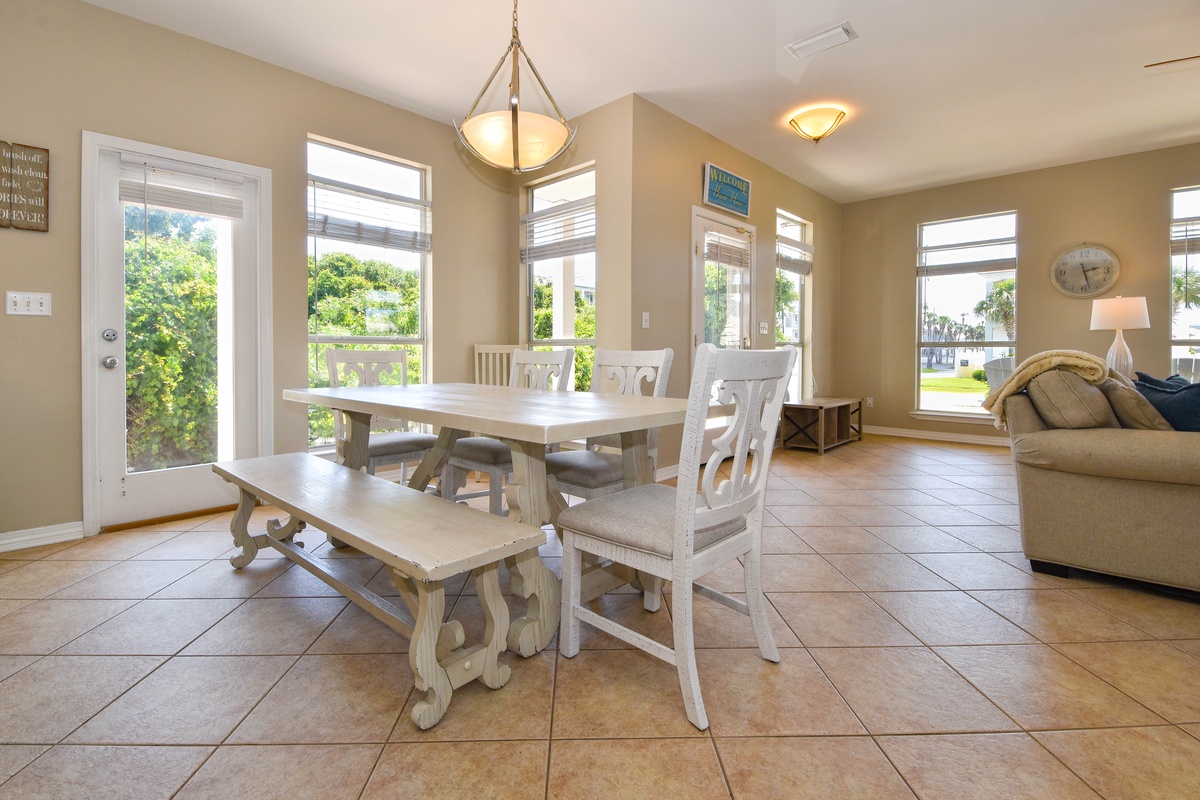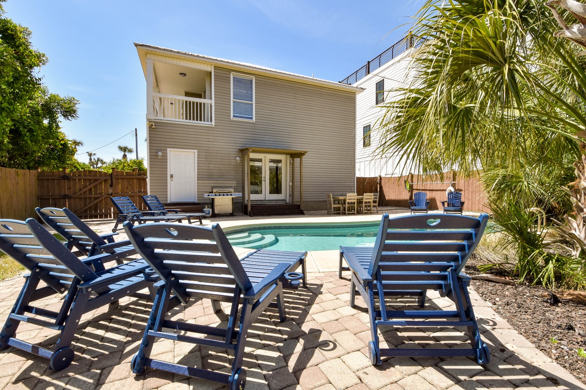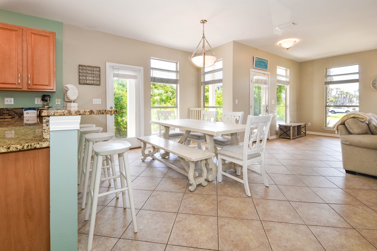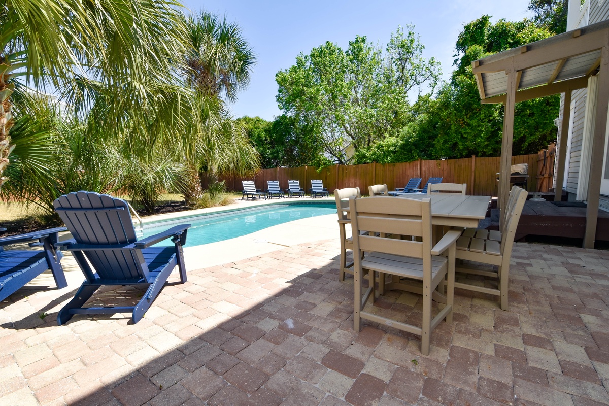 Welcome to A Wave From It All. This beautiful four-bedroom, 3.5-bath home has an open concept layout with a coastal farmhouse feel to sleep up to 16 guests. Relax in the spacious living room with a flat screen TV after a full day in the sun, a perfect space for a game night. A beautiful kitchen features stainless steel appliances and granite countertops. Gather around the dining table that seats six with additional seating available for four guests at the bar after a delectable meal is served in the kitchen. When you aren’t spending time at the beach, venture outdoors to the private backyard with a private pool, green space, grill, and dining table. The first floor features a king bedroom, flat screen TV, and attached bathroom with walk-in shower. Completing this floor is a sleeper sofa in the living room, half bathroom, and a washer and dryer.
