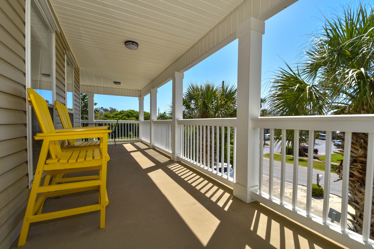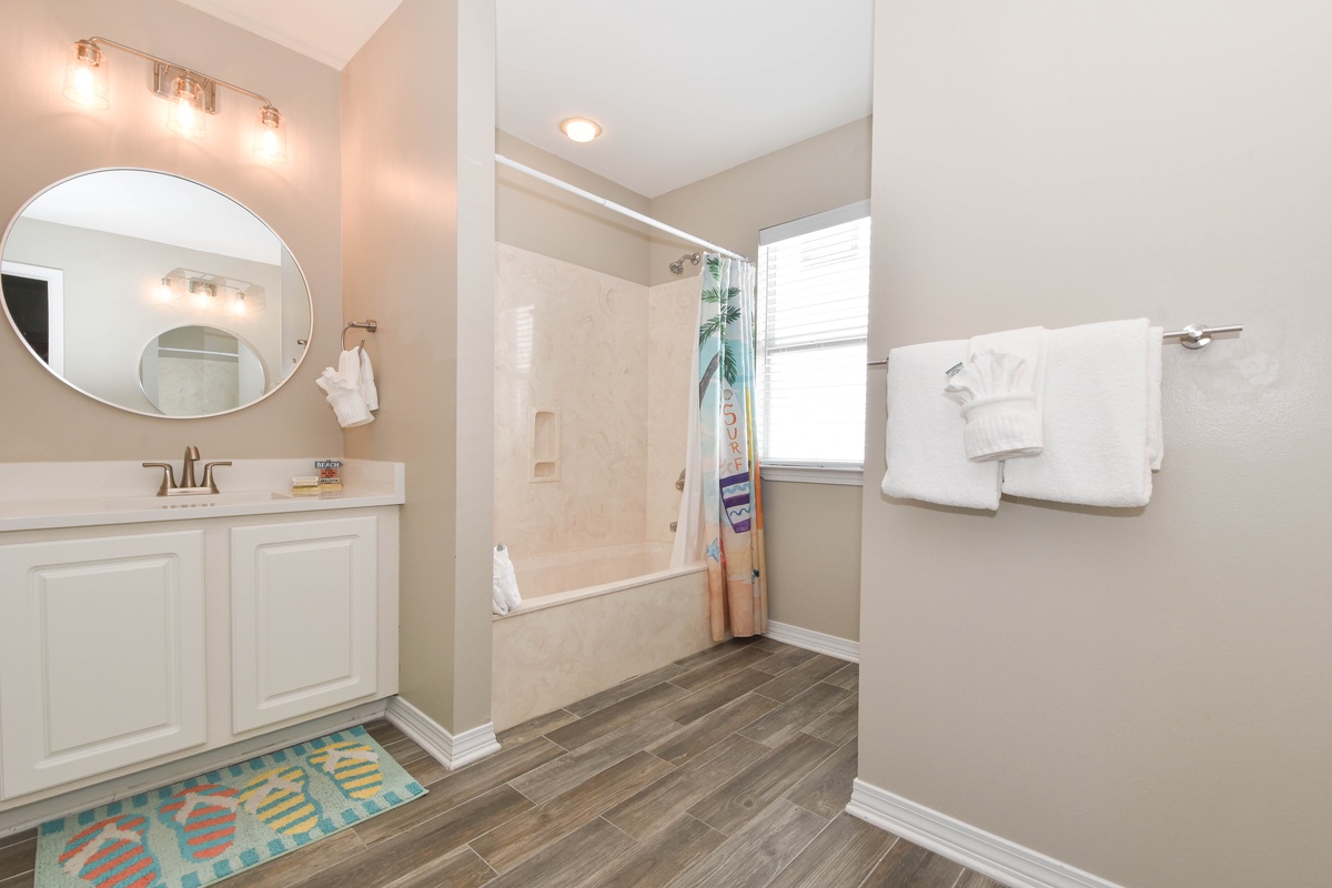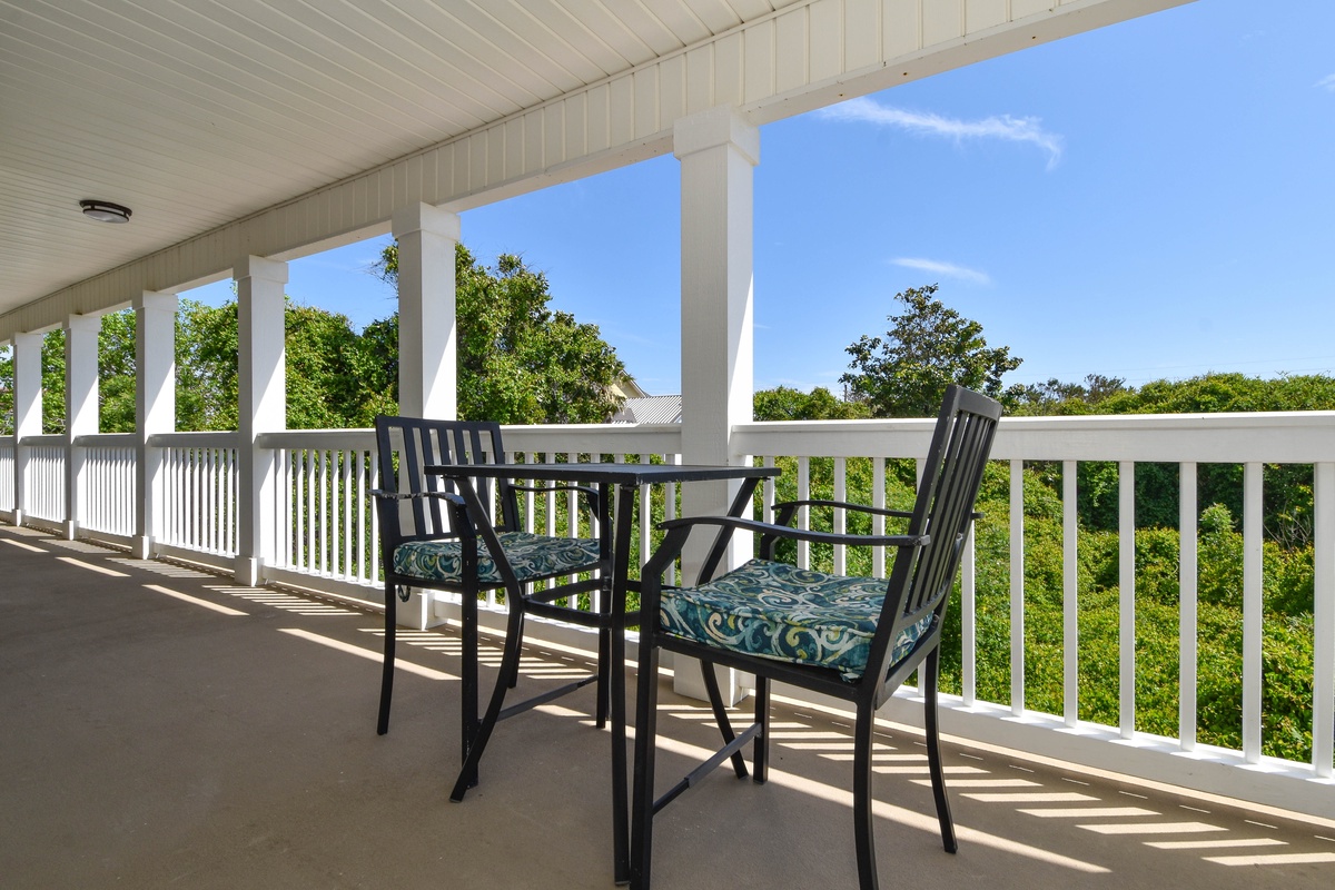 The second floor hosts three bedrooms and a wrap-around balcony. The beautiful master bedroom features a king bed, sitting area with sleeper sofa and flat screen TV, balcony access, and an attached bathroom. The incredible spa-like bathroom offers a double vanity, freestanding tub and gorgeous tiled walk-in shower. The first guest bedroom on this floor includes a queen bed and flat screen TV, while the other guest bedroom offers two twin bunk beds with trundles, flat screen TV, and access to the balcony. A hallway bathroom is shared between the guest bedrooms and has a tub/shower combo.