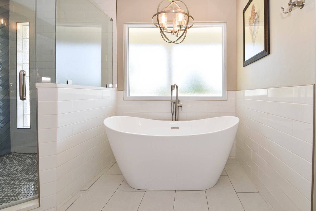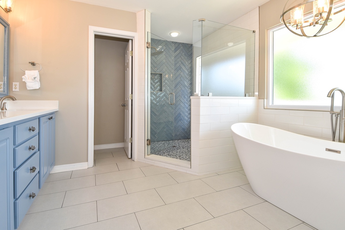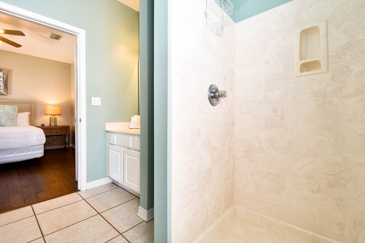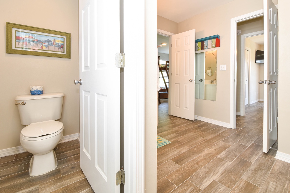 The second floor hosts three bedrooms and a wrap-around balcony. The beautiful master bedroom features a king bed, sitting area with sleeper sofa and flat screen TV, balcony access, and an attached bathroom. The incredible spa-like bathroom offers a double vanity, freestanding tub and gorgeous tiled walk-in shower. The first guest bedroom on this floor includes a queen bed and flat screen TV, while the other guest bedroom offers two twin bunk beds with trundles, flat screen TV, and access to the balcony. A hallway bathroom is shared between the guest bedrooms and has a tub/shower combo.