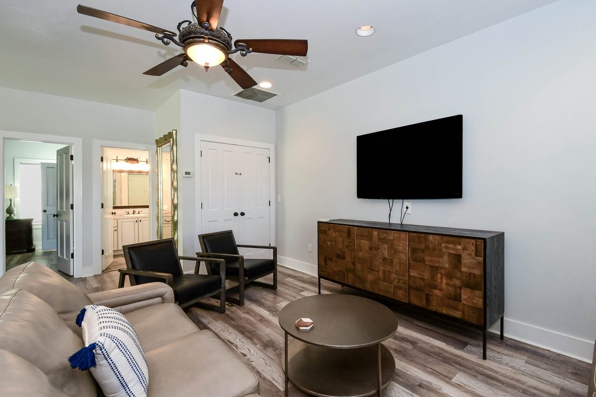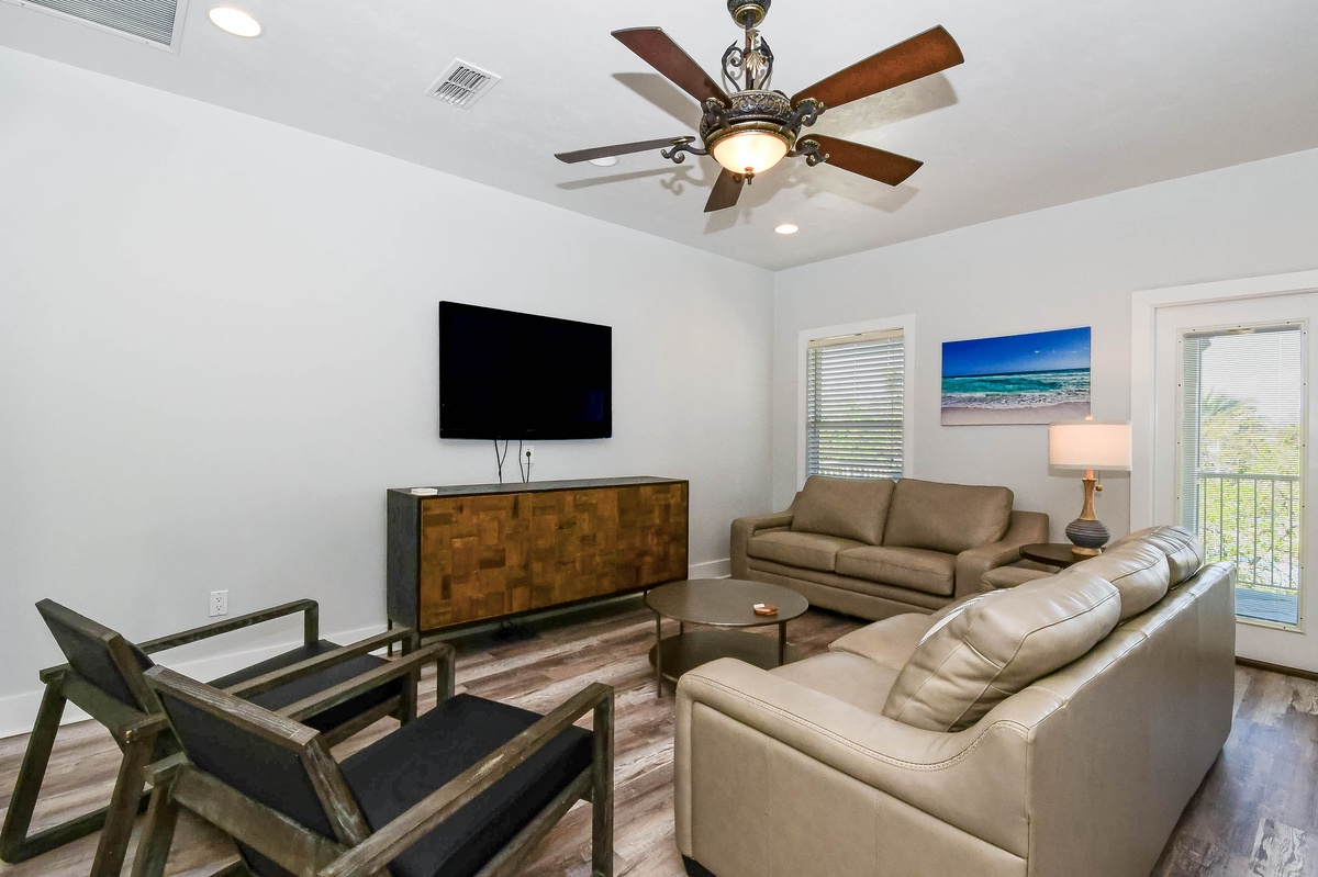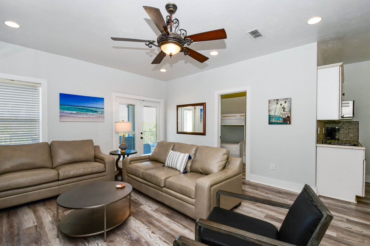 The third floor includes another living room with ample seating with a sleeper sofa, flat screen TV, coffee station with a microwave and mini fridge, balcony, and bunk room. The bunk room features a twin over full bunk bed with trundle. Sleeping up to 16 guests there is enough space for everyone to spread out.