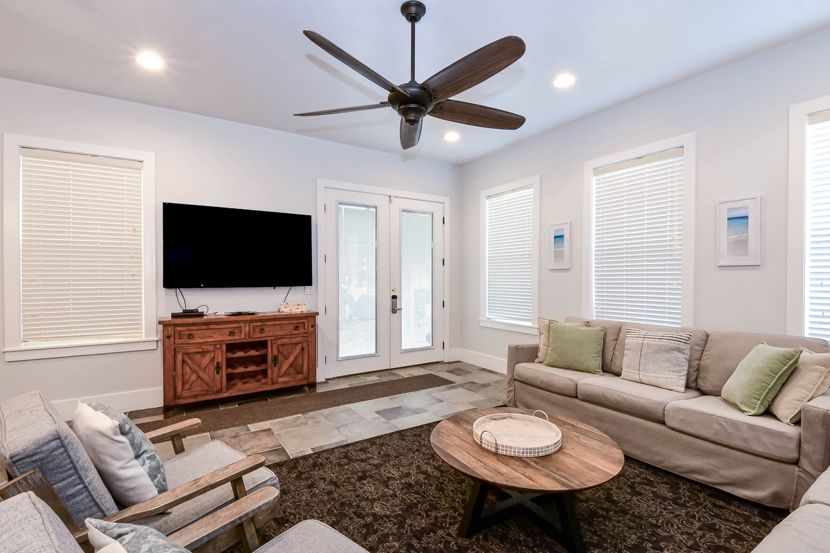Welcome to Crystal Gold. This coastal inspired five-bedroom four-bathroom home overlooks the neighborhood's 30,000 square foot lagoon swimming pool. An open-concept living area welcomes you to the home with comfortable seating and a flat screen TV. The dining area off of the kitchen seats eight, with additional seating for four at the breakfast bar. The chef won’t miss a conversation while whipping up a delicious meal in the kitchen. Located off the kitchen is a guest bedroom with a king bed and a hall bath with tub/shower combo.