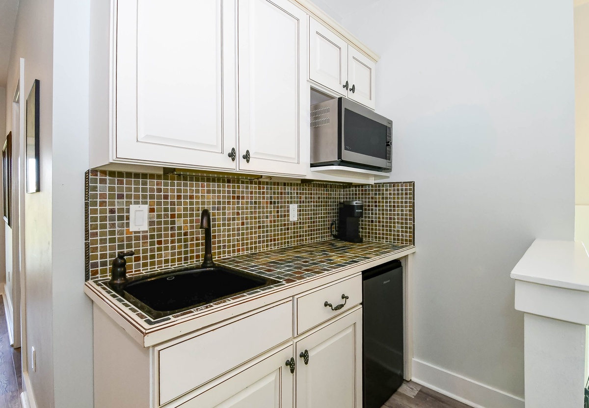 Up the stairs to the second floor is the master bedroom with a king bed, flat screen TV, coffee station with a microwave and mini fridge, and balcony access facing the community pool. A spacious attached bathroom offers double vanities, soaker tub, and walk-in shower. An additional bedroom offers a queen bed and a twin bunk bed, plus an attached bath with a tub/shower combo.