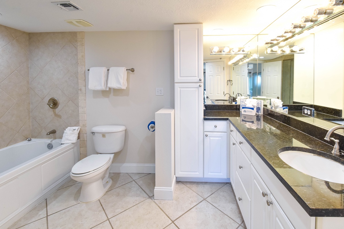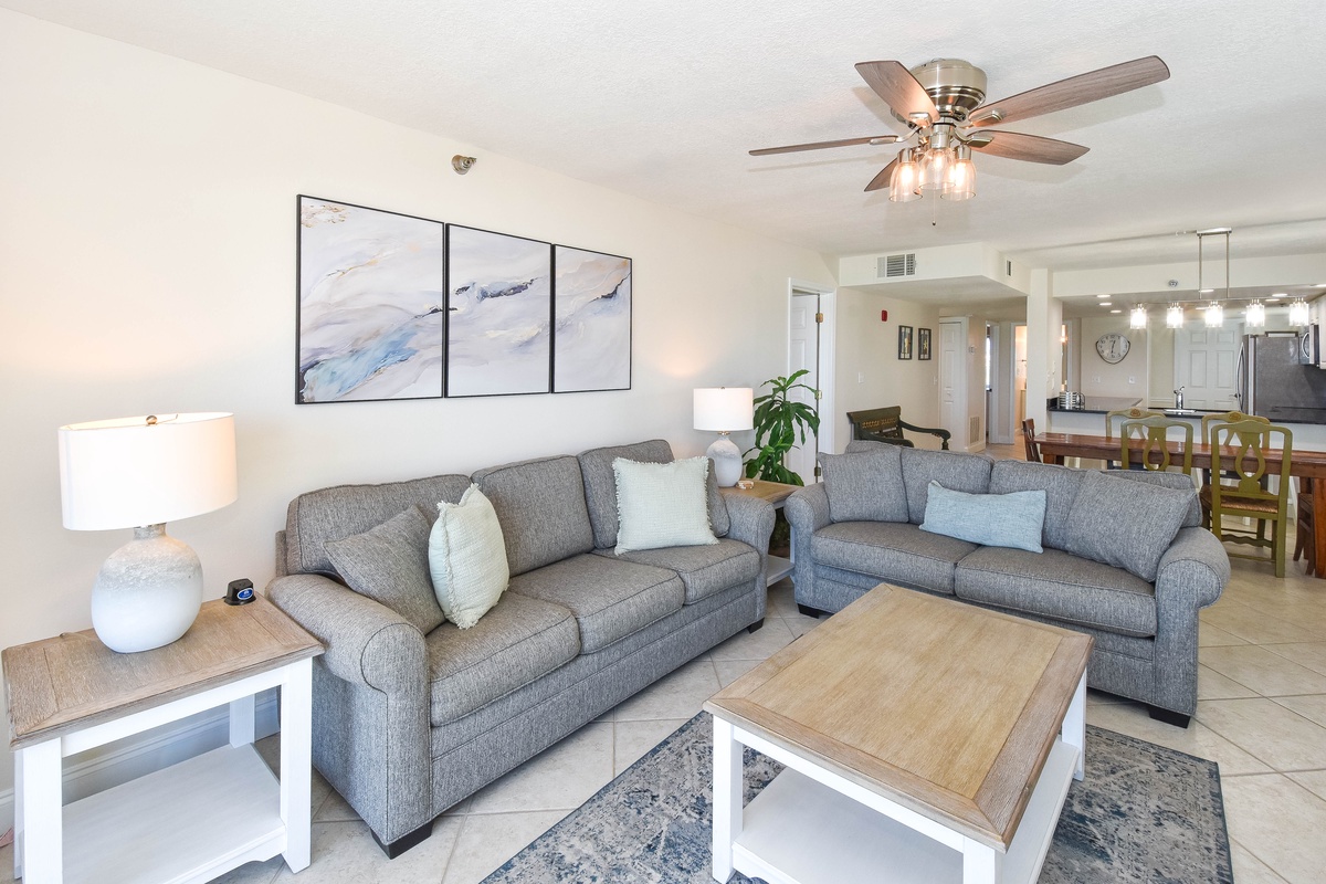 Welcome to Destin Towers 41, a beautifully renovated 2-bedroom, 2-bathroom condo on the fourth floor of an exclusive, gated beachfront community. This coastal retreat offers panoramic views of the emerald-green Gulf and sugar-white sands. Whether you're sipping coffee on the private balcony or unwinding to the sound of the waves, every moment feels like a true escape. Located in a low-density building with just three units per floor, Destin Towers 41 offers a peaceful, uncrowded atmosphere. Guests enjoy resort-style amenities including a Gulf-front pool, hot tub, private beach access just steps from the pool, tennis courts, community grills, and secure garage parking. Inside, the open-concept layout seamlessly connects the living room, dining area, and kitchen - ideal for family meals, games, or relaxing together. The living room features plush seating, a flat-screen TV, and a queen sleeper sofa for additional guests. Floor-to-ceiling windows and sliding glass doors fill the space with natural light and lead to a spacious balcony with sweeping Gulf views. The dining area seats six, with additional space in a cozy breakfast nook. The fully stocked kitchen is outfitted with stainless steel appliances, granite countertops, and all the cookware and dishware you need for everything from casual breakfasts to full dinners. The primary bedroom is a serene retreat with a king-size bed, flat-screen TV, generous closet, and direct access to the balcony. The en suite bathroom includes a granite double vanity, soaking tub, and walk-in tiled shower. The guest bedroom features two full-size beds, a flat-screen TV, and ample storage, with a full bathroom just steps away, complete with a tub/shower combo. For added convenience, this condo is thoughtfully furnished with a washer and dryer and includes two backpack beach chairs. Reserve your perfect Destin beach vacation rental today at Destin Towers 41.