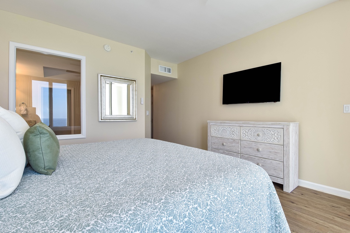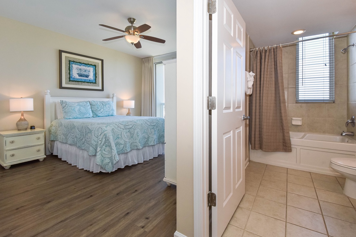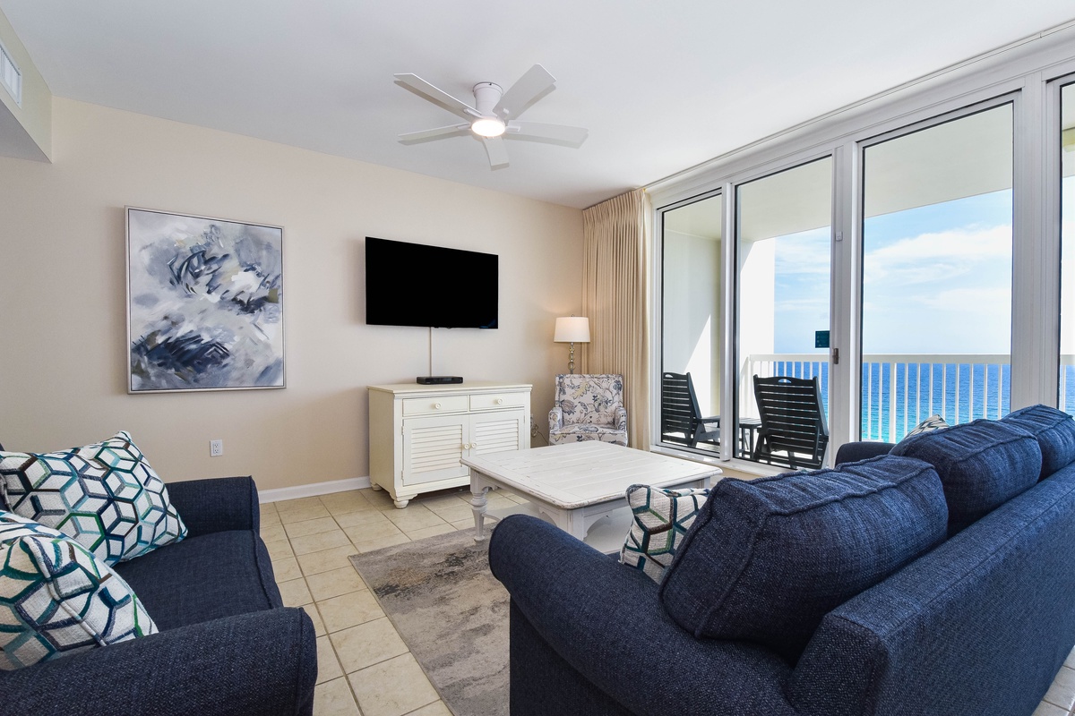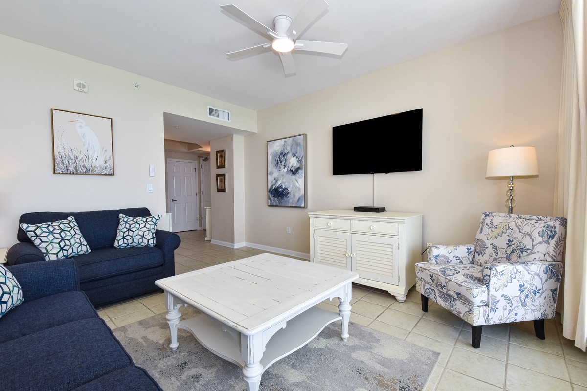 Welcome to Silver Beach Towers West 1603, a comfortable three-bedroom, three-bathroom beachfront condo located on the 16th floor, offering stunning views of the Gulf. This vacation rental features a spacious open-concept living area with floor-to-ceiling windows, a large flat-screen TV, and a fully equipped kitchen with full-size appliances, cookware, and dishware. Step out onto the furnished beachfront balcony to relax and take in the sea breeze. The primary suite includes a king bed, walk-in closet, private balcony access, and an en-suite bathroom with a soaking tub, tiled walk-in shower, and double vanity. One guest bedroom offers a queen bed, flat-screen TV, and a private bathroom with a tub and shower combination. The second guest bedroom also has a queen bed and flat-screen TV, with a full bathroom and walk-in shower just steps away. For added convenience, the condo includes complimentary Wi-Fi, an in-unit washer and dryer, and additional sleeping accommodations with a queen sleeper sofa in the living area. While staying in this unit, you'll also enjoy access to resort amenities including two beachfront pools, hot tubs, tennis courts, and direct beach access, with seasonal beach service available at a discounted daily rate. Silver Beach Towers West 1603 provides everything you need for a wonderful beach getaway!
