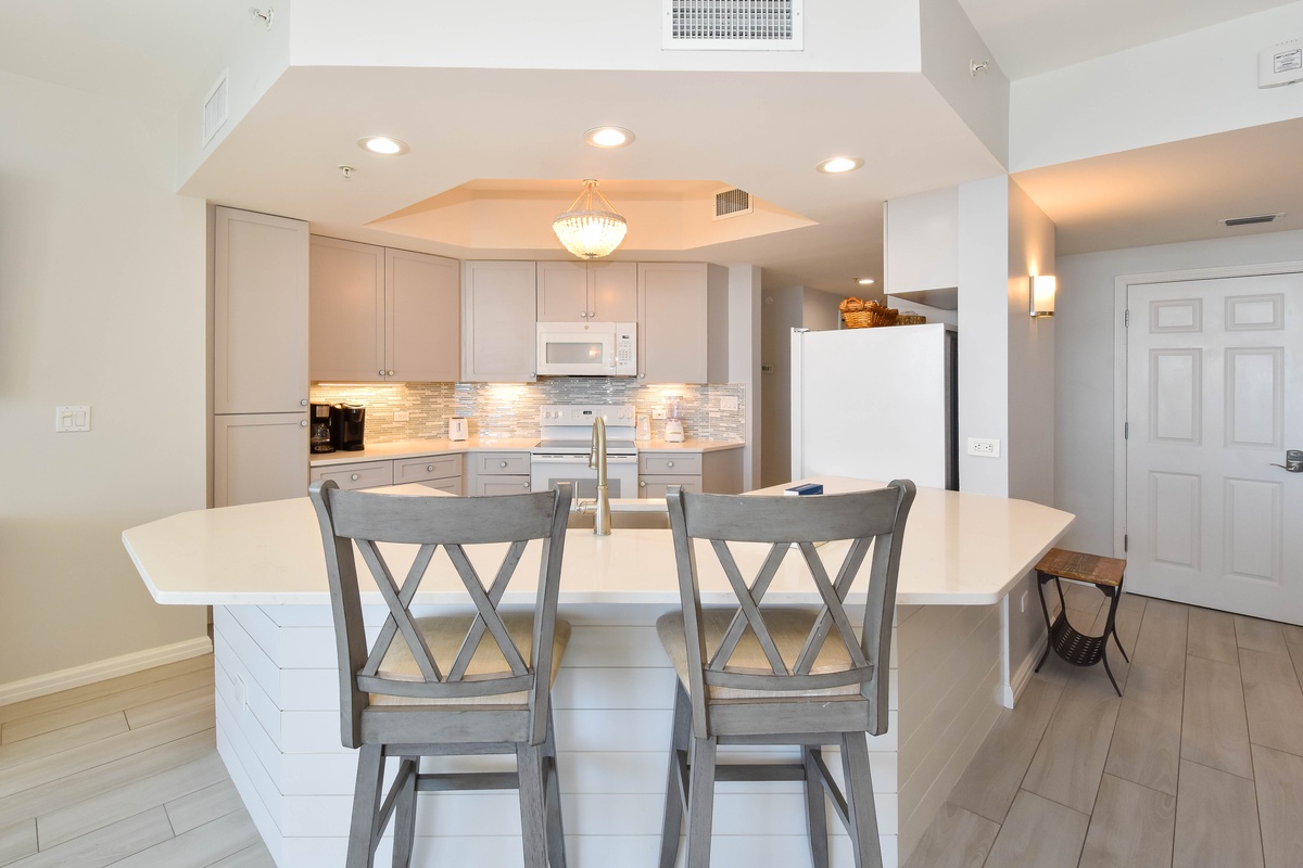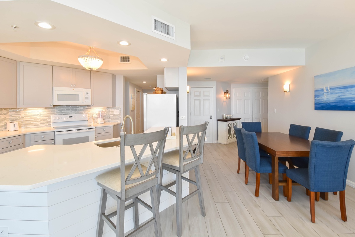 The interior spaces of Silver Shells St. Croix 503 have been tastefully decorated with a trendy beach theme with tile throughout. An open floor plan gives the whole family or group space to relax together. The living area is beach-facing, features floor-to-ceiling windows and sliding glass doors, and offers seating for everyone to gather around the flat-screen TV. The couch even converts to a queen sleeper sofa for larger parties. The spacious beachfront balcony is perfectly furnished to allow for entertaining or dining while taking in spectacular views of the white sand beach and emerald waters. The dining area has seating for six with an additional two seats at the breakfast bar. The fully equipped kitchen includes full-size appliances, a tile backsplash, and all the cookware and dishware you could need for creating memorable meals. The laundry closet is in the main hallway complete with a full-size washer and dryer.
