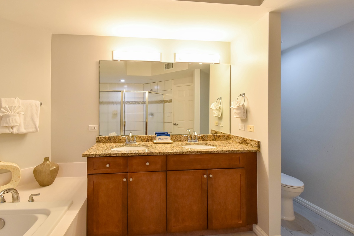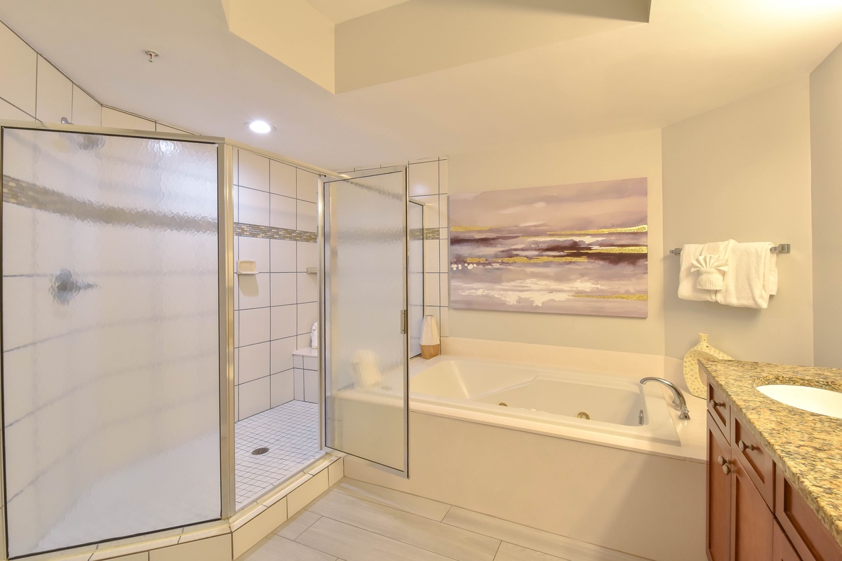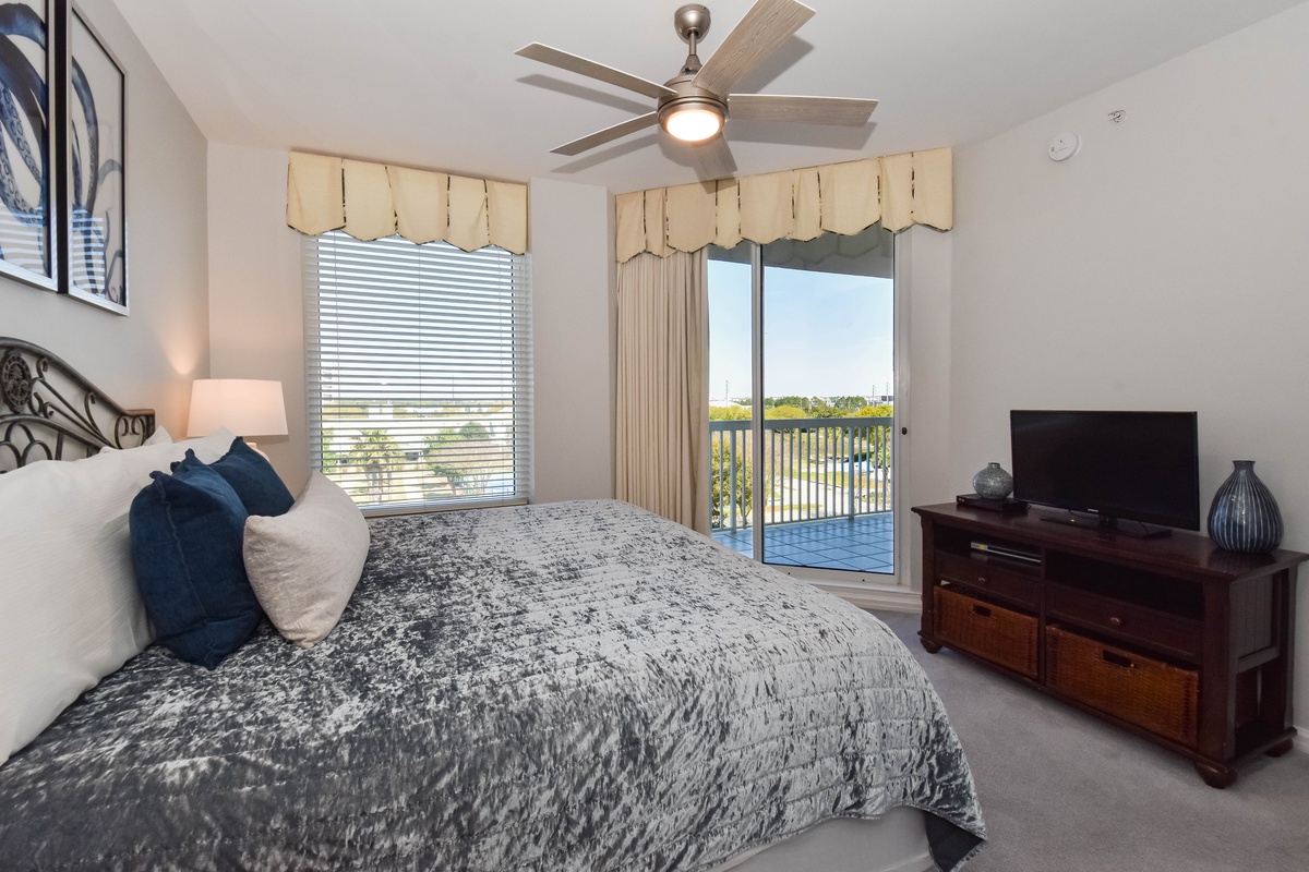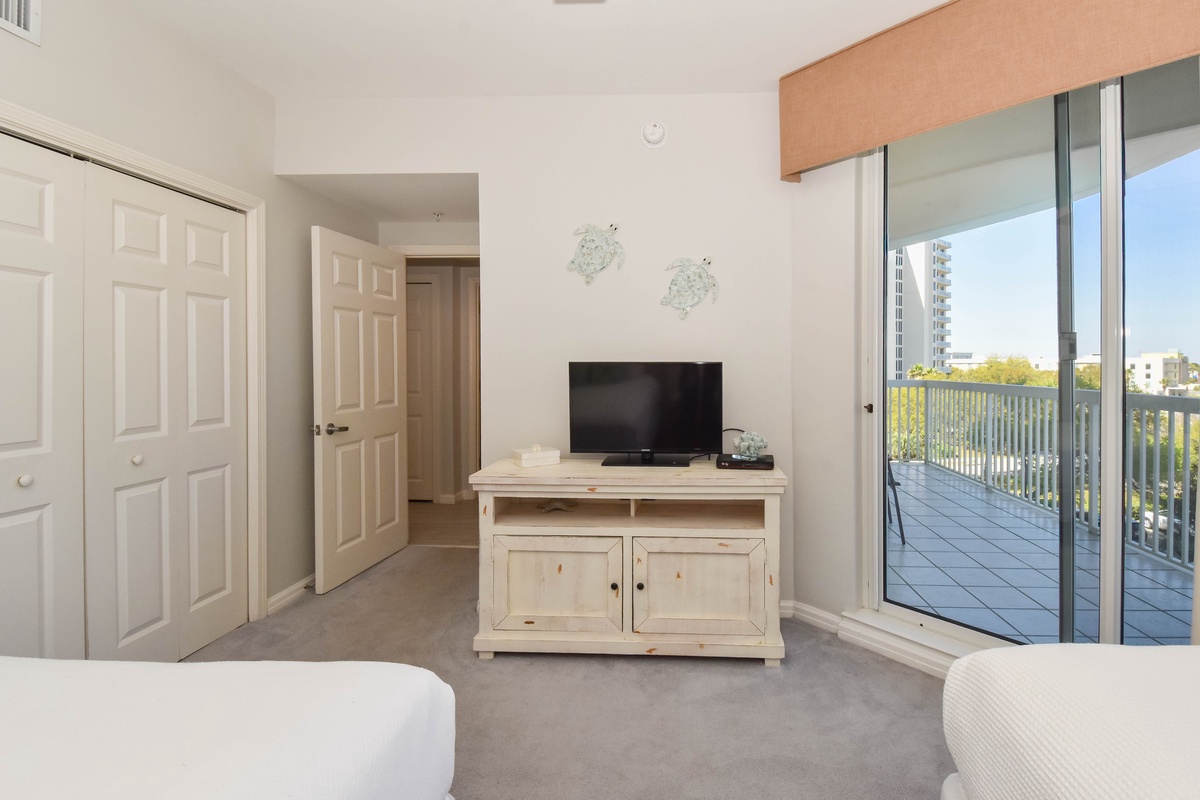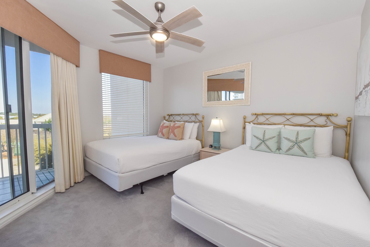 The master bedroom has incredible beach views and private access to the beachfront balcony. Complete with a king bed, walk-in closet, flat-screen TV, and private ensuite bathroom, the master bedroom was designed with relaxation in mind. The master bathroom features a jetted tub, tiled walk-in shower with a built-in bench, and plenty of vanity space. Both guest bedrooms face the north side of the resort and offer unbeatable views of the resort grounds. The first guest bedroom has a king bed, a TV, and private access to the north balcony. The second guest bedroom has two queen beds, a TV, and private access to the north balcony. Just a few steps from the first guest bedroom, the second guest bedroom, and the living area is a full bathroom with a walk-in shower.