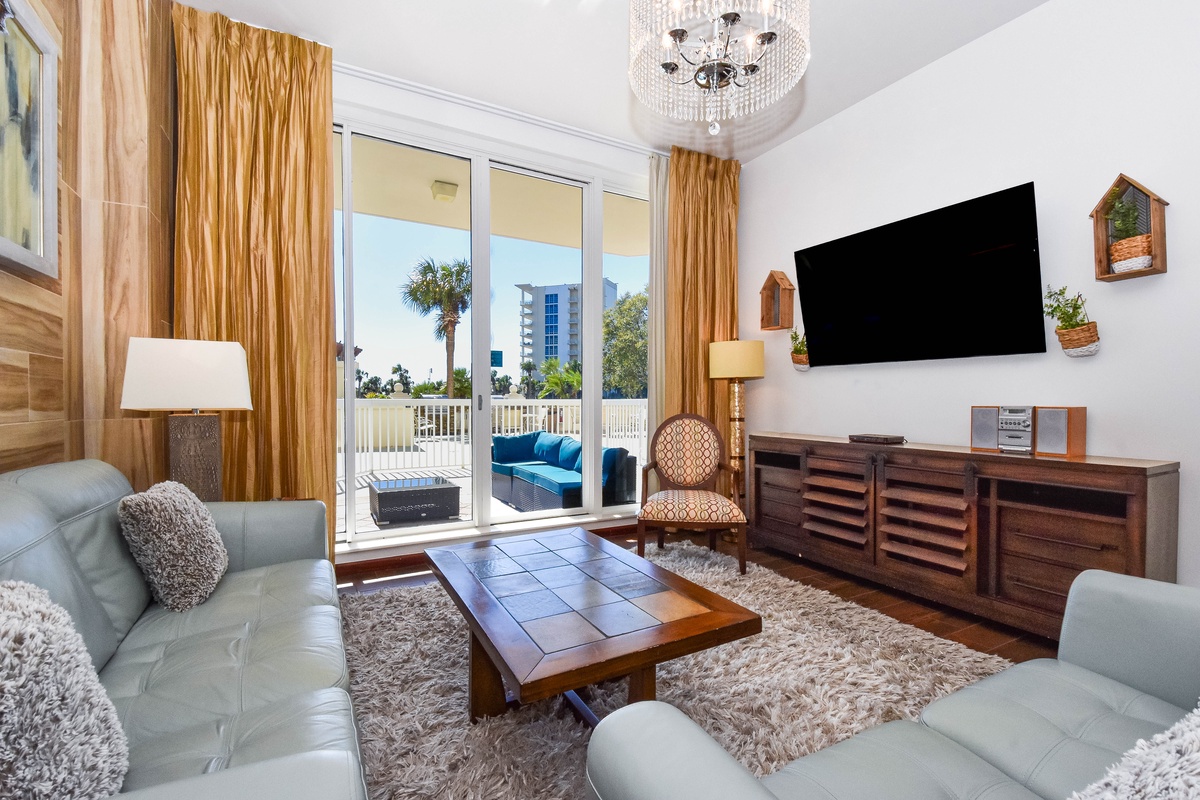 Welcome to Silver Shells St. Lucia 204! This lobby-level, one-bedroom, one-and-a-half-bathroom condo offers relaxing views and convenient access within the highly desirable Silver Shells Beach Resort. Designed for comfort and easy coastal living, this inviting retreat is the perfect choice for your next Destin beach vacation. Guests also enjoy private beach access and access to the St. Lucia building’s private pool. Step inside to a bright, open living space with tasteful coastal décor. The beach-facing living room offers comfortable seating, a flat-screen TV, and floor-to-ceiling windows with sliding glass doors that lead to the beach-facing patio. The spacious patio is beautifully furnished and provides an ideal spot to relax or dine while taking in the views. The fully equipped kitchen features full-size appliances and ample counter space, along with all the dishware needed to prepare meals during your stay. Enjoy meals at the dining table with seating for four, with an additional seat available at the breakfast bar. The primary bedroom features a king bed, a flat-screen TV, and private access to the beach-facing patio. This bedroom includes a private en-suite bathroom with a walk-in shower and plenty of vanity space. A convenient half bathroom is located just steps from the living area. For added convenience, this condo includes complimentary Wi-Fi, an in-unit washer and dryer, and seasonal complimentary beach service. Come create lasting memories at Silver Shells St. Lucia 204 on your next Destin, Florida vacation.