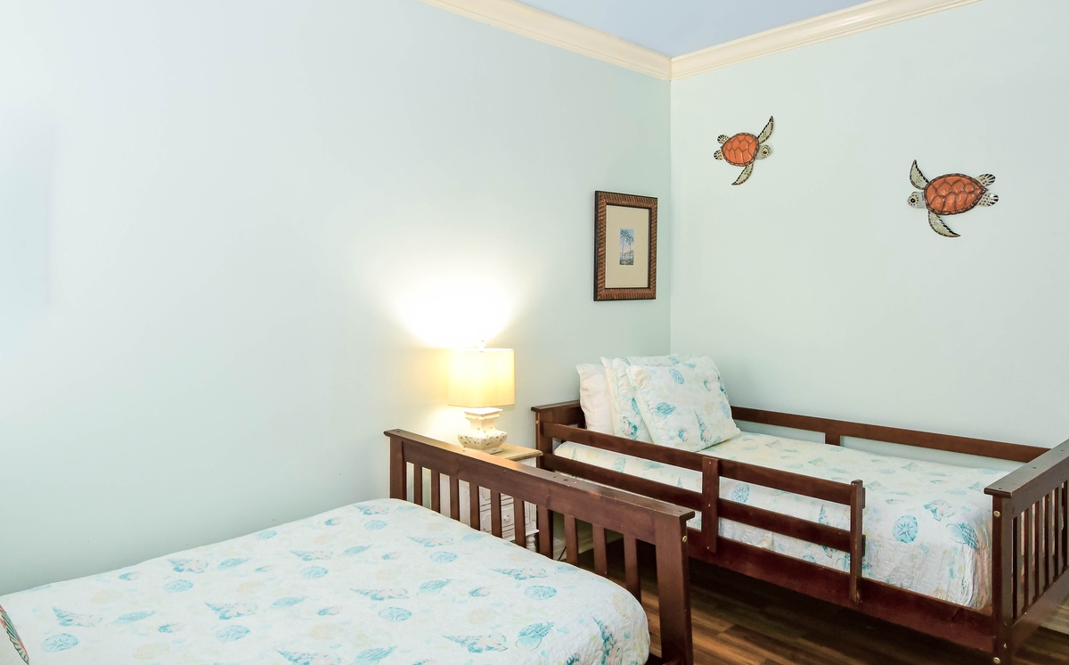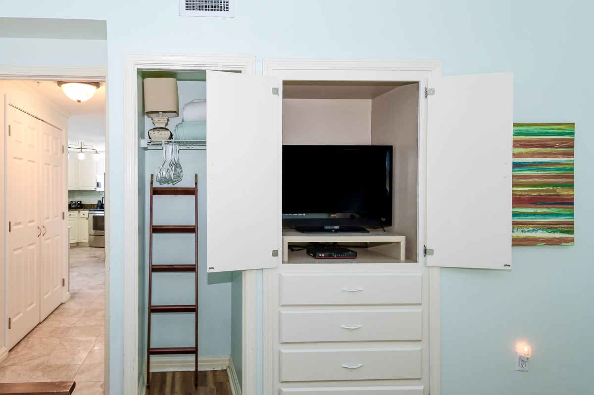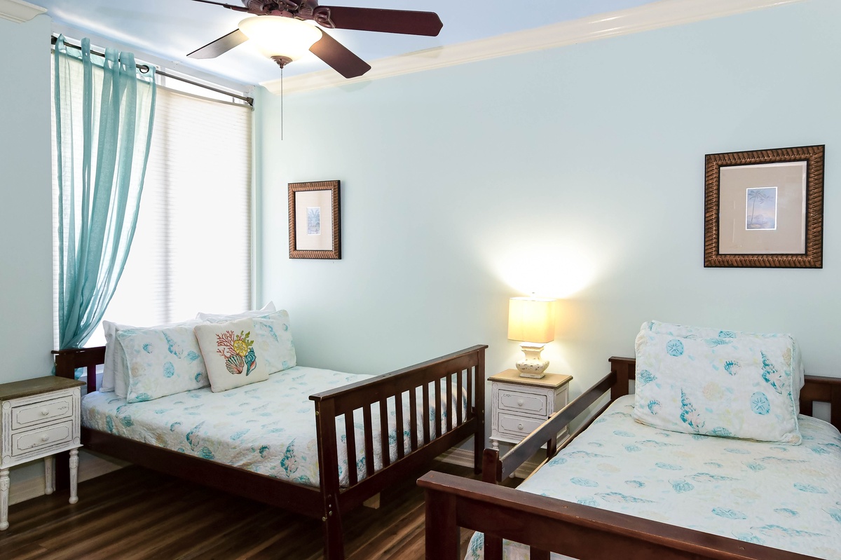 The primary bedroom has incredible beach views and private access to the beach-facing balcony. Complete with a king bed, flat-screen TV, walk-in closet, and private ensuite bathroom, the primary bedroom was designed with relaxation in mind. The primary bathroom features a jetted tub, walk-in shower, and double vanity. The first guest bedroom has a king bed, a flat-screen TV, and private access to the beach-facing balcony. The first guest bedroom has a private bathroom with a walk-in shower. The second guest bedroom has a twin bed and a full bed and a flat-screen TV. Just a few steps from both the second guest bedroom and the living area is a full bathroom with a walk-in shower.