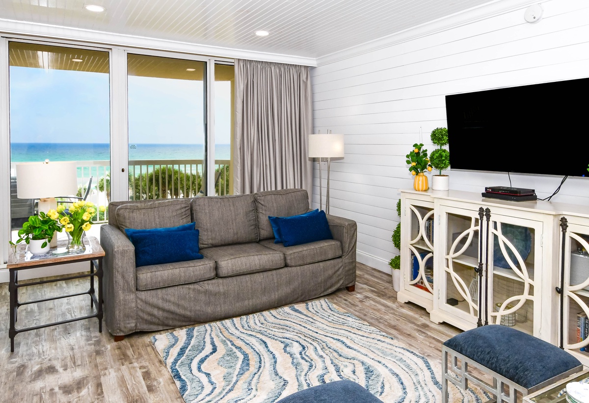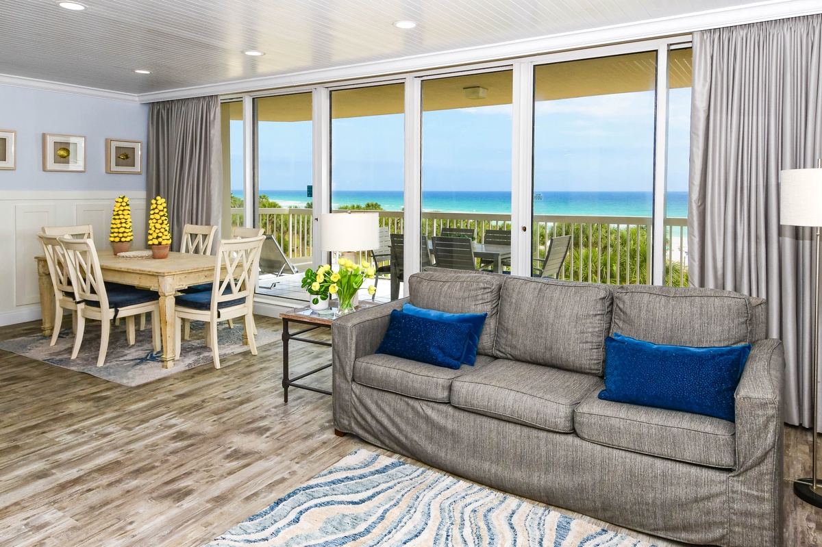 Welcome to Silver Shells St. Maarten 405, a beautifully appointed three-bedroom, three-bathroom beachfront condo located on the fourth floor of the highly sought-after Silver Shells Beach Resort in Destin, Florida. This spacious Gulf-front retreat offers breathtaking views of the Emerald Coast, private beach access, and complimentary seasonal beach service. Step out onto the beach-facing balcony, thoughtfully furnished with an outdoor dining table featuring seating for six, along with additional lounge chairs, perfect for relaxing or dining while taking in sweeping views of the sugar-white sand and emerald waters. Inside, the open-concept living, dining, and kitchen area is designed for gathering and unwinding. The beach-facing living room features floor-to-ceiling windows, sliding glass doors, comfortable seating, and a flat-screen TV. The dining area offers seating for six, with additional seating available at the breakfast bar. The newly redesigned, fully equipped kitchen includes stainless steel appliances and everything you need to prepare and enjoy meals during your stay. The serene primary suite offers incredible Gulf views, private balcony access, a king bed, a flat-screen TV, and a private en-suite bathroom. The spa-inspired primary bathroom features a freestanding soaking tub, a walk-in shower with multiple shower heads and a built-in bench, double vanity, and water closet. The first guest bedroom includes a king bed, flat-screen TV, private access to the north-facing balcony, and a private bathroom with a tiled walk-in shower. The second guest bedroom features two full beds and a flat-screen TV, with a full bathroom with a tiled walk-in shower located just steps from the bedroom and living area. For added convenience, this condo includes complimentary WiFi and an in-unit washer and dryer. Book your stay today and experience luxury beachfront living at Silver Shells St. Maarten 405.