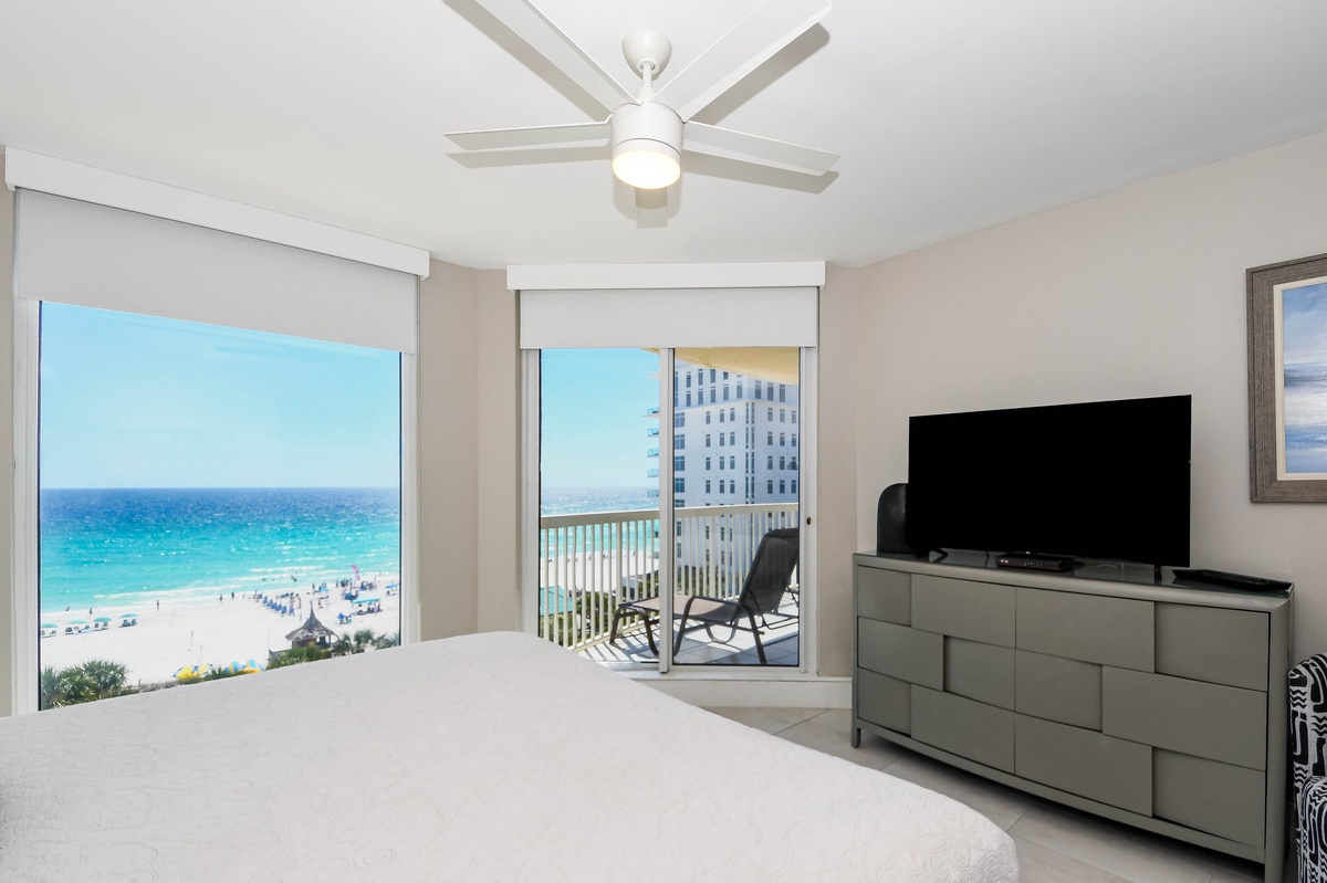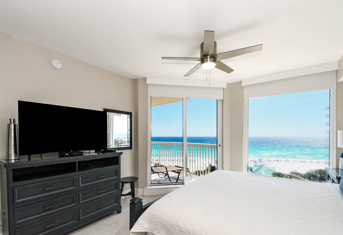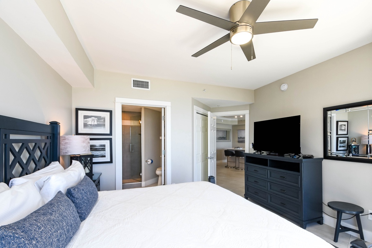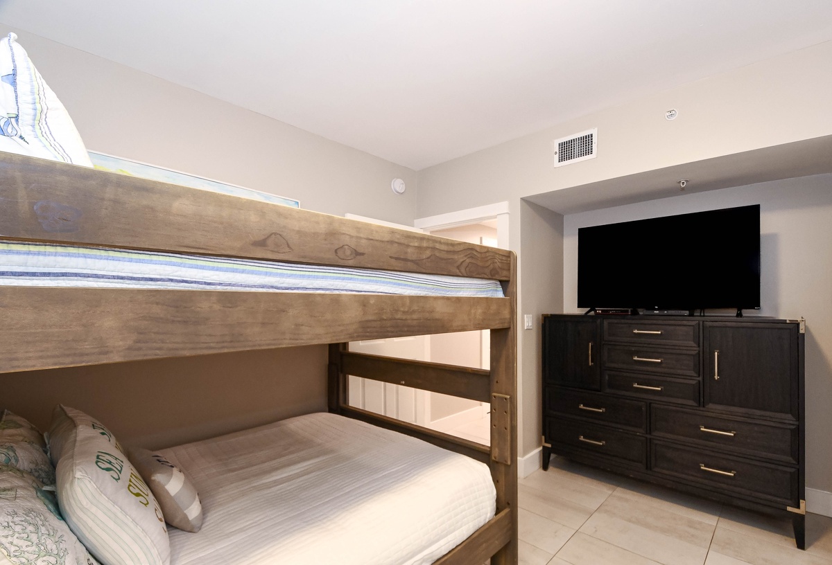 The primary bedroom has incredible beach views and private access to the beach-facing balcony. Complete with a king bed, flat-screen TV, walk-in closet, and private ensuite bathroom, the primary bedroom was designed with relaxation in mind. The primary bathroom features a jetted tub, walk-in shower, and double vanity. The first guest bedroom has a king bed, a flat-screen TV, and private access to the beach-facing balcony. The first guest bedroom has a private bathroom with a walk-in shower. The second guest bedroom has a Queen-over-Queen bunk bed and a flat-screen TV. Just steps from both the second guest bedroom and the living area is a full bathroom with a walk-in shower.