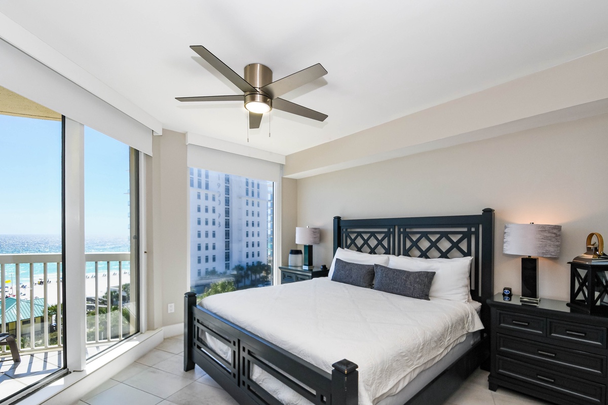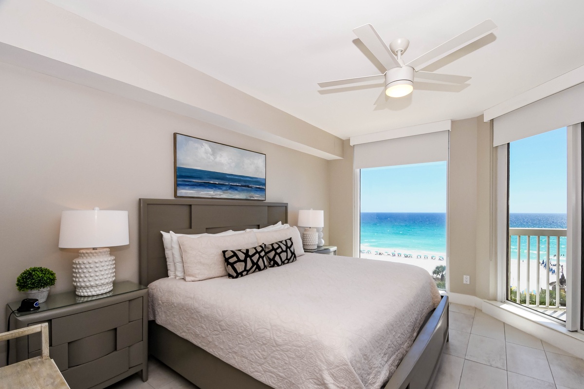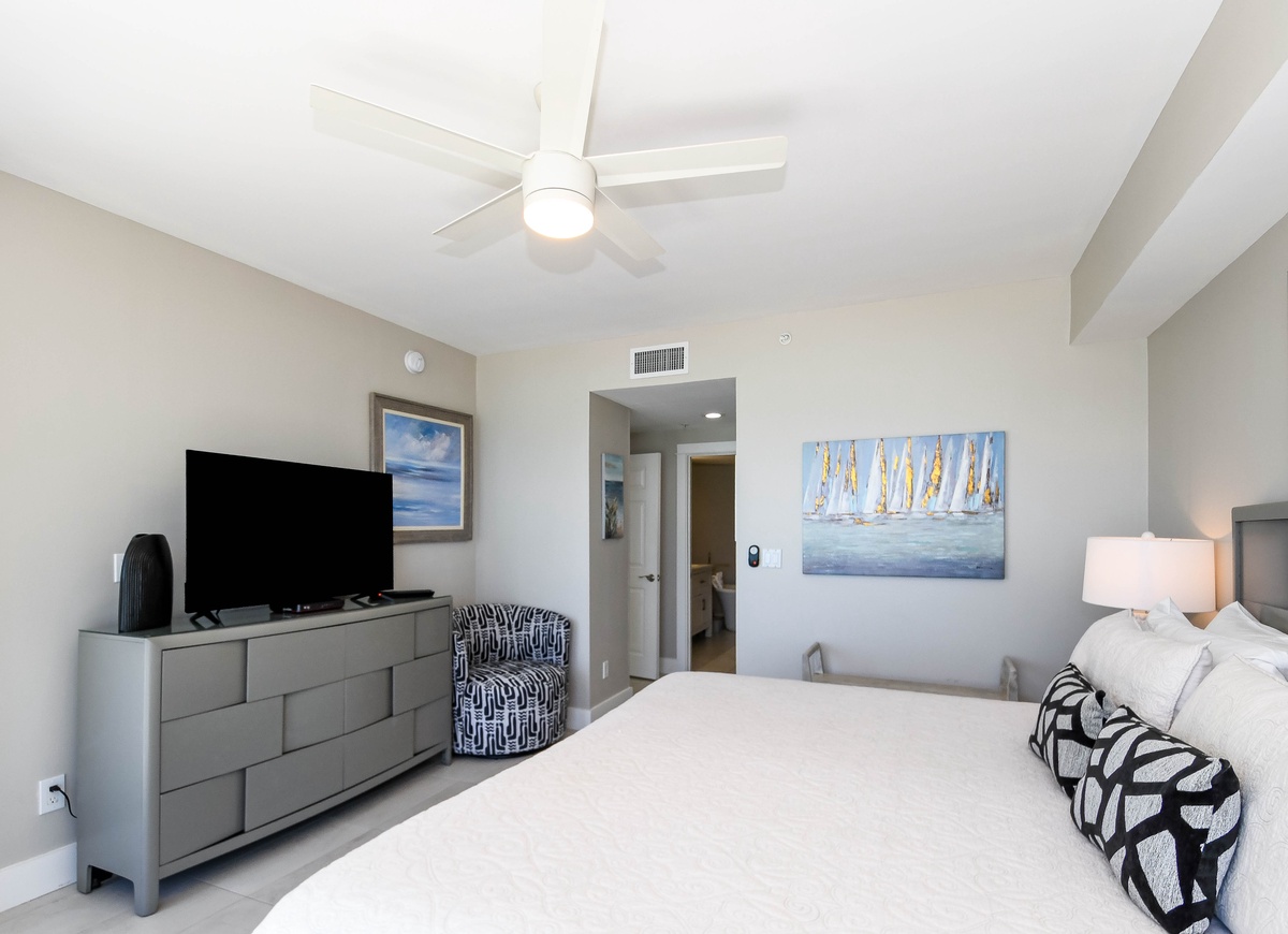 The primary bedroom has incredible beach views and private access to the beach-facing balcony. Complete with a king bed, flat-screen TV, walk-in closet, and private ensuite bathroom, the primary bedroom was designed with relaxation in mind. The primary bathroom features a jetted tub, walk-in shower, and double vanity. The first guest bedroom has a king bed, a flat-screen TV, and private access to the beach-facing balcony. The first guest bedroom has a private bathroom with a walk-in shower. The second guest bedroom has a Queen-over-Queen bunk bed and a flat-screen TV. Just steps from both the second guest bedroom and the living area is a full bathroom with a walk-in shower.