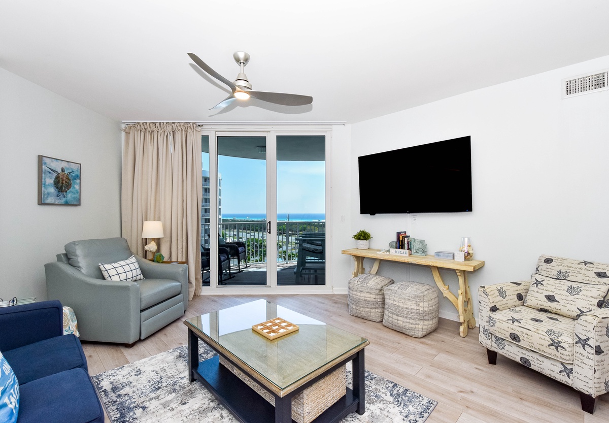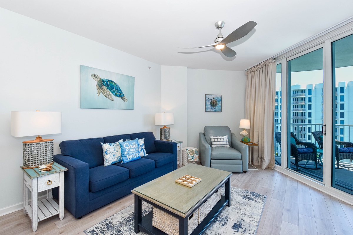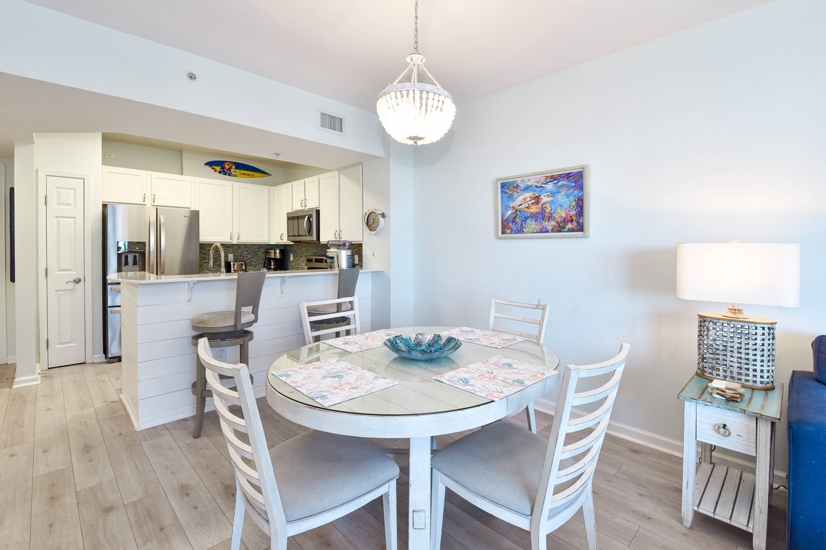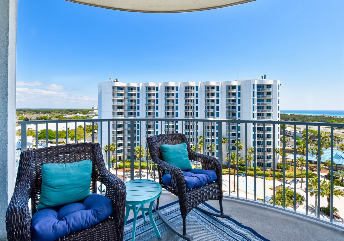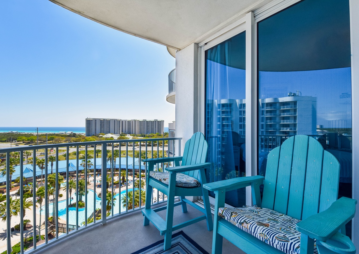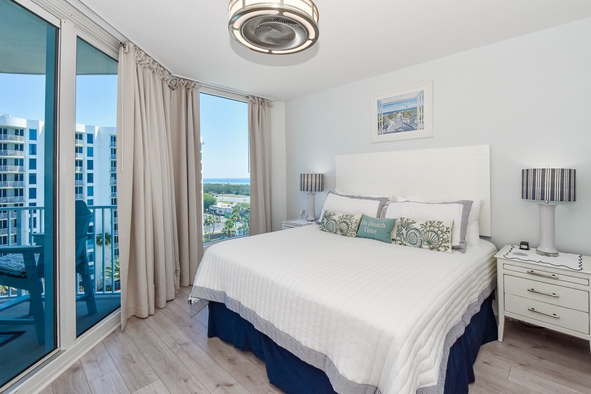 Welcome to The Palms of Destin 2909 Junior, your charming coastal retreat perched on the ninth floor, offering serene views of the sparkling lagoon pool and a glimpse of the Gulf beyond. This delightful condo blends the comforts of home with the relaxed elegance of a beach escape, perfect for creating unforgettable memories with family or friends. Step into a fully equipped kitchen, where stainless steel appliances and thoughtful touches invite the chef in your group to whip up everything from quick beach-day bites to hearty family dinners. Gather around the dining table for four to share meals and laughter or enjoy laid-back breakfasts and snacks at the bar with seating for two. The cozy living area is ideal for movie nights, board games, or simply unwinding after a day of fun at the beach. The serene primary suite includes a king bed, flat-screen TV, private balcony access, and an attached bath featuring a tub/shower combo. A guest bedroom offers a twin-over-full bunk bed, and the living room includes a sleeper sofa, allowing the space to comfortably sleep up to six guests. Additional features include a second full bathroom with a walk-in shower, an in-unit washer and dryer for your convenience, and secure WiFi to keep you connected when you want to be. Whether you're sipping morning coffee on the balcony, lounging by the resort-style pool, or exploring the sugar-white sands of Destin, The Palms of Destin 2909 is your home base for coastal comfort and sunshine-filled memories.