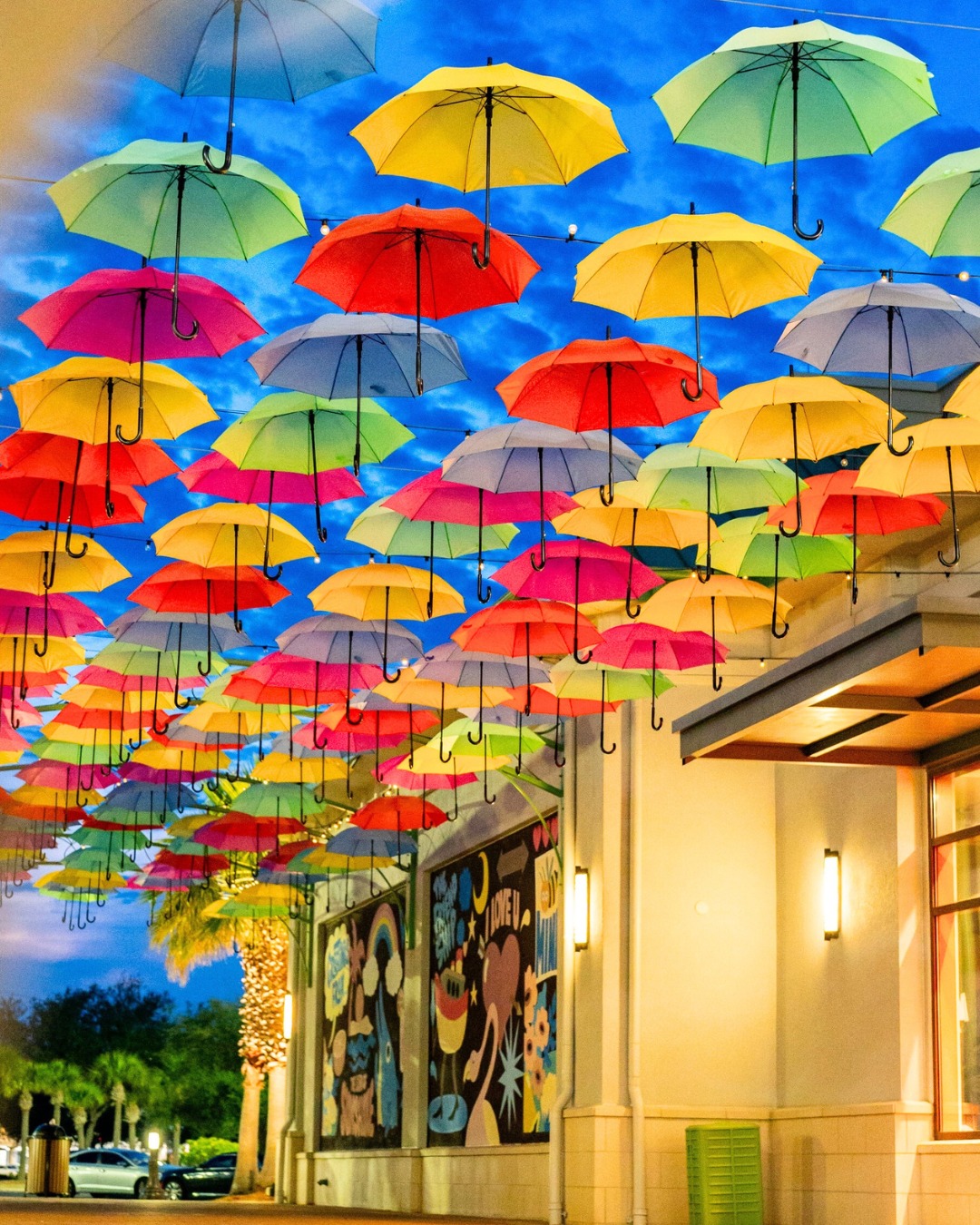 Umbrella Sky Installation – A canopy of colorful umbrellas near Uncle Buck’s Fishbowl, offering a whimsical overhead shot
