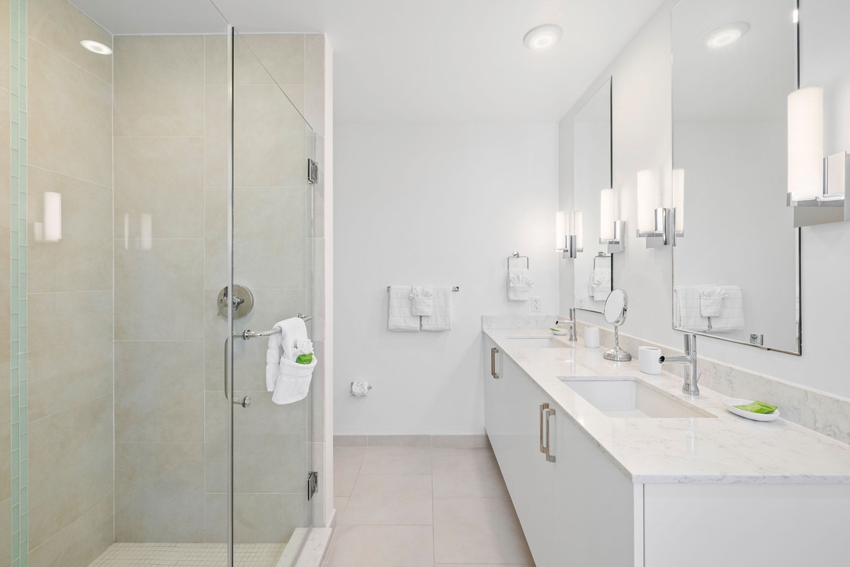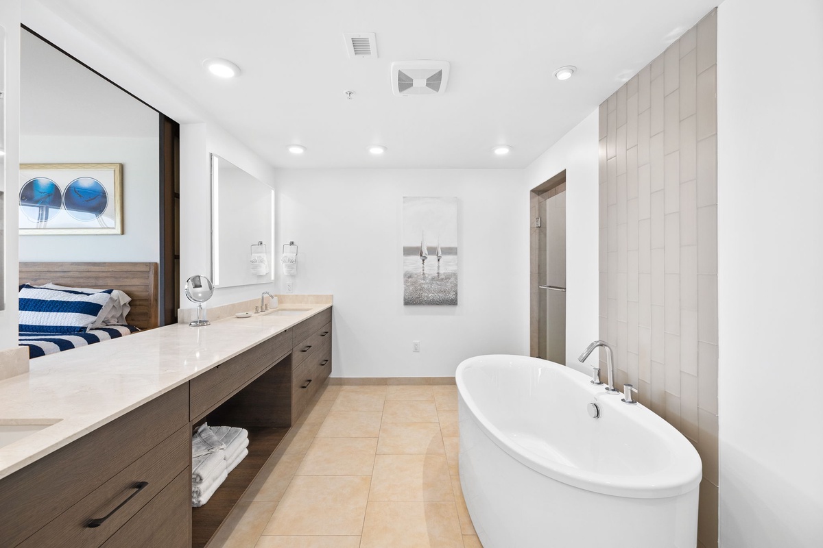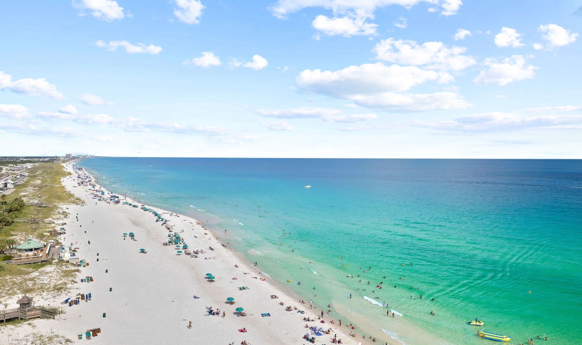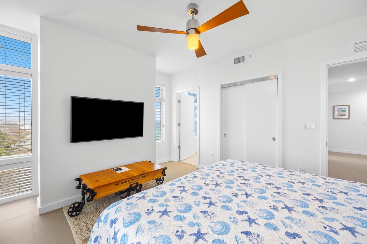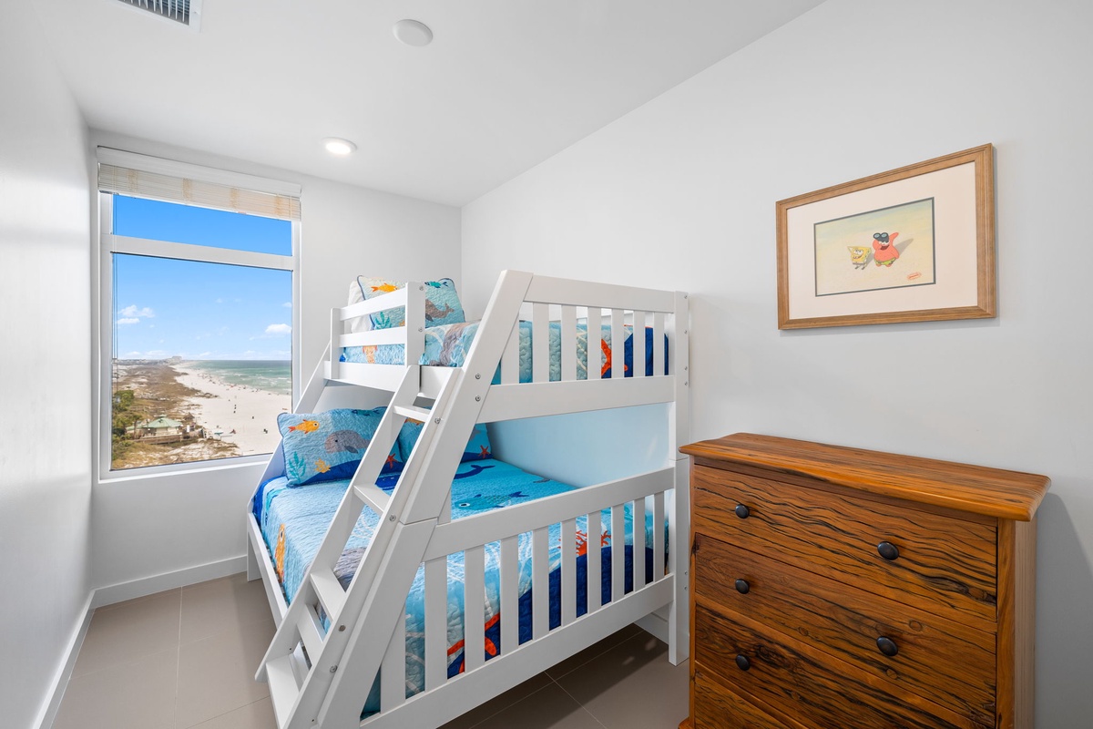The master bedroom boasts a king bed, flat-screen TV, balcony access, and an attached bathroom featuring a grand soaker tub and walk-in shower. The first guest bedroom offers a king bed and an attached bathroom with a walk-in shower. Additional guest rooms include one with a queen bed and another with a twin-over-full bunk bed, both sharing a bathroom with a tub/shower combo. For added convenience, the condo includes a washer and dryer and complimentary beach service during the season. Your dream luxury vacation awaits at 1900 Ninety-Eight 801.