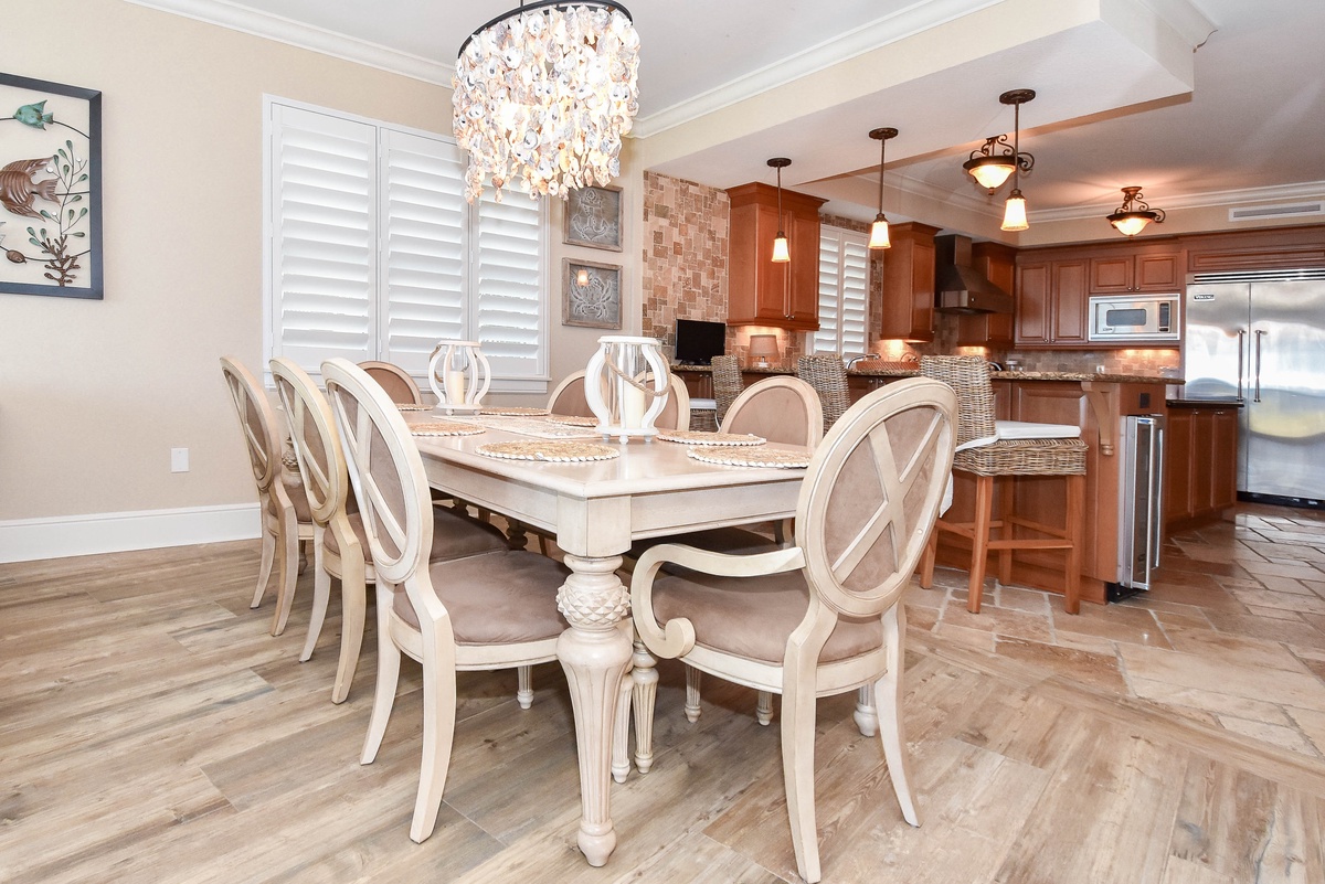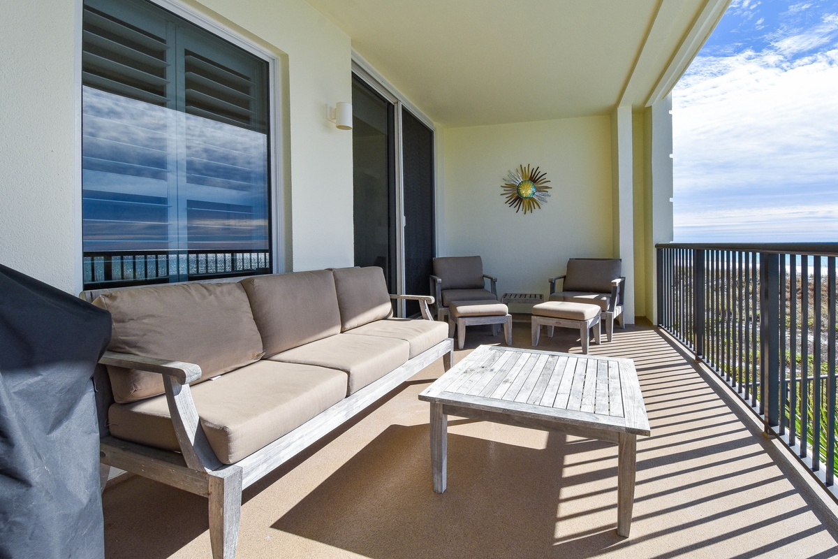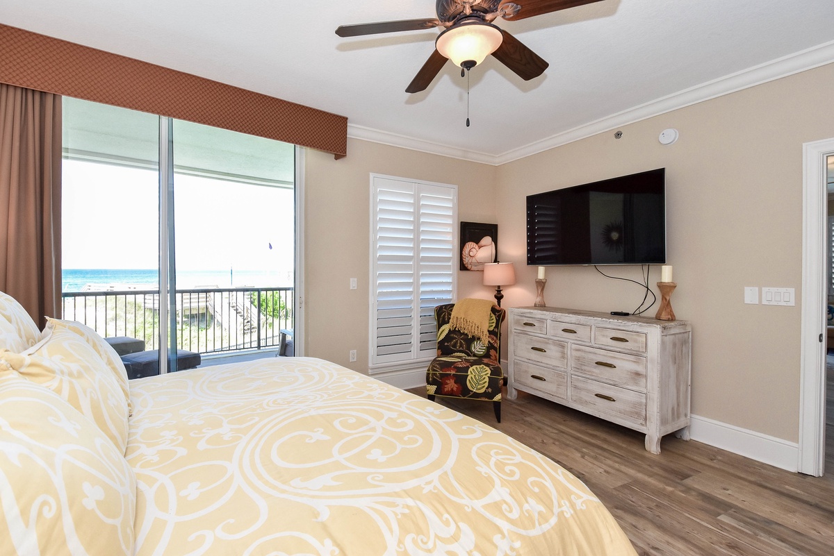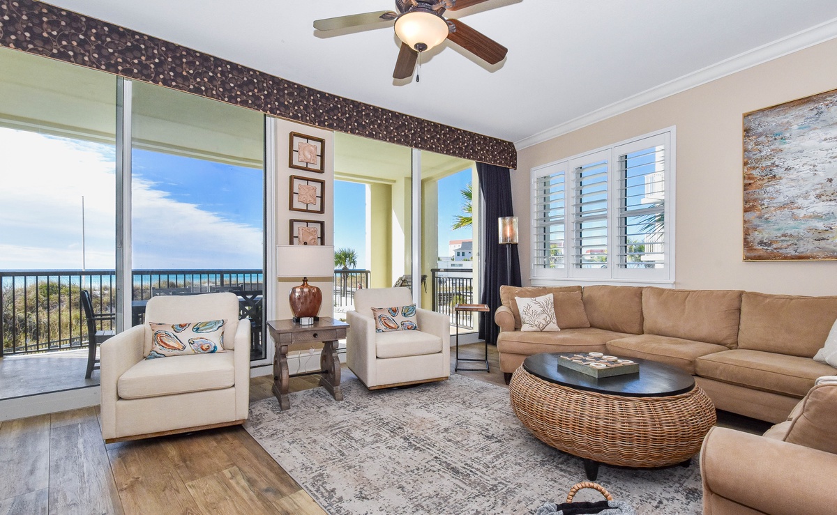 Escape to Bella Riva 109, an elevated first-floor, four-bedroom, three-bathroom beachfront condo offering over 2,400 square feet of indoor living space and a large balcony with a private grill. The open-concept floor plan creates a seamless flow, making it easy for family and friends to relax together. The living area features a huge sectional, a large flat-screen TV, and floor-to-ceiling windows with sliding glass doors that lead out to the balcony. Enjoy unforgettable beach views from the living spaces, balcony, and primary bedroom. The fully equipped kitchen is a chef's dream, featuring stainless steel Viking appliances, granite countertops, and plenty of prep space with a breakfast bar and island. Gather at the breakfast bar with seating for four for a quick meal or sit down at the beautiful dining table that comfortably seats eight.