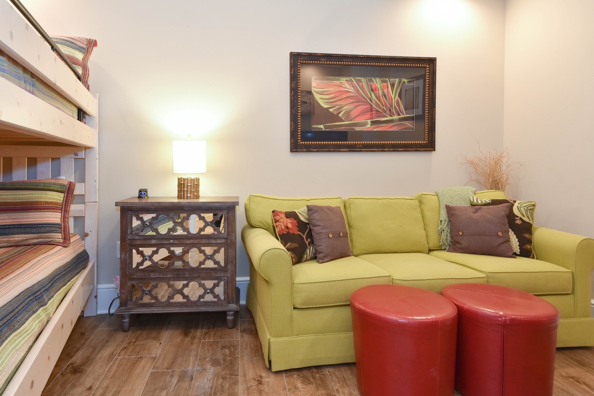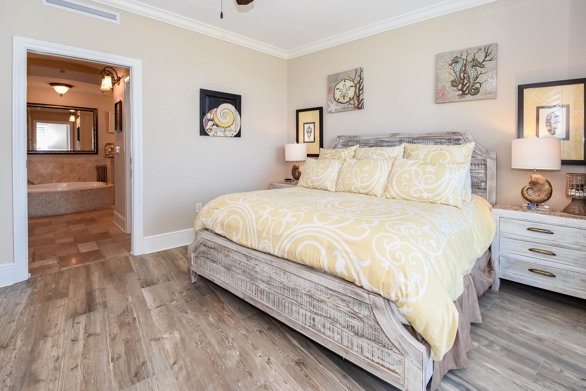 Unwind after a day in the sun in the primary bedroom, which includes a king bed, balcony access, and a flat-screen TV. The spacious attached bathroom boasts a garden tub, walk-in shower with multiple shower heads, and dual vanities. The first guest bedroom features a queen bed and a private attached bathroom with a tub/shower combo. The second guest bedroom offers a queen bed and a semi-private bathroom with a tub/shower combo, also accessible from the hall. The bunk room is perfect for kids, with a twin-over-twin bunk bed, plus a sleeper sofa in the living room, this condo allows up to 10 guests to sleep comfortably. Completing this beautiful condo are flat screen TVs in all bedrooms, a washer and dryer, plus a complimentary beach set up in season. Come escape to Bella Riva 109 for your next Okaloosa Island beach vacation.