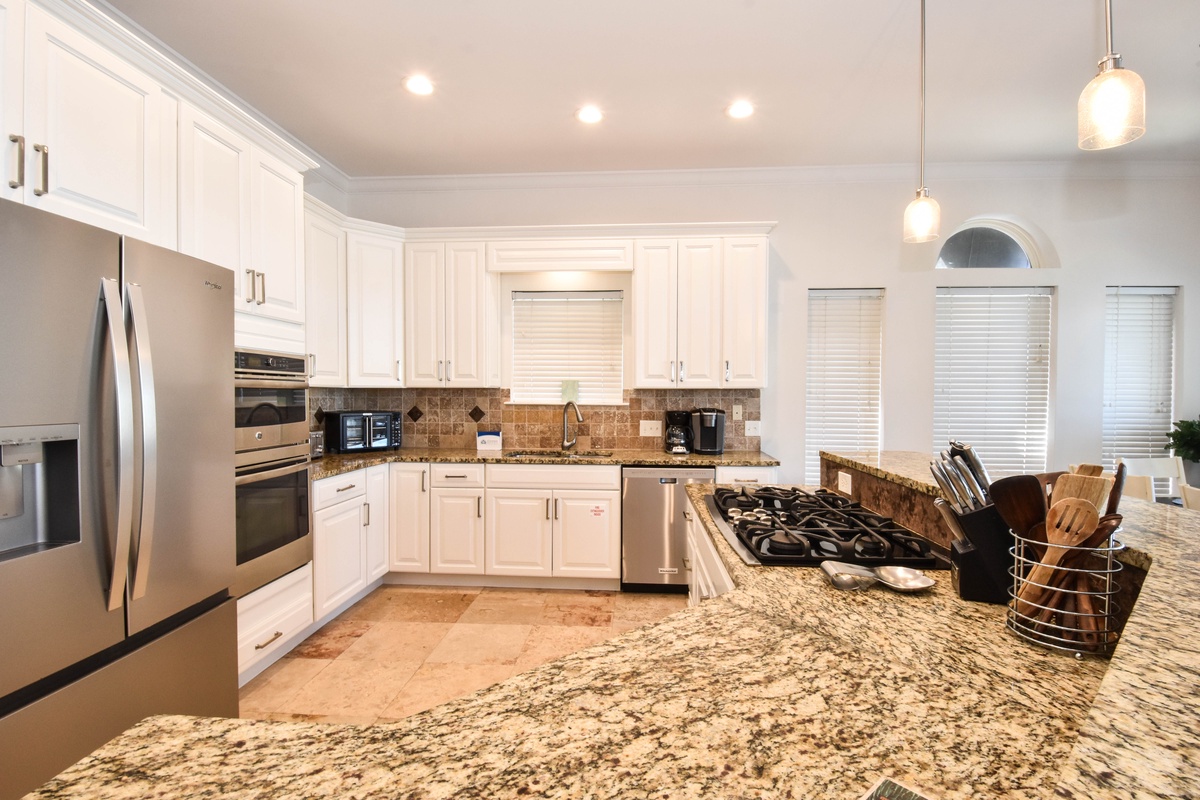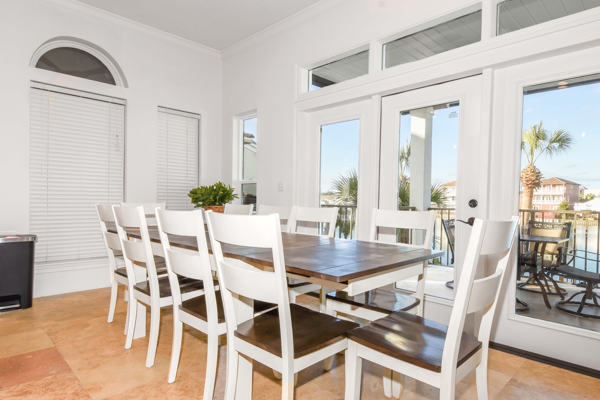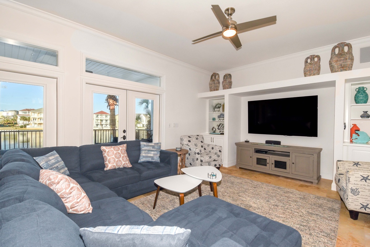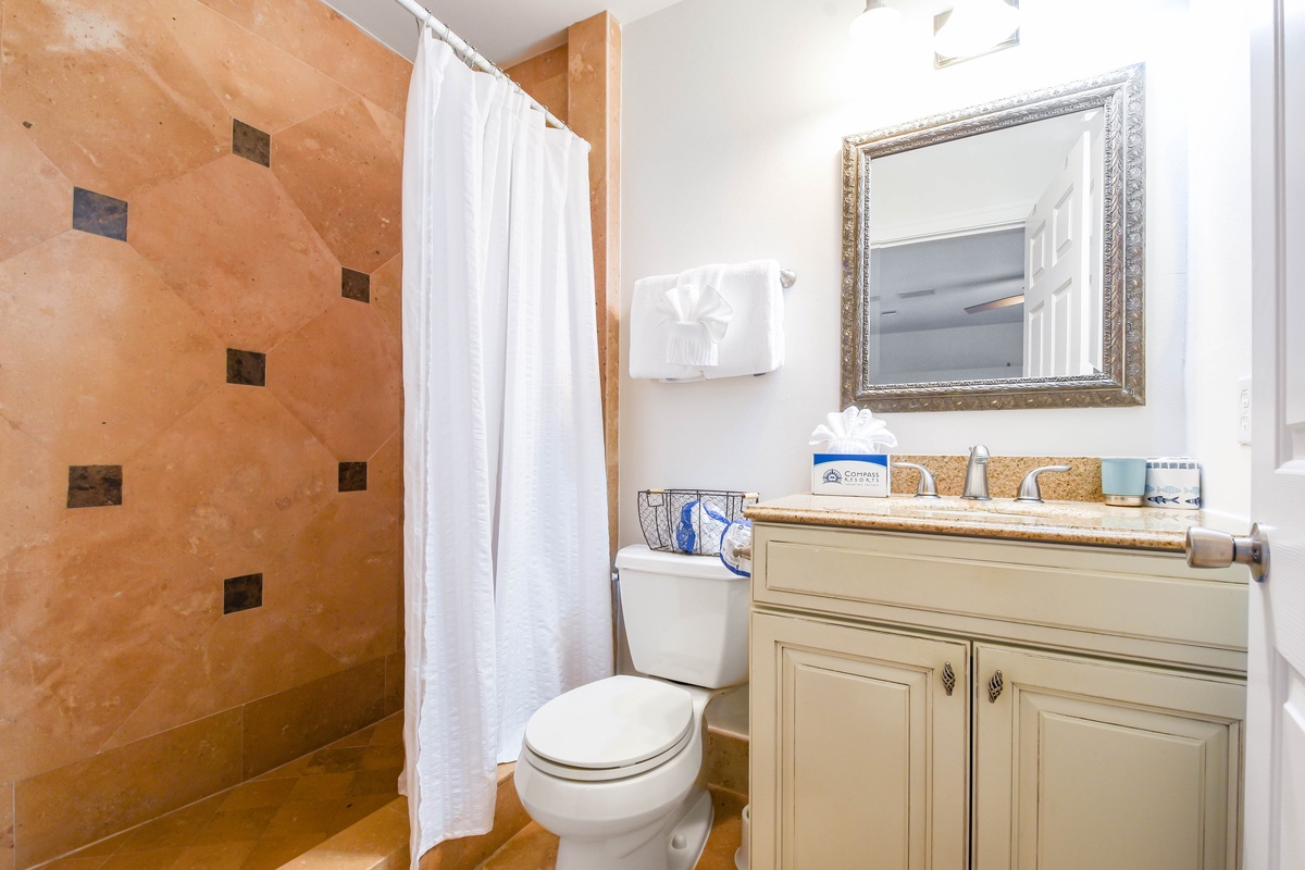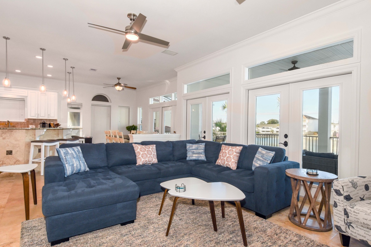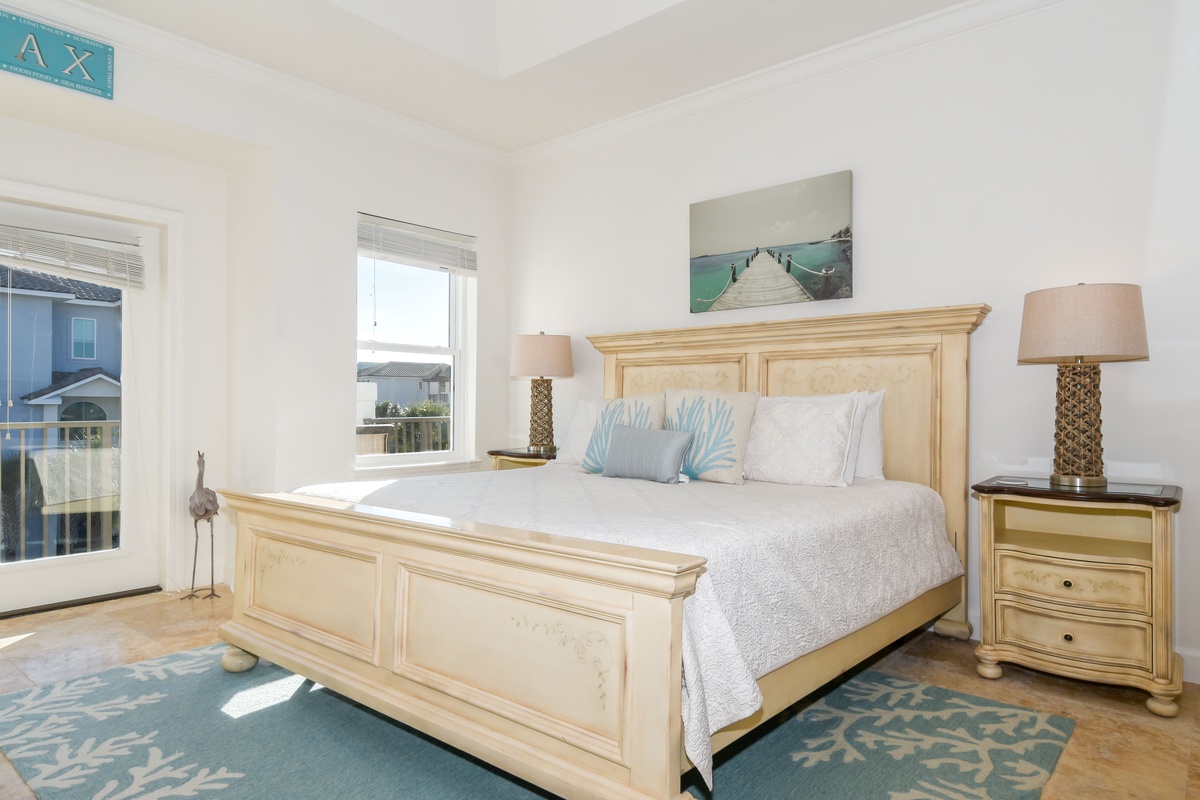 The main entrance to the home is on the second floor and grants immediate access to an open concept living area. The living area has a large sectional sofa with a built-in queen sleeper sofa and a 75" smart TV. The kitchen features granite countertops, a gas cooktop on the island bar, stainless steel appliances, and plenty of cabinet space. The kitchen is stocked with cookware and dishware, which is perfect for making delicious meals during your vacation. The dining area includes a large dining table capable of seating 10 and there is seating for an additional four at the breakfast bar. The large, covered balcony, accessible from both the dining area and living areas offers a small dining set and two outdoor sectionals. Perfect spot for an afternoon cat nap. There is a guest bedroom located just off the living area and contains a king bed, flat-screen TV, and a private bathroom with a tiled walk-in shower.
