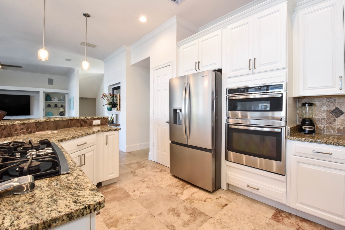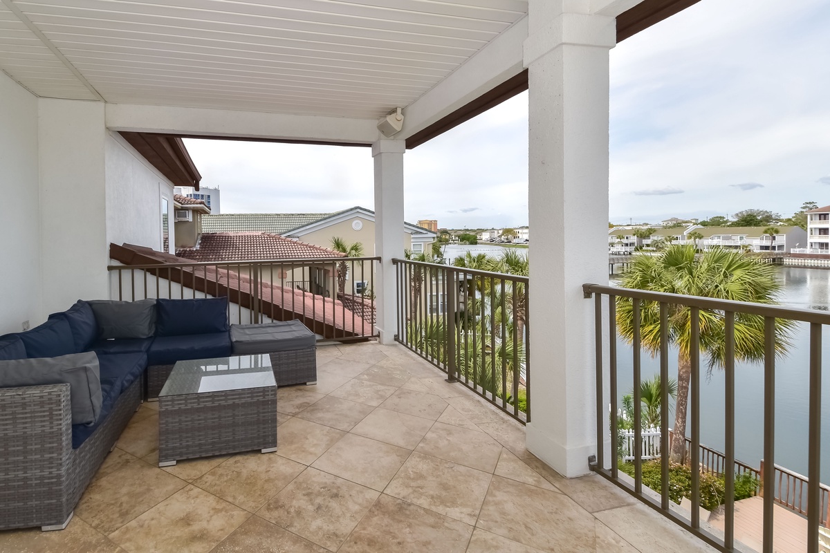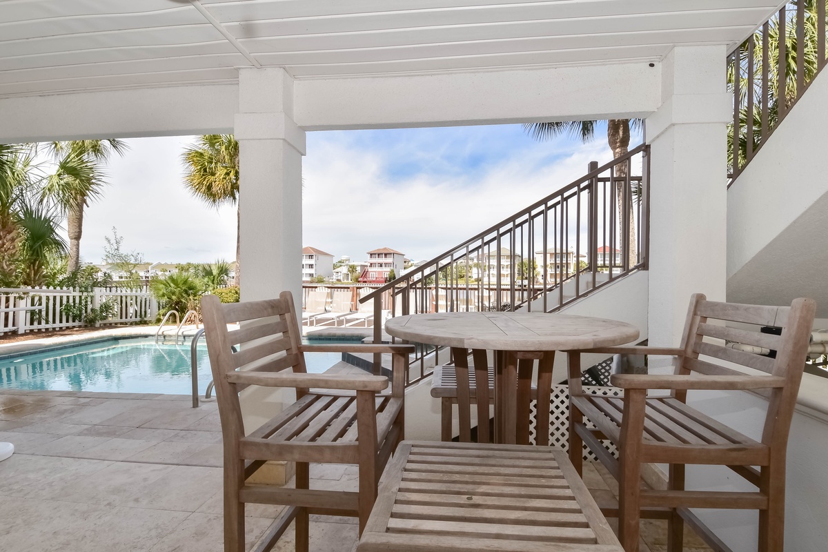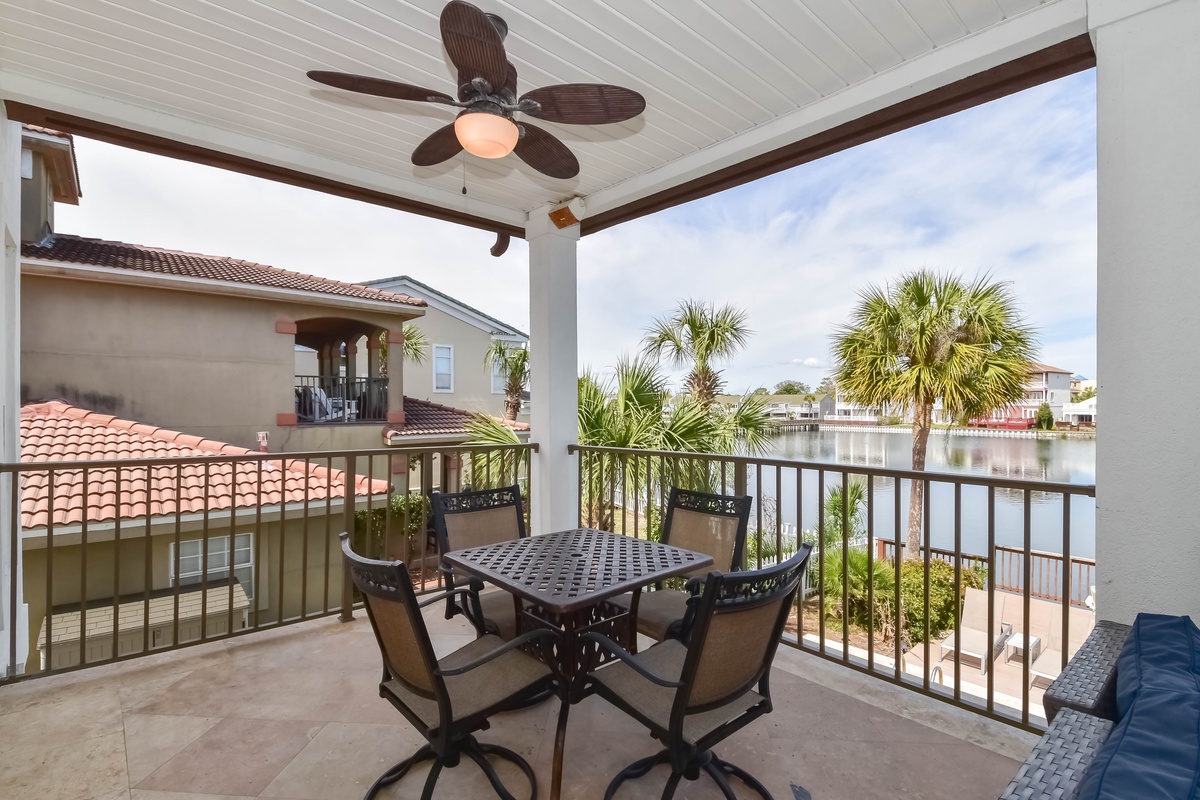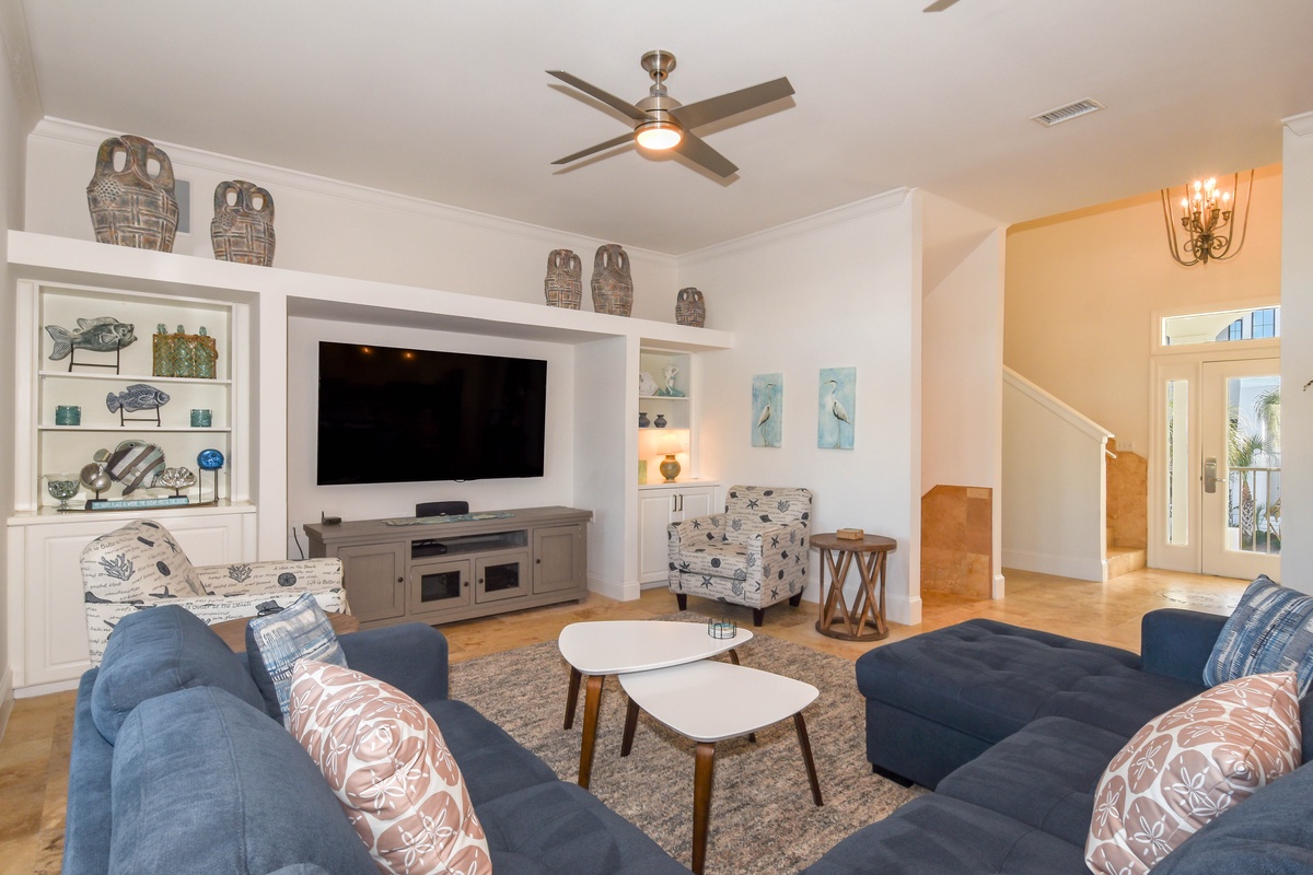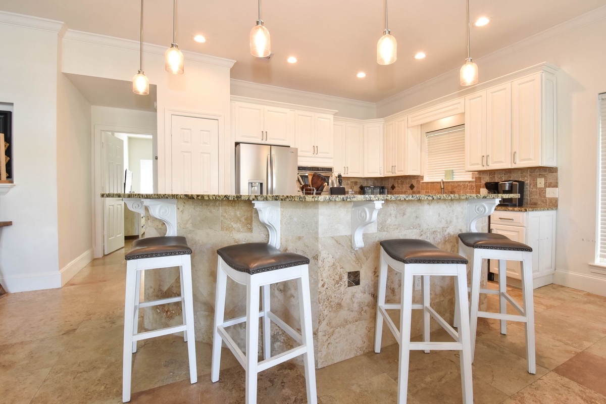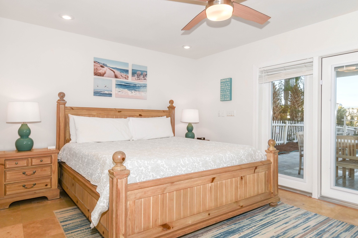 The main entrance to the home is on the second floor and grants immediate access to an open concept living area. The living area has a large sectional sofa with a built-in queen sleeper sofa and a 75" smart TV. The kitchen features granite countertops, a gas cooktop on the island bar, stainless steel appliances, and plenty of cabinet space. The kitchen is stocked with cookware and dishware, which is perfect for making delicious meals during your vacation. The dining area includes a large dining table capable of seating 10 and there is seating for an additional four at the breakfast bar. The large, covered balcony, accessible from both the dining area and living areas offers a small dining set and two outdoor sectionals. Perfect spot for an afternoon cat nap. There is a guest bedroom located just off the living area and contains a king bed, flat-screen TV, and a private bathroom with a tiled walk-in shower.