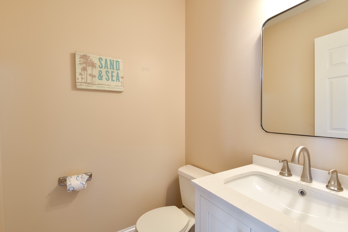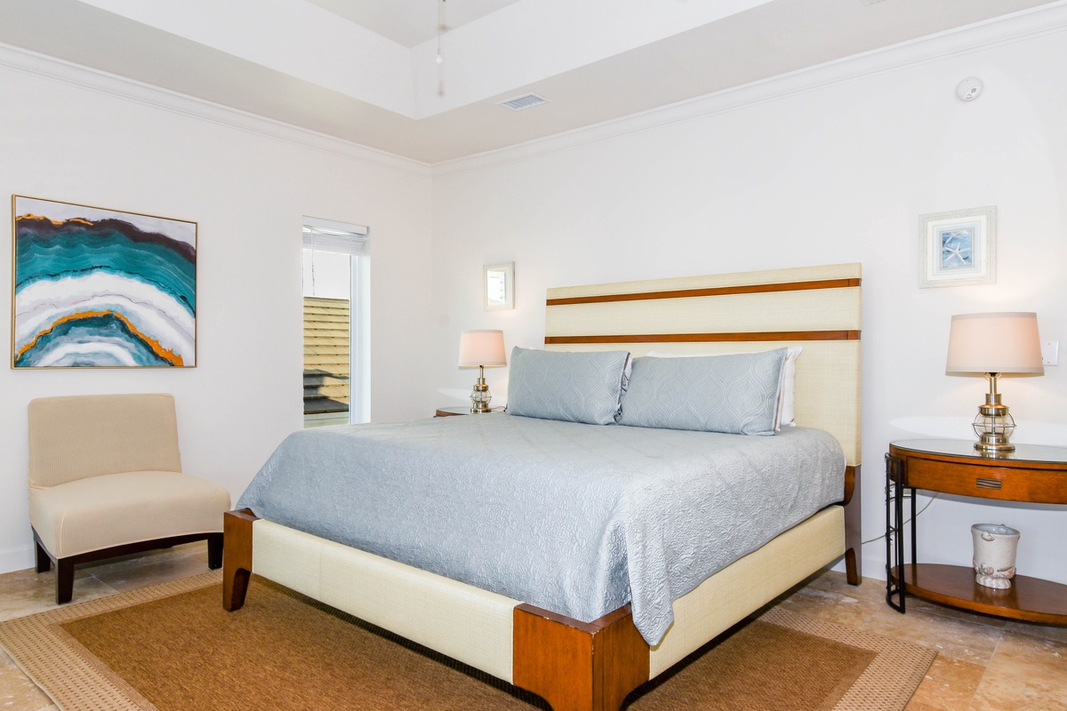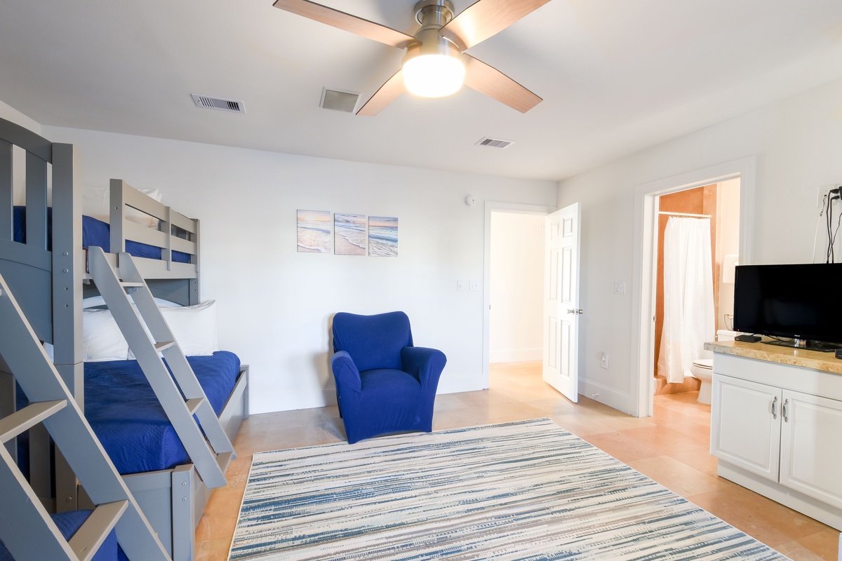 Upon entering the first floor there is a king bedroom with a private bathroom containing a tiled walk-in shower and a guest bunk room featuring two twin over full bunk beds with twin trundles accommodating up to eight guests, a perfect space for kids. The bunk room also has a private bathroom with a tiled walk-in shower.