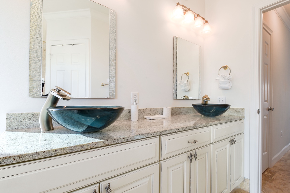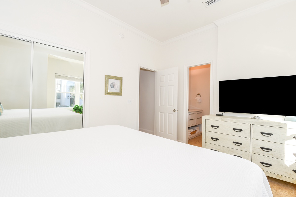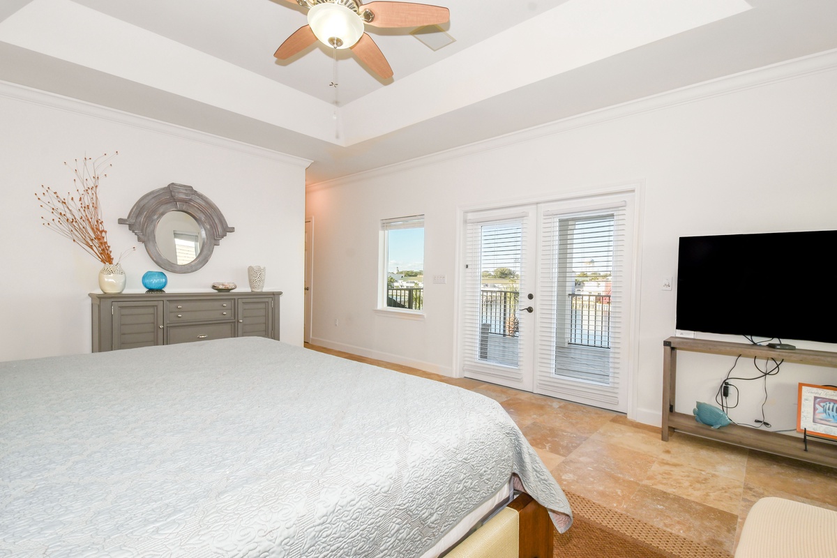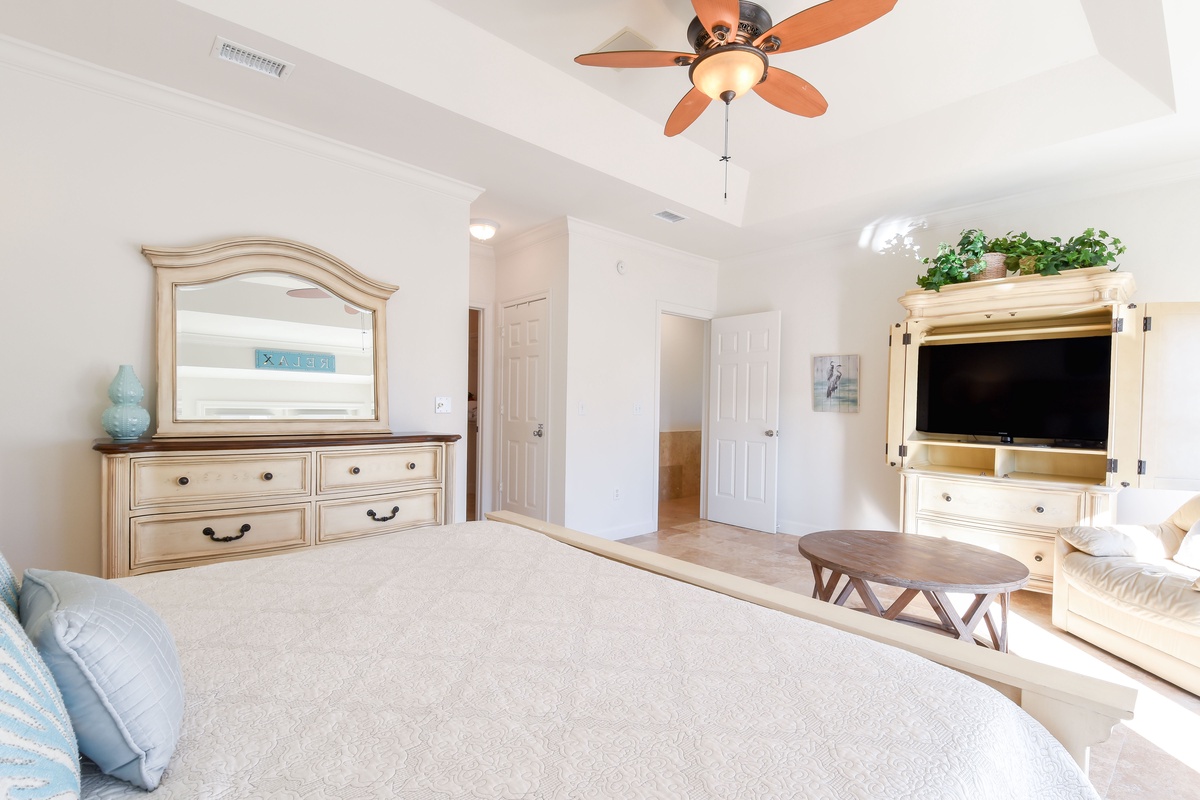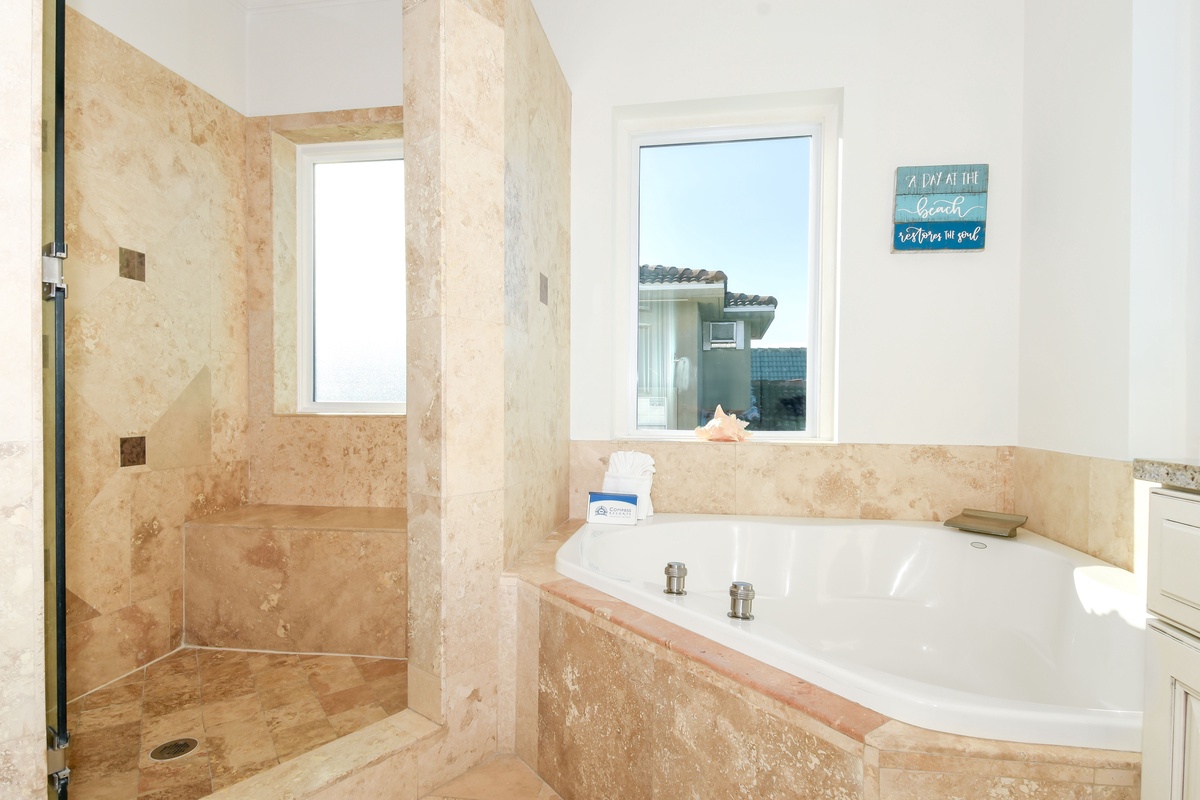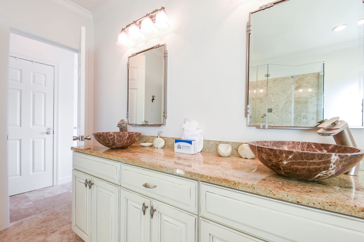 Two master suites are located on the third floor. The first master suite is located on the front side of the house and has a private balcony that looks out over the neighborhood and contains a king bed, flat-screen TV, large walk-in closet, and a private bathroom. The master bathroom features a garden tub and walk-in shower boasting eight body spray heads and two shower heads. The second master suite is on the lake side of the home, has a flat-screen TV, large closet, and a large, private balcony with a pool and lake view. The private bathroom features an oversized corner garden tub and a tiled walk-in shower with four body spray heads and two shower heads.
