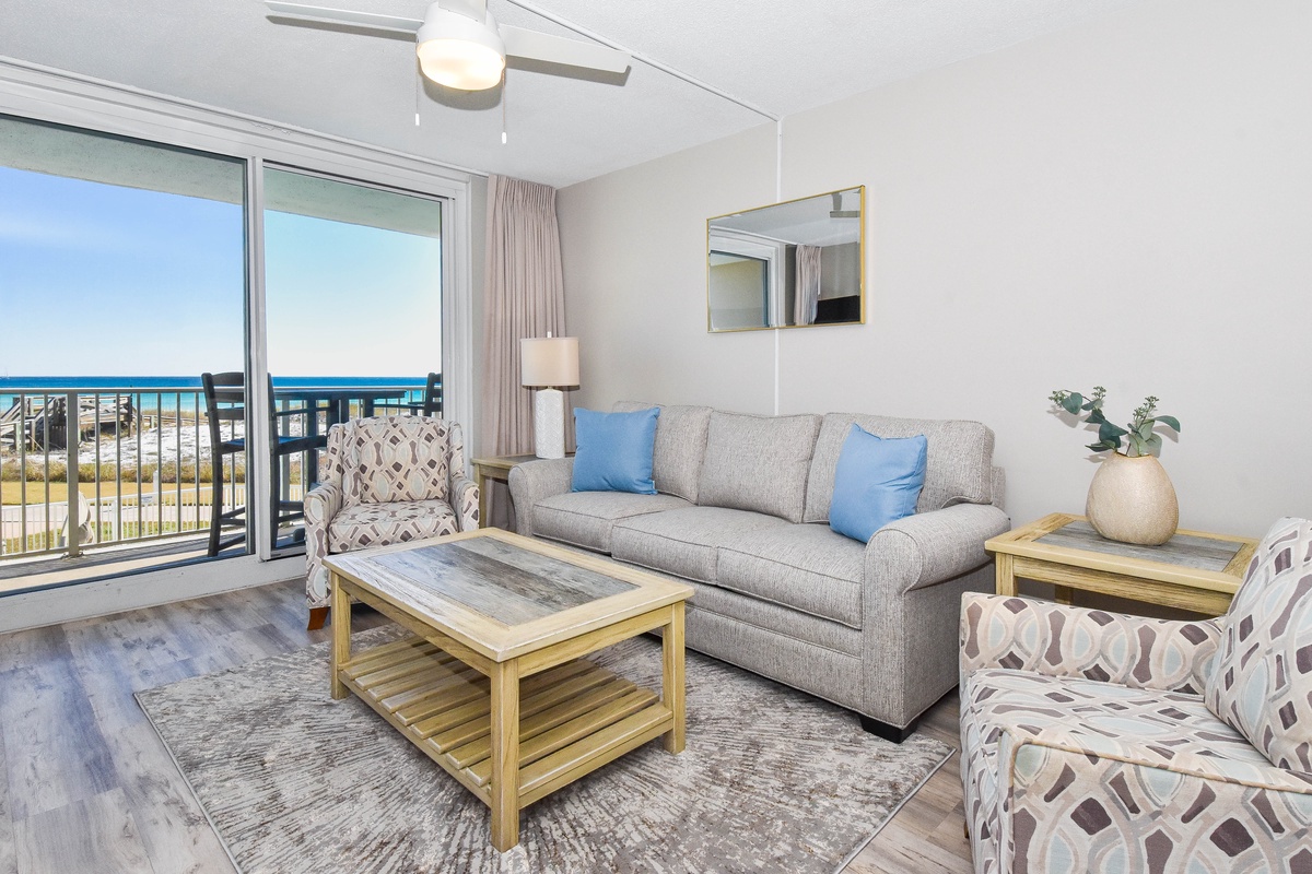 Welcome to Destin on the Gulf 204, a spacious and serene two-bedroom, two-bathroom vacation rental that perfectly combines comfort, privacy, and the natural beauty of Florida’s Gulf Coast. Located on the second floor, this peaceful retreat offers sweeping views of protected sand dunes, shimmering emerald waters, and overlooks the community beachfront pool - an ideal setting for a relaxing coastal escape. Unlike many condos in the greater Destin area, this unit offers a more tranquil, secluded atmosphere - perfect for those seeking a true getaway. Inside, the open-concept living area features warm, coastal-inspired vinyl flooring and is designed for both relaxation and togetherness. Gather in the cozy living room with plush seating and a smart TV, or step onto the private beachfront balcony to enjoy sunrises, sunsets, and the occasional dolphin sighting. The dining area comfortably seats your group, while the fully equipped kitchen has everything you need to prepare favorite meals or try something new with local ingredients. The master bedroom is a calming retreat with beautiful beach views, a king bed, smart TV, and en-suite bathroom with a walk-in shower. The guest bedroom also includes a king bed and smart TV, with a second full bathroom - featuring a tub/shower combo - conveniently nearby. For added convenience, a shared laundry room is available onsite. Whether you're seeking quiet solitude or quality time with loved ones, Destin on the Gulf 204 offers the perfect balance of comfort, charm, and coastal serenity.