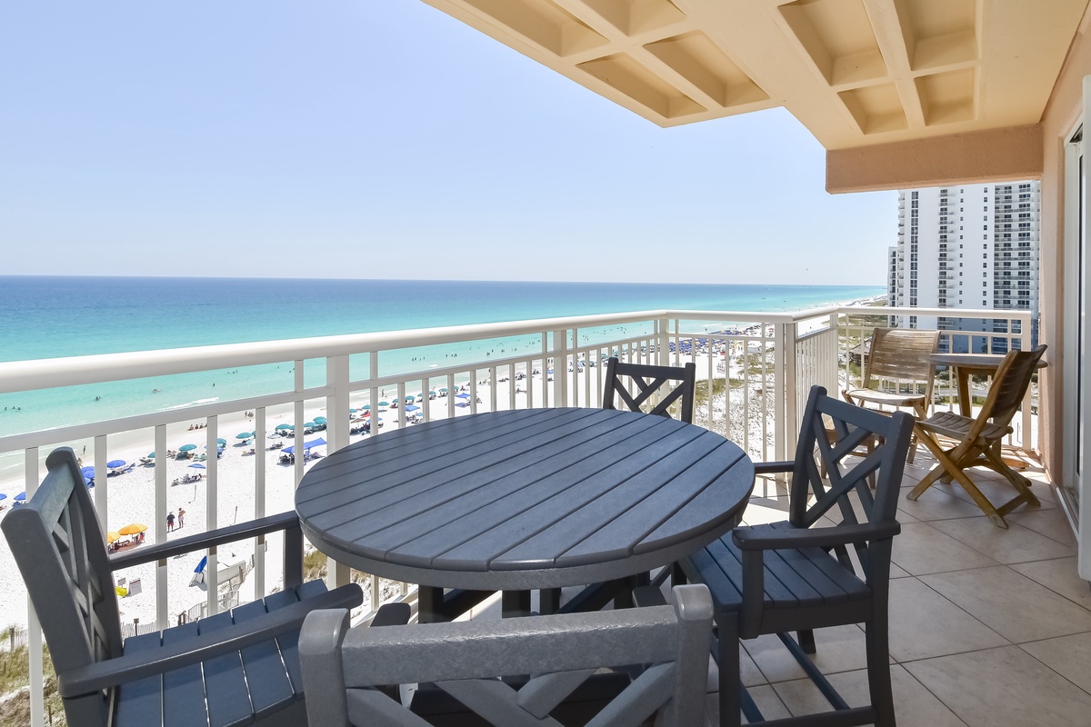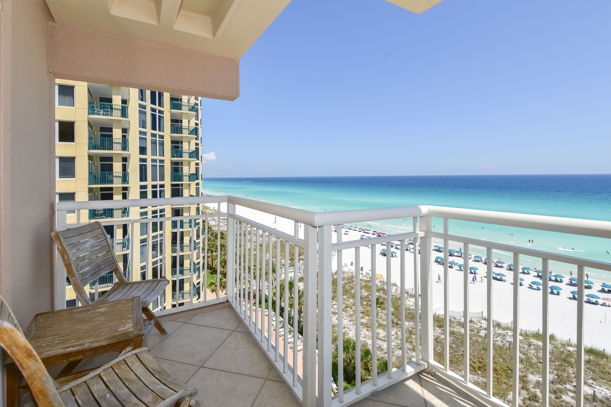 Welcome to Destin Towers 92, a beautifully furnished 2-bedroom, 2-bath condo on the 9th floor of an exclusive, gated beachfront community. Enjoy sweeping views of emerald waters and sugar-white sands from your private balcony, just steps from a private beach reserved for Destin Towers guests. This low-density complex offers a peaceful escape with top-tier amenities, including a Gulf-front pool, beachfront hot tub, tennis courts, garage parking, community grills, and direct beach access, just minutes from Destin’s best dining, shopping, and attractions. Inside, the open-concept layout connects the fully equipped kitchen, dining area, and cozy living room, featuring a smart TV and a queen sleeper sofa for extra guests. Sliding glass doors lead to a spacious balcony with panoramic Gulf views. The master suite includes a king bed, smart TV, large closet, balcony access, and a spa-style ensuite bathroom with a soaking tub, walk-in shower, and double vanity. The guest bedroom offers two twin beds, a smart TV, and easy access to a full bathroom with a tub/shower combo. For added convenience, the condo includes a washer and dryer, plus two backpack beach chairs to make your beach days effortless.