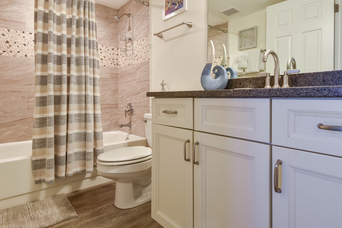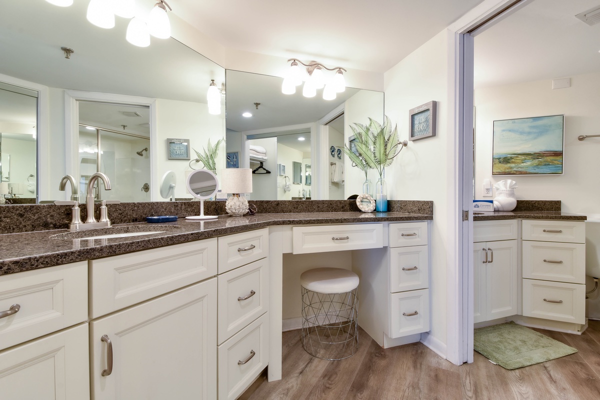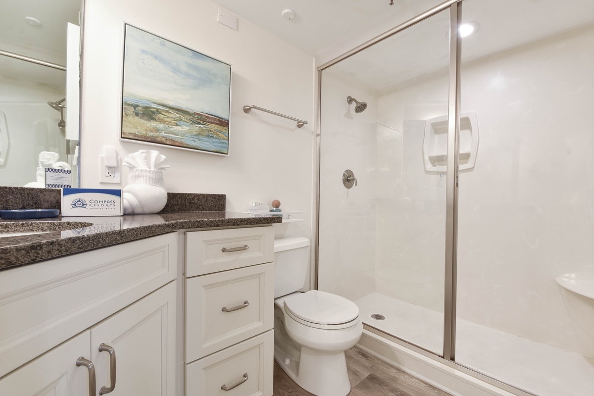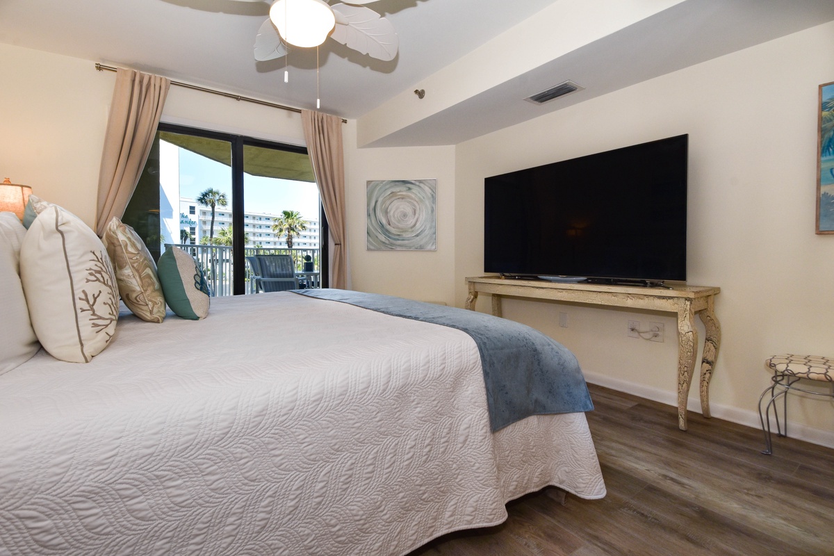 The master bedroom is fitted with a spacious king bed, a large smart TV, and private access to the balcony. The ensuite master bathroom has a large vanity and walk-in shower. The guest bedroom has a king-sized bed, a large closet, and a smart TV. The guest bathroom, located only a few steps away, has a shower-tub combo and plenty of vanity space.