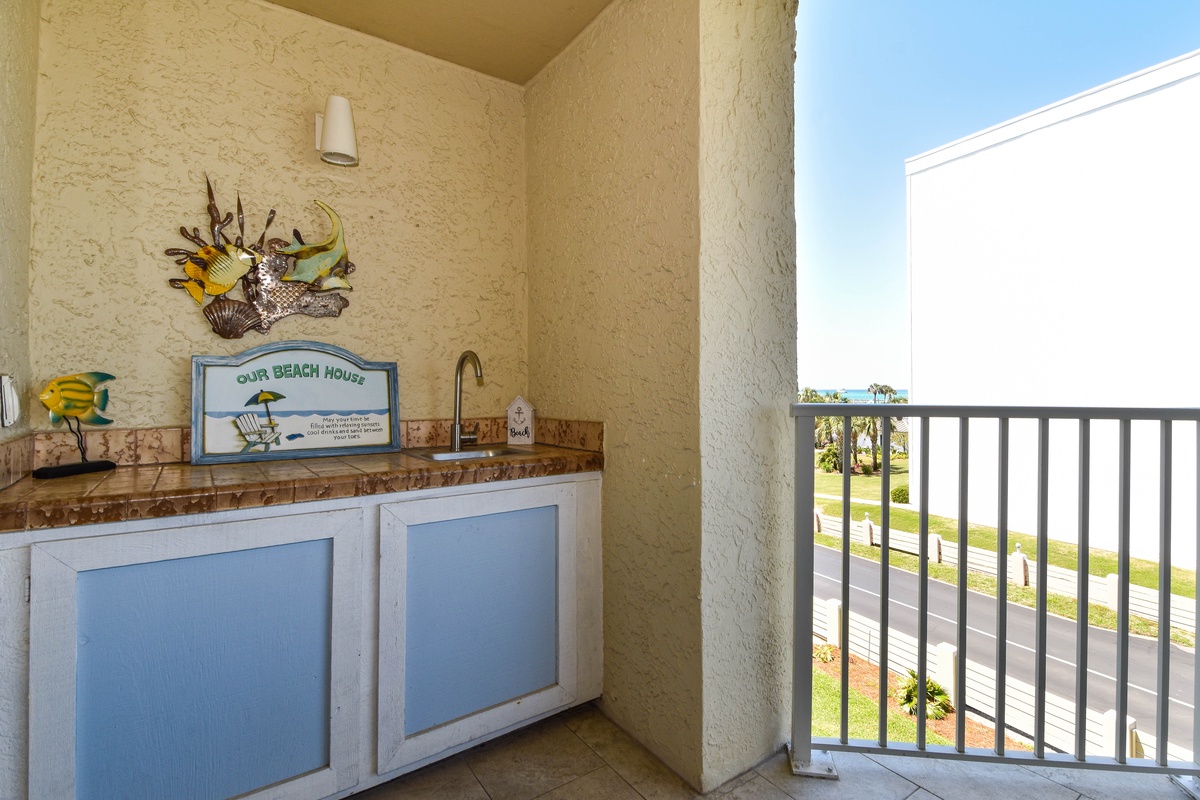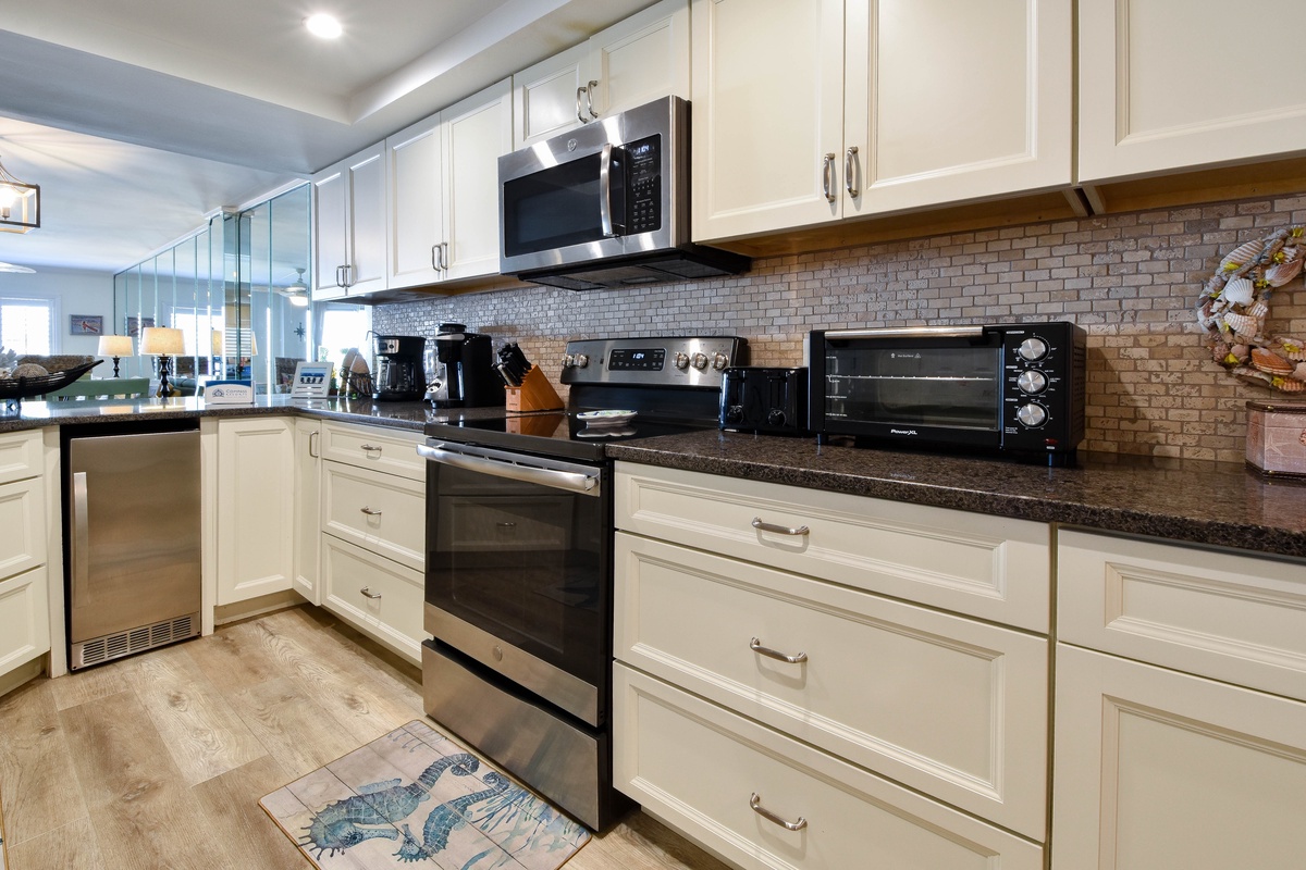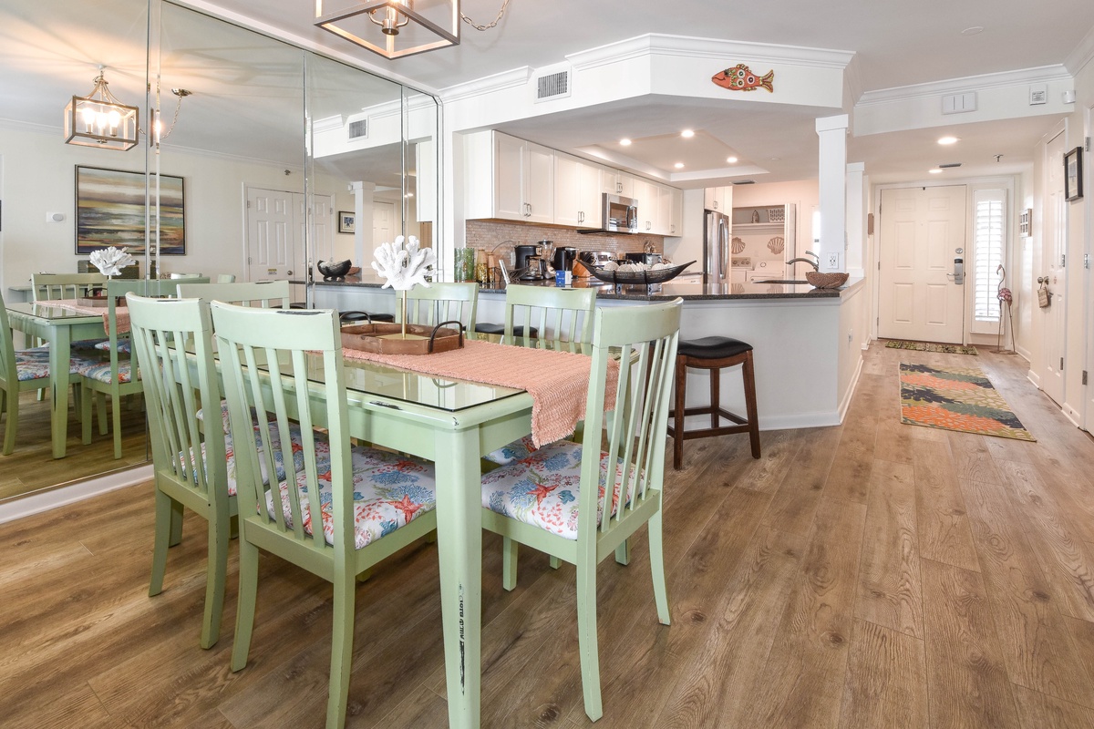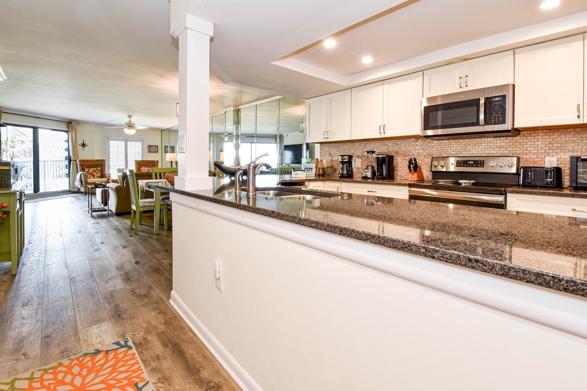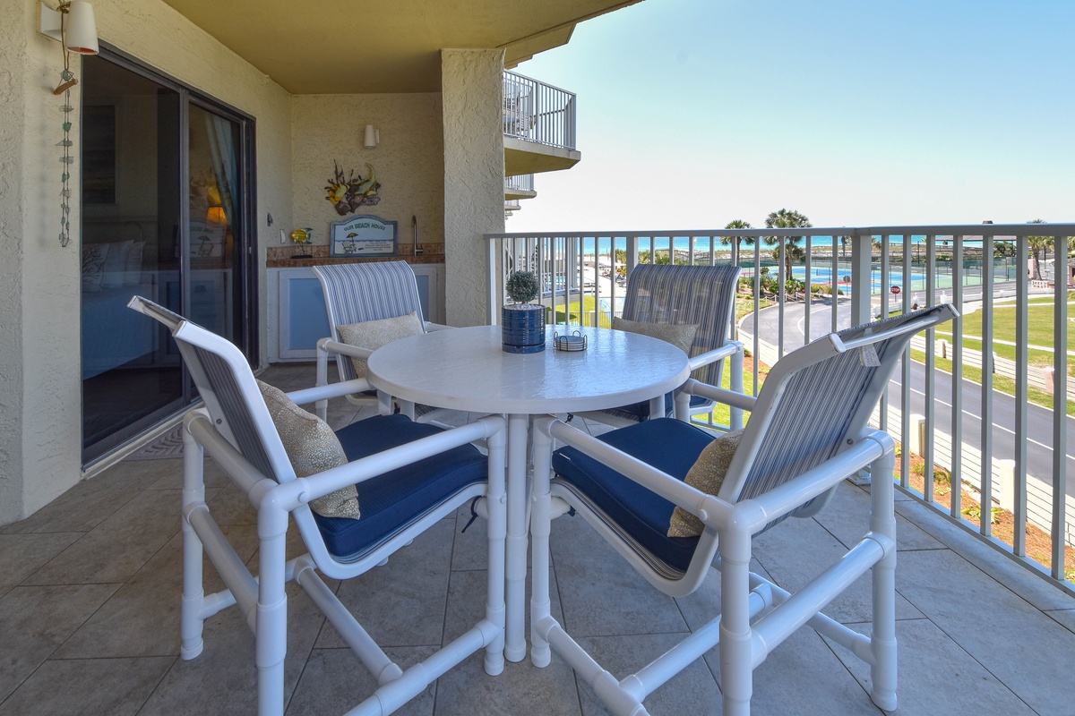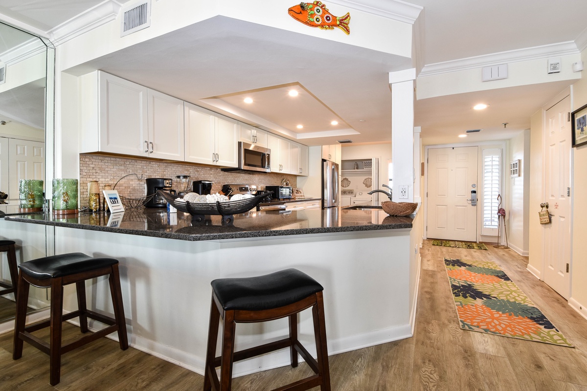 Inlet Reef 216 is decorated with a light and beachy feel to keep the relaxation going even when your feet aren't in the sand. The large and open living area boasts plenty of comfortable seating for the whole group around the smart TV. The couch doubles as a queen sleeper sofa for larger groups. The large sliding doors allow for plenty of natural light while offering access to the spacious private balcony. The balcony features Gulf views, comfortable seating, and a wet bar for plenty of evening drinks and memories to be made. The dining area seats up to six, with additional seating at the adjacent breakfast bar. The fully equipped kitchen has all the cookware, cutlery, and place settings to make homemade meals a breeze. The kitchen also features a built-in ice maker for refreshments, a small breakfast nook, and access to the full-sized washer and dryer.