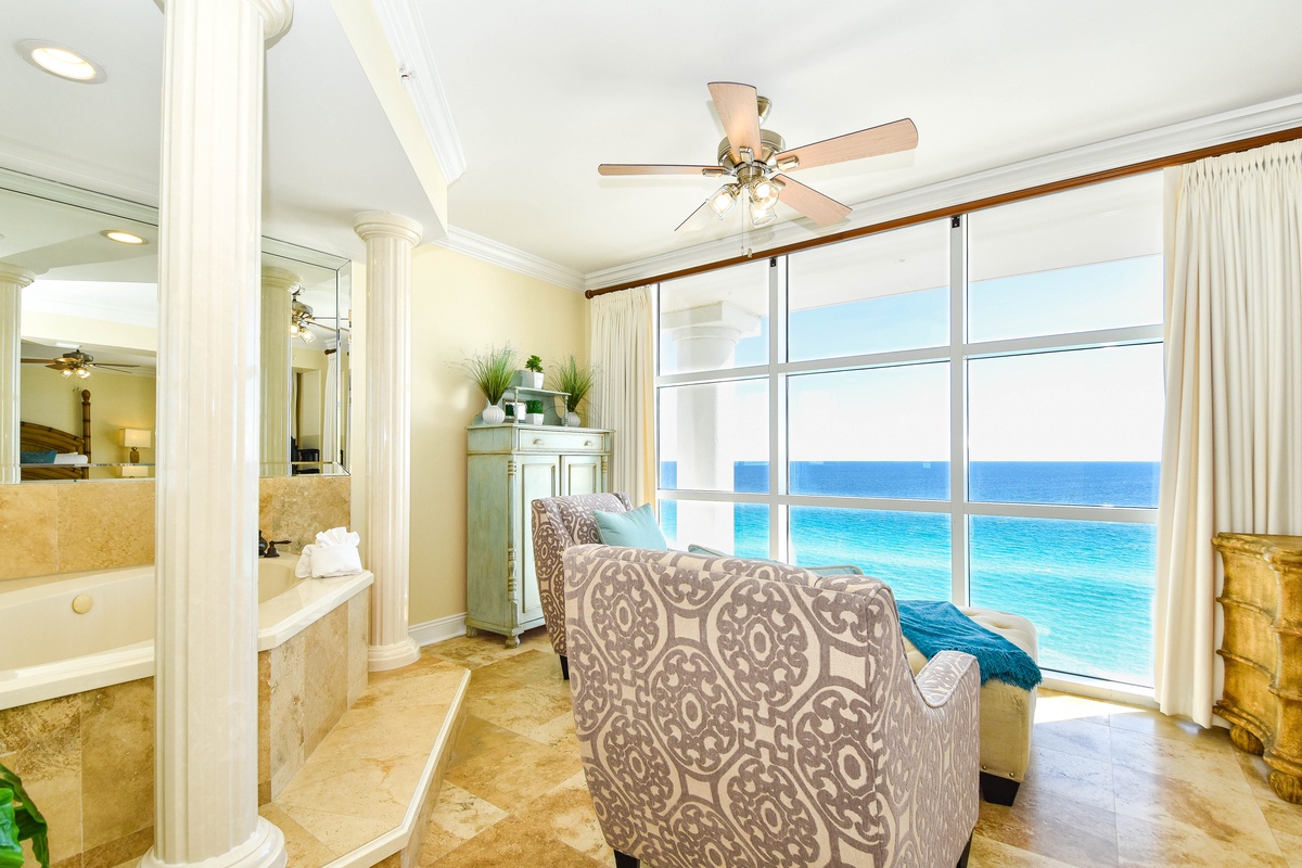 The second floor is home to two guest bedrooms, each with a king bed, and a hall bathroom with a large walk-in shower and soaking tub. The master bedroom, also on the second floor, which offers a king bed, a spacious walk-in closet, a luxurious soaking tub with stunning Gulf views, and a cozy seating area, perfect for relaxing after a long day. The master bath features dual sinks and a large walk-in shower. Step outside onto the private balcony for even more relaxation. For added convenience, a laundry room with a washer and dryer is located on the second floor. Additionally, this penthouse comes with four beach chairs, a wagon, and smart TVs in every bedroom, ensuring that your stay is both comfortable and entertaining. Book your stay at Majestic Sun 1106A and experience why this penthouse will become your favorite vacation destination for years to come.
