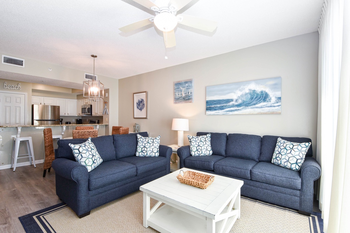 Welcome to Majestic Sun 512B, a coastal-inspired two-bedroom, two-bathroom condo that promises the perfect beach getaway. With stunning Gulf views, a private balcony, and an open floor plan, this inviting space is perfect for relaxing and unwinding. In the evenings, curl up in the living room with a good movie or enjoy your favorite drink while taking in the views from the balcony. The fully equipped kitchen makes it easy to prepare a meal, and the dining area with seating for four, plus three bar stools, is the perfect spot to gather and share memories of the day. The master bedroom offers a king bed, a flat-screen TV, and an attached bathroom with a walk-in shower, providing a peaceful retreat. The guest room features both a queen and twin bed, a flat-screen TV, and quick access to the hallway bathroom with a tub/shower combo. Additional sleeping space in the living room allows the condo to comfortably accommodate up to six guests. For your convenience, there's an in-unit washer and dryer, and two beach chairs with a wagon to take to the sand. Come see why Majestic Sun 512B will become your family's favorite vacation spot for years to come.