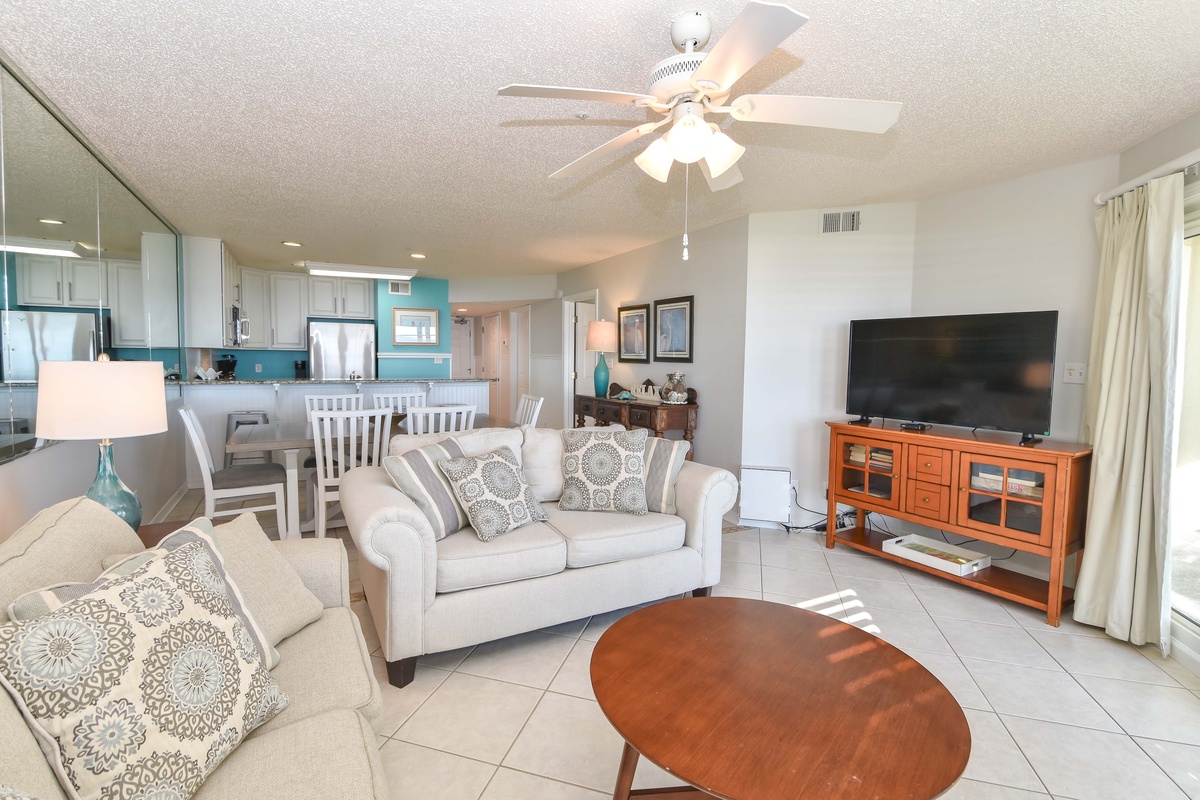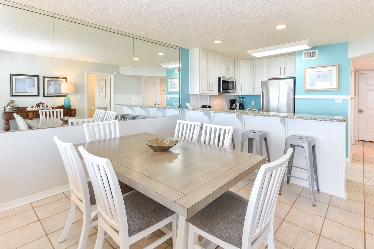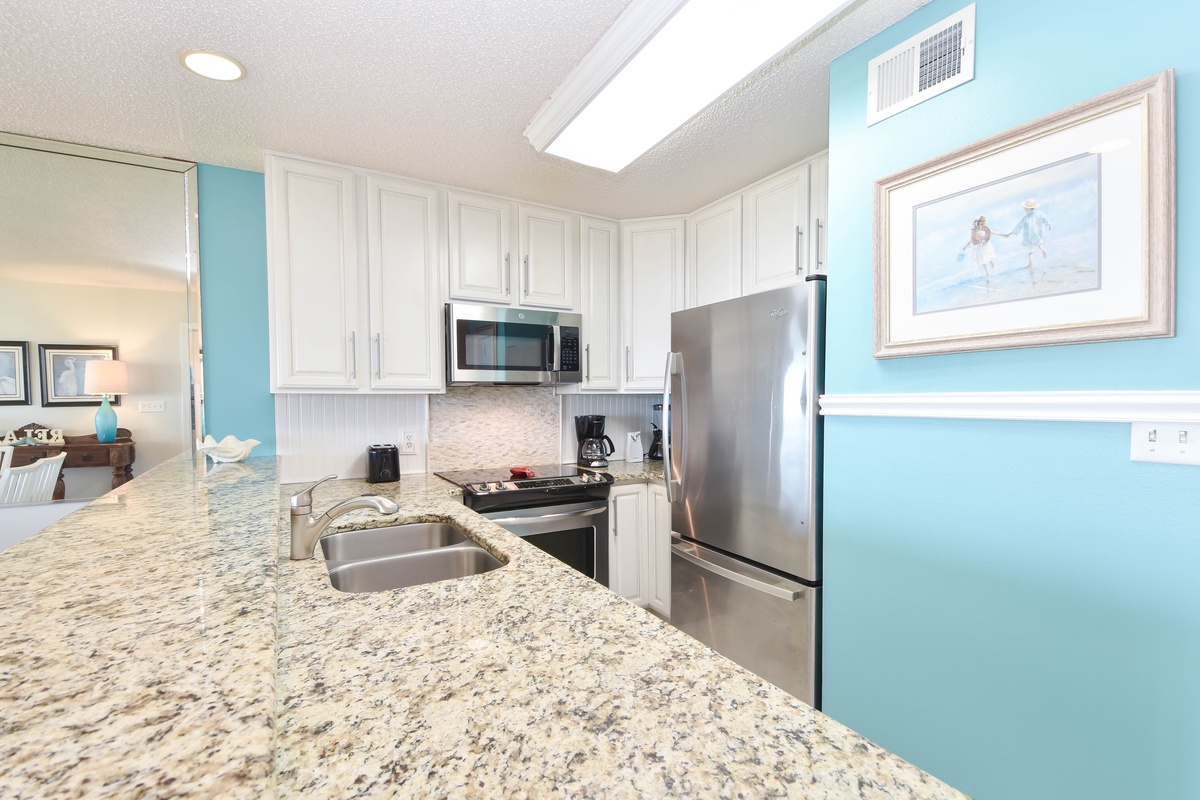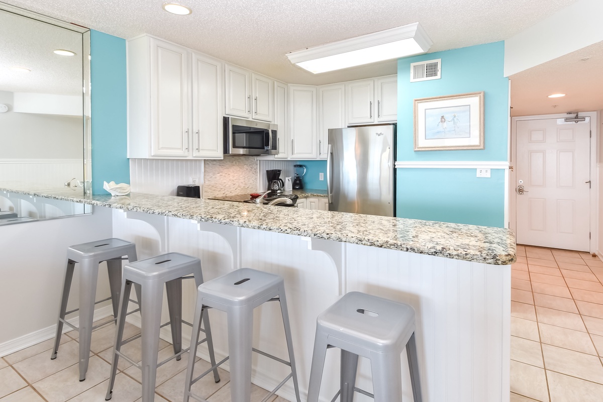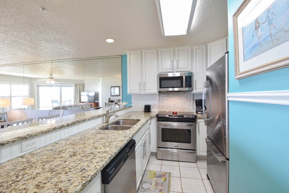 This condo has an open-concept floorplan with a spacious living area perfect for all your family and friends to enjoy after spending the day in the sun. Not to mention the couch converts to a queen sleeper sofa, which is perfect for accommodating larger parties. Your pet will love running across the tile floors unrestricted by bulky room dividers. There's an expansive private balcony accessible from the living area. You can sit back and enjoy the sunrises and sunsets from the serenity of your own private balcony. Adjacent to the living area is the dining area with seating for six. Additional seating for three is located at the breakfast bar. Both are comfortably spaced and suited to meet seating needs for all your family and friends. The fully equipped kitchen has everything you'll need to prepare your favorite recipes in the comfort of your own vacation home.