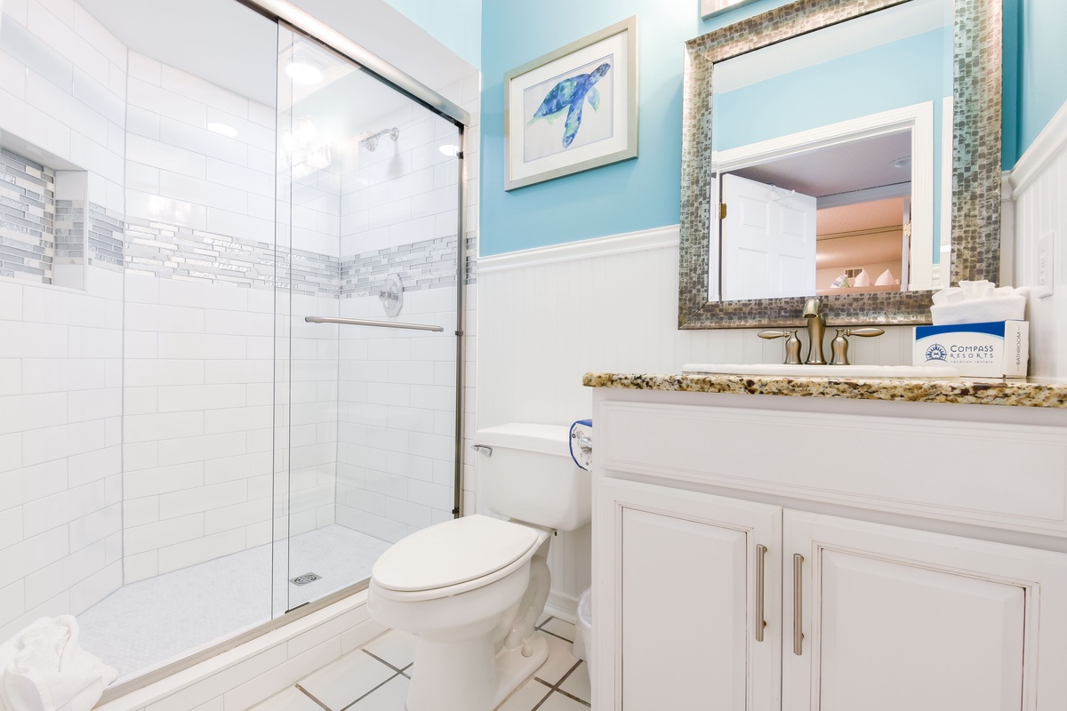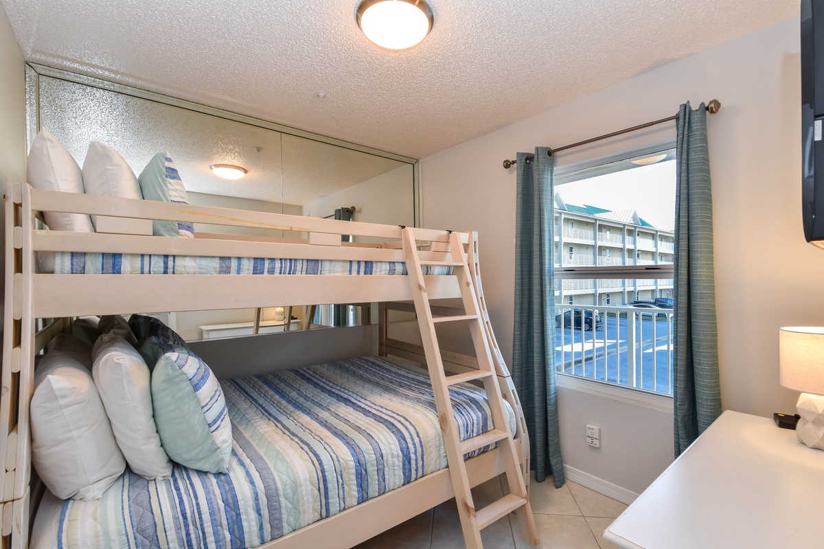 The primary bedroom features a king bed, balcony accessibility, and a full private primary bathroom. The guest bedroom has a twin over full bunk bed, and it's just a few steps from the guest bathroom. That bathroom is easily accessible to everyone in the home.