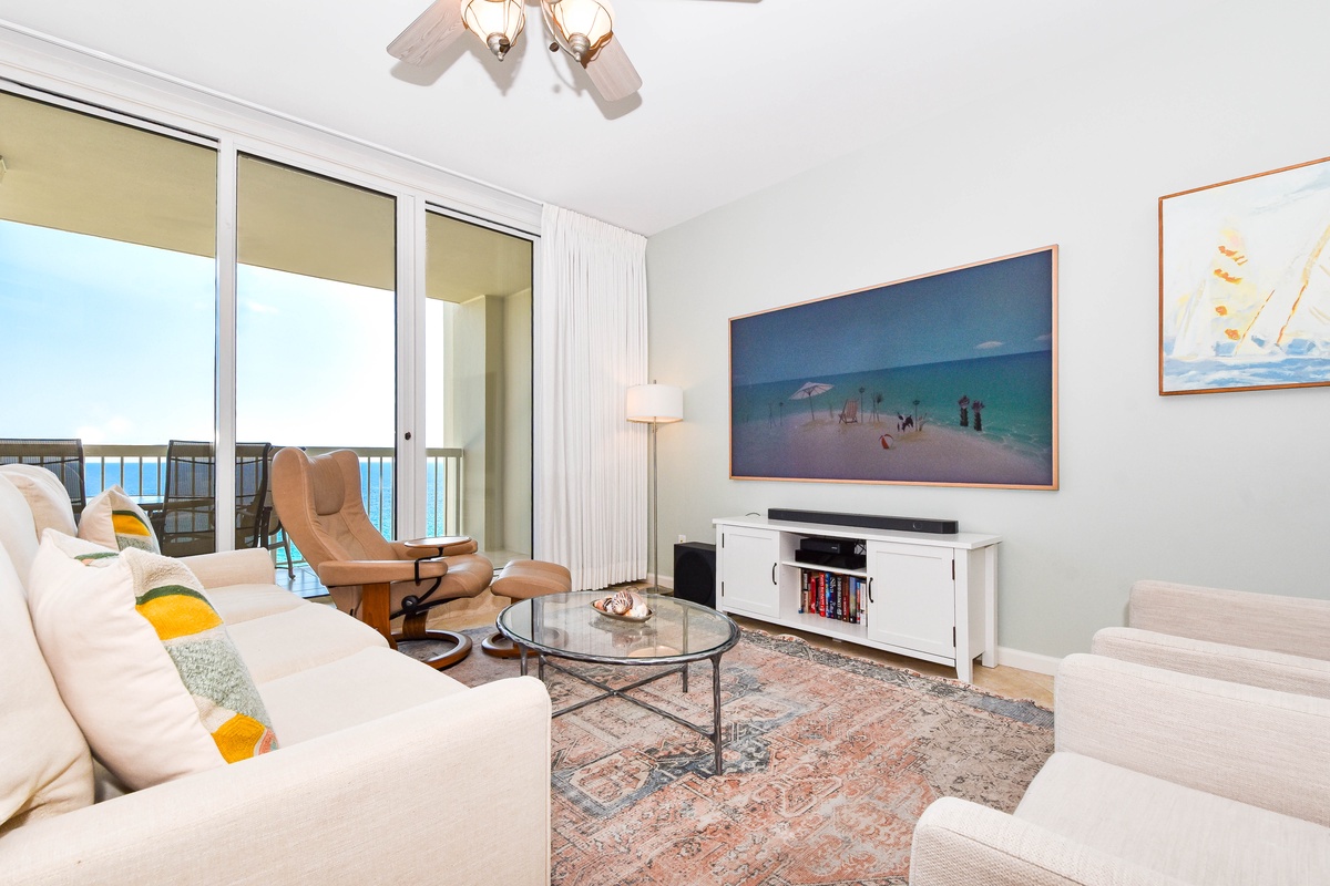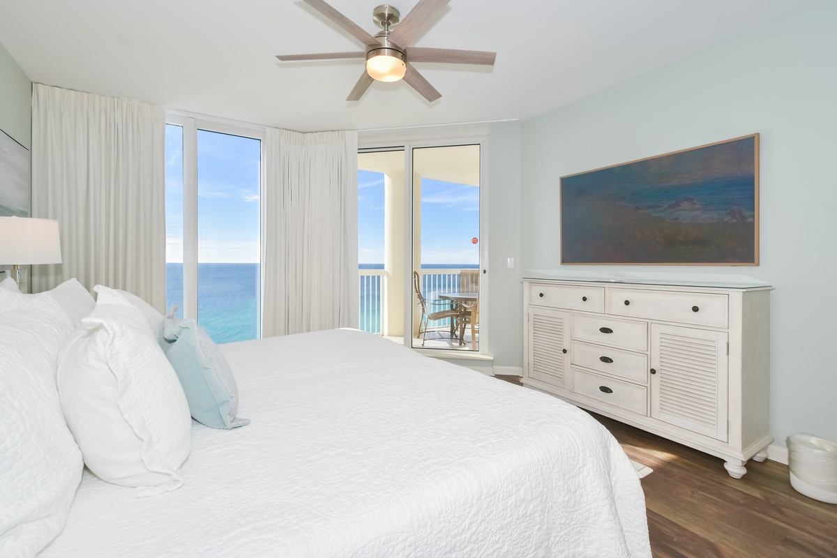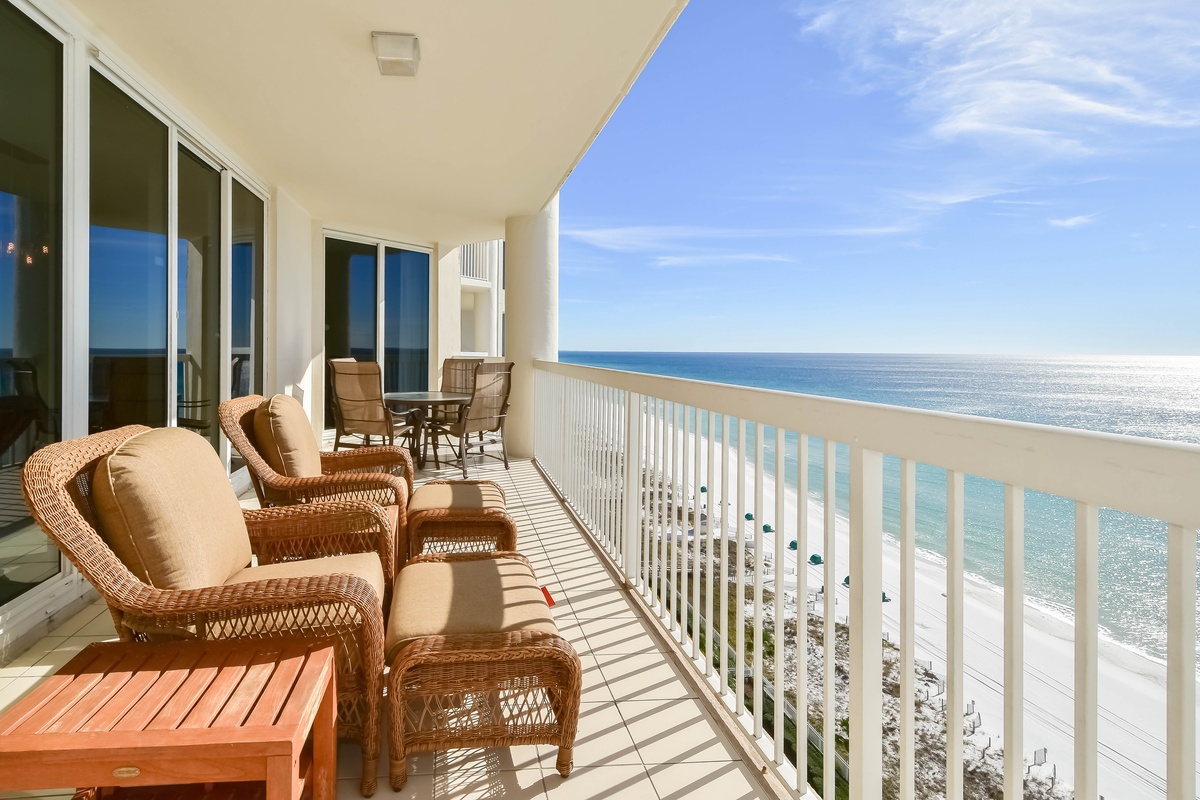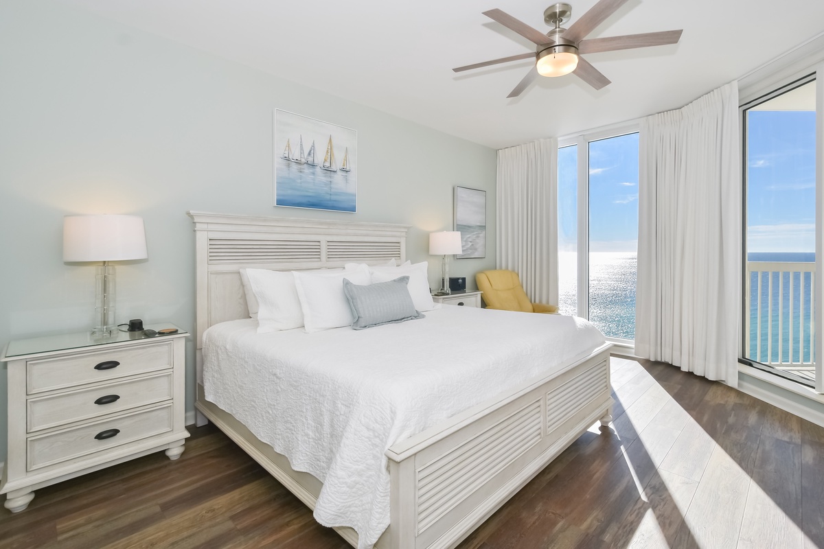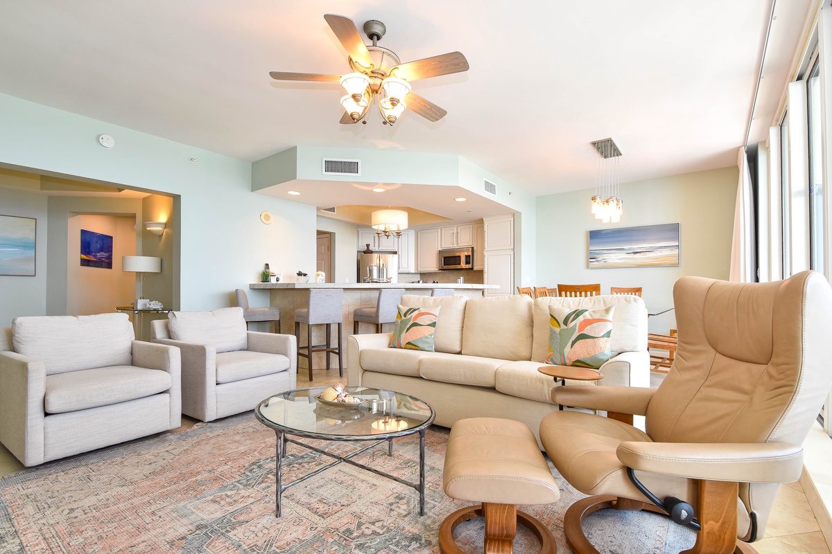 Unwind at Silver Beach Towers East 1404, a stunning 14th-floor beachfront condo in Destin, Florida, offering the perfect blend of comfort, style, and breathtaking Gulf views. This three-bedroom, three-bathroom vacation rental comfortably accommodates up to eight guests, an ideal retreat for families and friends looking to experience the best of the Emerald Coast. Step inside and soak up the sunshine in the open-concept living area, where floor-to-ceiling windows fill the space with natural light and showcase sweeping views of Destin’s sparkling coastline. The inviting living room features cozy seating, including a recliner, making it the perfect place to unwind after a day at the beach, whether you’re watching your favorite show on the flat-screen TV or enjoying a fun game night together. The modern, fully equipped kitchen is a dream for home chefs, complete with stainless-steel appliances, quartz countertops, and ample counter space for preparing delicious meals. Dine together around the table for eight or enjoy casual bites at the breakfast bar with seating for four. The primary suite offers a peaceful retreat with a split adjustable king bed with dual elevation adjustment and vibration controls, balcony access, and stunning Gulf views. The private ensuite bathroom feels spa-like, featuring a walk-in shower and soaking tub, perfect for unwinding at the end of the day. Both guest bedrooms include king beds, TVs, and charming Juliet balconies. One guest bedroom offers an attached private bathroom with a walk-in shower, while the third full bathroom in the hallway features a tub/shower combo. For added convenience there is a queen sleeper sofa in the living room, washer and dryer, complimentary WIFI within the condo, and a UV sanitizing light in the heating/air-conditioning system. Your perfect Destin getaway starts at Silver Beach Towers East 1404, where the beach, the Gulf, and family fun are all just steps away.