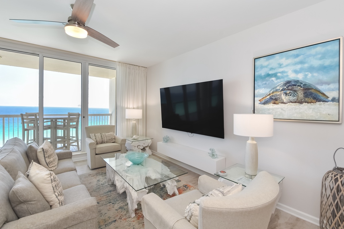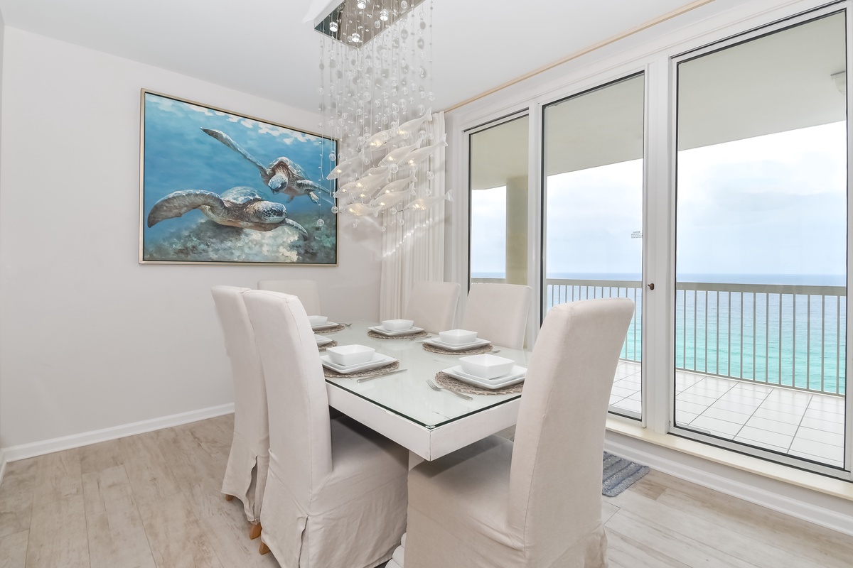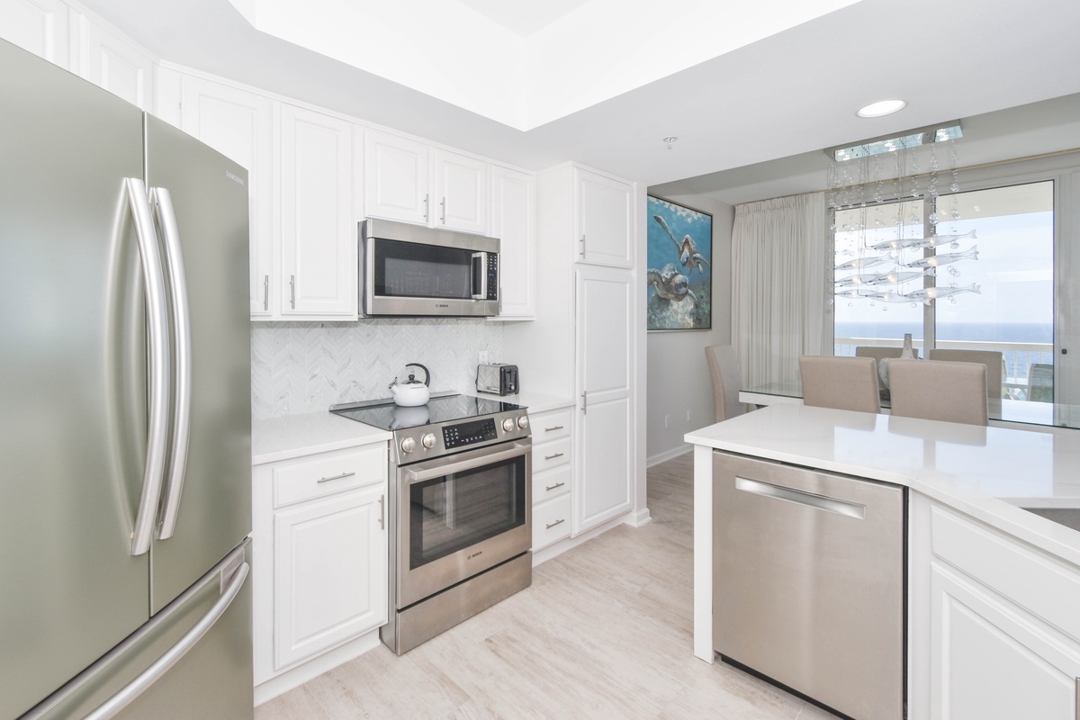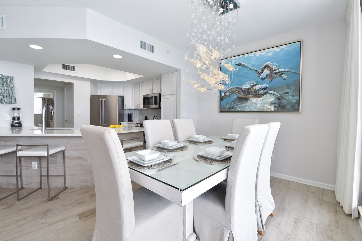 Relax at Silver Beach Towers East 1504. This beachfront condo features three bedrooms and three bathrooms, comfortably accommodating up to eight guests. Located on the fifteenth floor, this beautifully renovated unit offers breathtaking views of the Gulf and a stylish, beach-chic design throughout. Perfectly situated in the heart of Destin, you’ll be just moments away from dining, shopping, and local attractions while enjoying full access to Silver Beach Towers’ premier amenities. The open-concept living area is filled with natural light from floor-to-ceiling windows that lead directly to the furnished beachfront balcony. Relax with family and friends around the impressive 82-inch flat-screen TV, or step outside to take in the stunning views of Destin’s sugar-white sand and emerald waters. The dining area features seating for six beneath a unique statement chandelier, with additional seating for four at the spacious breakfast bar. The fully equipped kitchen is a chef’s dream, complete with full-size appliances, a Bosch stainless steel dishwasher, glass-top range, convection microwave, and a large farmhouse-style sink. You’ll find all the cookware, utensils, and dishware needed to prepare and enjoy meals together. The primary suite offers a king bed, flat-screen TV, and private access to the beachfront balcony. The en-suite bathroom has been fully renovated and features a spa-like walk-in shower, soaking tub, and double vanity. The first guest bedroom includes a king bed, flat-screen TV, and access to a north-facing balcony overlooking the Destin area. The second guest bedroom offers a queen bed, flat-screen TV, and access to a north-facing balcony as well. For added comfort, the living area includes a queen sleeper sofa to accommodate additional guests. Complimentary Wi-Fi is available, and the unit also includes an in-unit washer and dryer. With new tile flooring throughout and thoughtfully curated, high-end furnishings, every detail of this condo has been designed to create a modern and luxurious coastal retreat. Come create lasting memories at Silver Beach Towers East 1504, where elevated design, comfort, and stunning beachfront views come together for the perfect getaway.