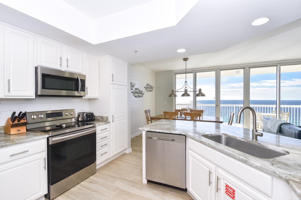 Step into your beachfront escape at Silver Beach Towers East 1604, a stunning sixteenth-floor, three-bedroom, three-bathroom retreat overlooking the emerald waters of the Gulf. From sunrise coffee to sunset relaxation, the balcony provides the perfect setting to soak in the sights and sounds of the Emerald Coast. The open-concept kitchen, dining, and living area is designed for gathering and entertaining. The fully equipped kitchen features full-size stainless-steel appliances and all the cookware and dishware needed for meals at home. The dining table offers seating for six, with additional seating for four at the breakfast bar. The inviting living area includes comfortable furnishings, hardwood flooring, a large flat-screen TV, and floor-to-ceiling windows that showcase the stunning beachfront backdrop. The primary bedroom features a king bed, walk-in closet, flat-screen TV, and direct access to the beachfront balcony. The attached primary bathroom includes a garden tub, walk-in shower, and double vanity, creating a relaxing retreat. The first guest bedroom offers a king bed, flat-screen TV, private bathroom with a walk-in shower, and access to the north-facing balcony overlooking Destin. The second guest bedroom features two full beds, a flat-screen TV, and access to the north balcony. A full guest bathroom with a tub and shower combination is conveniently located nearby. For added convenience, this condo includes complimentary Wi-Fi and an in-unit washer and dryer. Enjoy access to Silver Beach Towers’ exceptional amenities, including two beachfront pools, hot tubs, and a tennis court, all within a prime Destin location close to shopping, dining, and entertainment. Book your stay at Silver Beach Towers East 1604 and experience beachfront vacationing at its finest.
