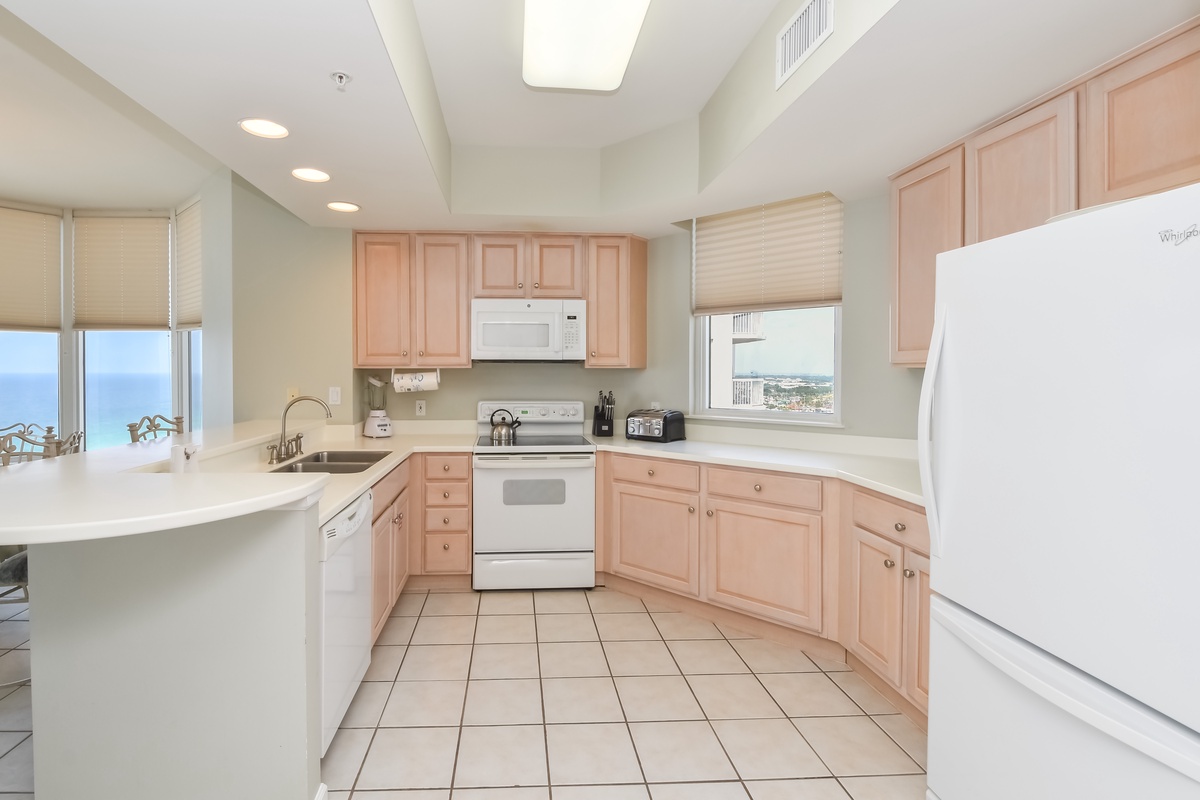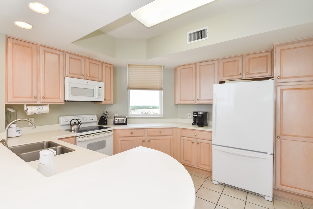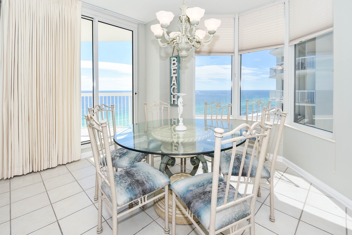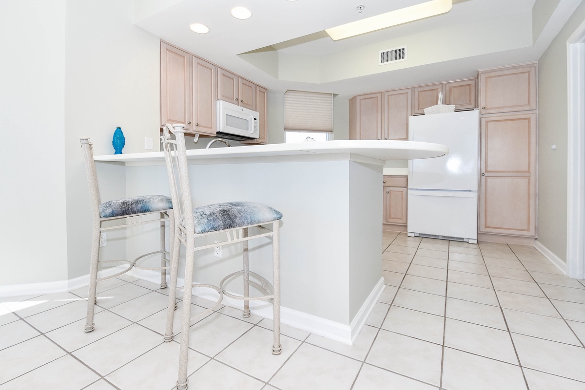 East 1606 is an end condo with extra space inside and out. The condo offers a coastal feel with an inviting, spacious open-concept living area. You’ll find the perfect space for family and friends to relax together around the large flat-screen TV. The couch even converts to a queen sleeper sofa to accommodate larger parties. The south wall has floor-to-ceiling windows that open directly onto the expansive furnished beachfront balcony. The dining area offers seating for seven with an additional two seats at the breakfast bar. The fully equipped kitchen features full-size appliances and includes all the cookware and dishware needed to create memorable meals together.