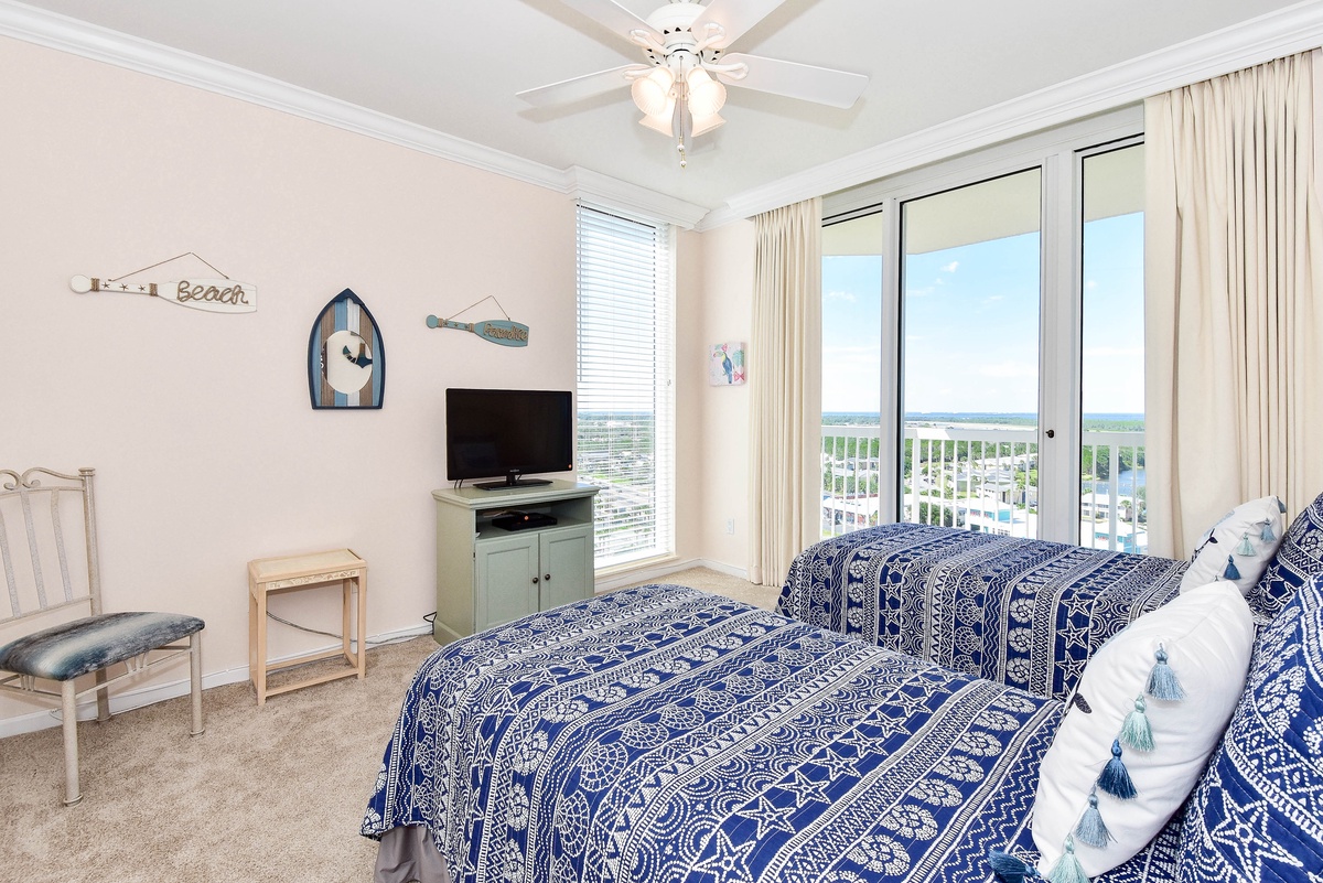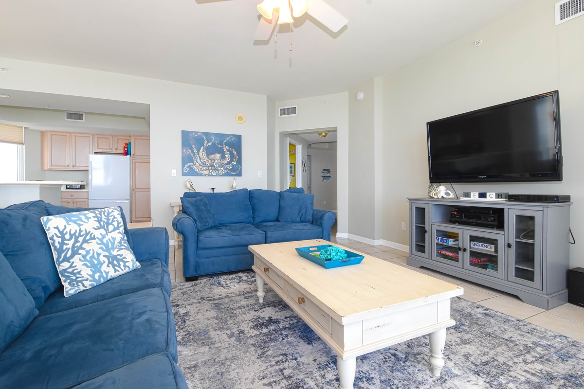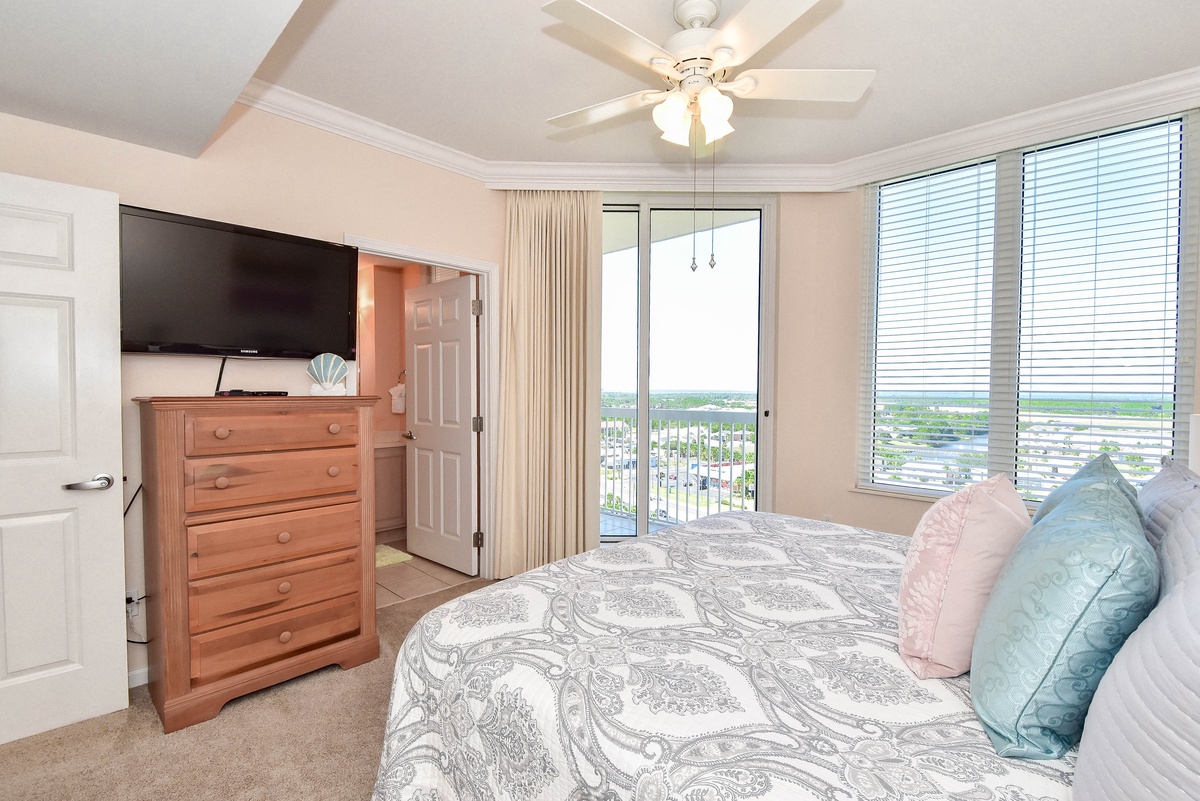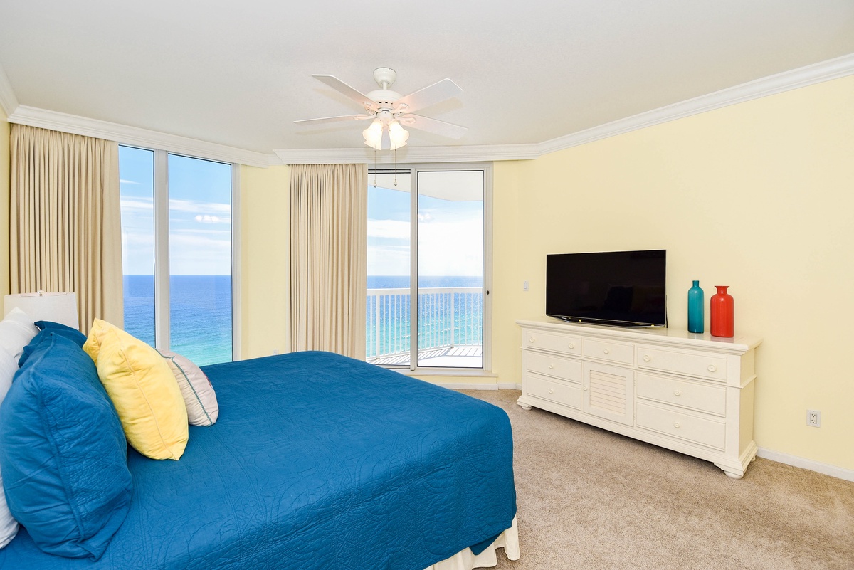 The master bedroom has a king bed, walk-in closet, flat-screen TV, and private access to the beachfront balcony. The master bathroom features a jetted bathtub, walk-in shower, and double vanity. The first guest bedroom has a king bed, a flat-screen TV, and private access to the north balcony overlooking the greater Destin area. The second guest bedroom has two twin beds, a flat-screen TV, and access to the north balcony. Just steps from both the second guest bedroom and living area is a full guest bathroom with a walk-in shower.