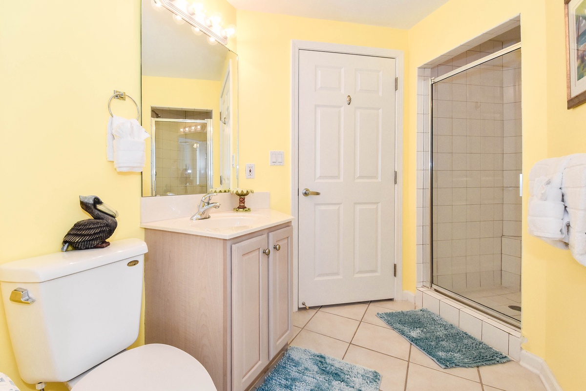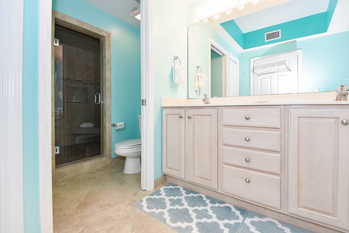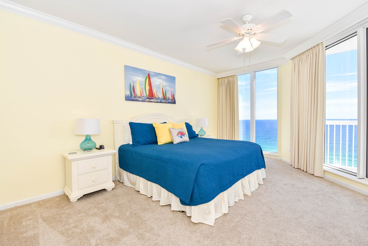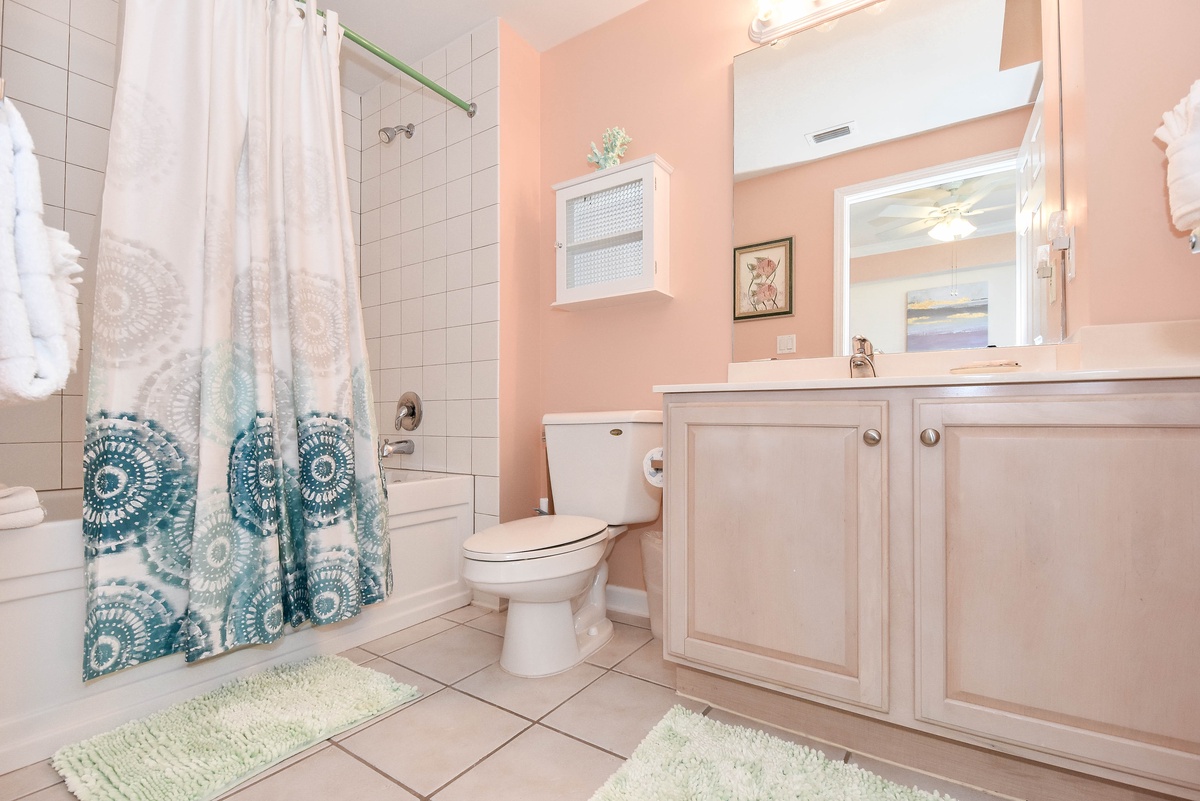 The master bedroom has a king bed, walk-in closet, flat-screen TV, and private access to the beachfront balcony. The master bathroom features a jetted bathtub, walk-in shower, and double vanity. The first guest bedroom has a king bed, a flat-screen TV, and private access to the north balcony overlooking the greater Destin area. The second guest bedroom has two twin beds, a flat-screen TV, and access to the north balcony. Just steps from both the second guest bedroom and living area is a full guest bathroom with a walk-in shower.