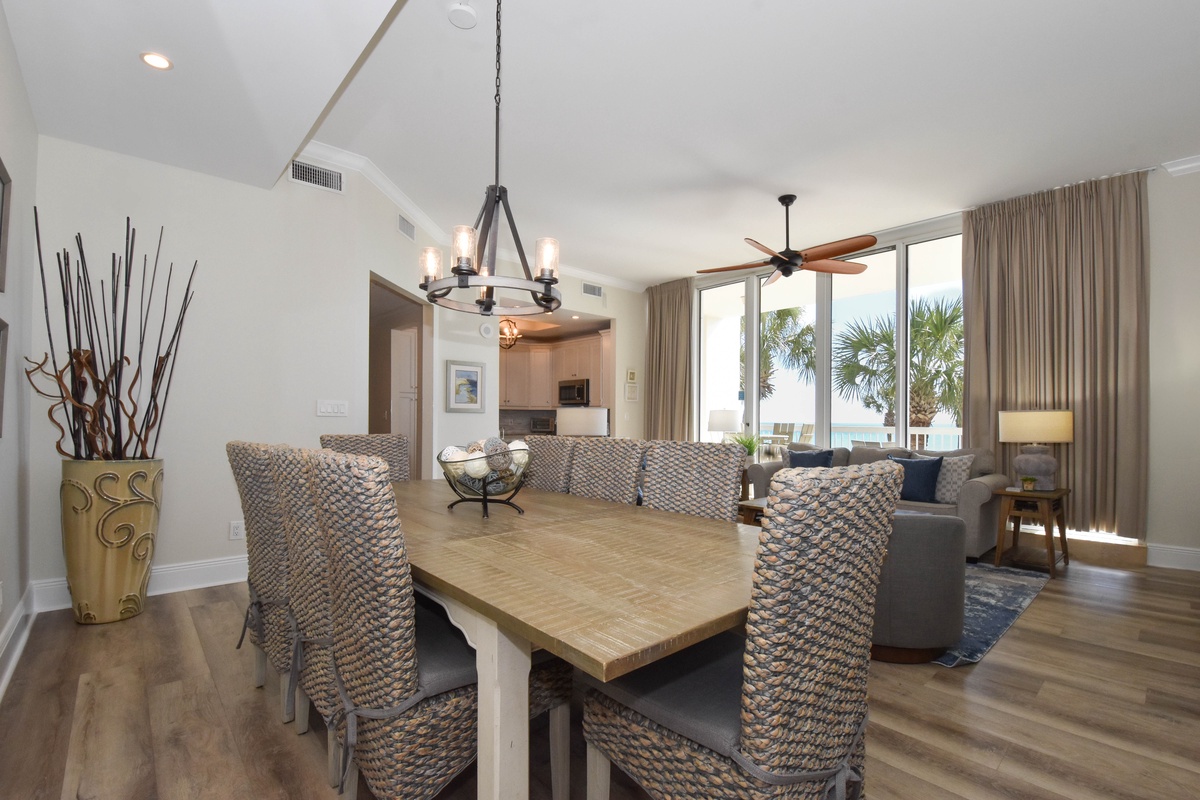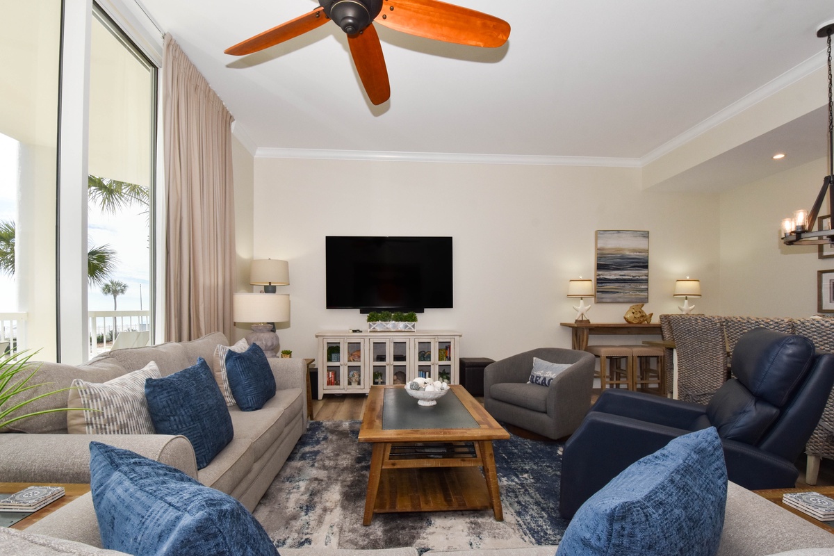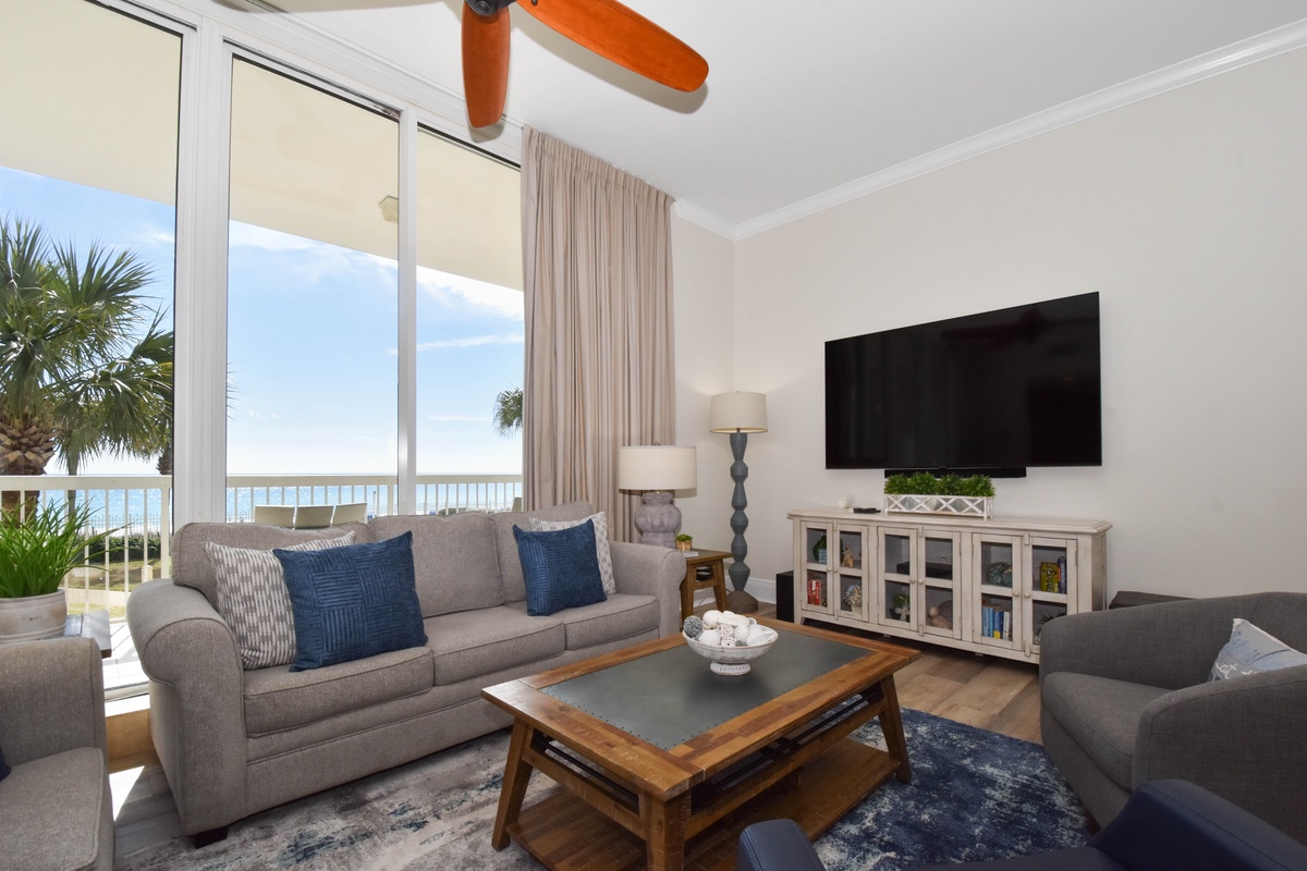 Welcome to Silver Beach Towers East 202, a bright and welcoming three-bedroom, three-bathroom beachfront condo located on the second floor. This cheerful coastal retreat features an open-concept living area filled with natural light from floor-to-ceiling windows, comfortable seating centered around a large flat-screen TV, and an updated kitchen with full-size appliances, sleek countertops, and everything you need to prepare meals together. The dining table offers seating for eight with an additional four seats at the breakfast bar. Step onto the spacious beachfront balcony to enjoy the sea breeze and endless shoreline views. The primary suite offers a king bed, walk-in closet, private balcony access, and a large en-suite bathroom with a soaking tub, walk-in shower, and double vanity. The first guest bedroom includes a king bed, a 55-inch smart TV, and access to the beachfront balcony, along with a convenient en-suite bathroom. The second guest bedroom features a king bed, a 55-inch smart TV, private access to the beachfront balcony, and an en-suite bathroom with a walk-in shower. For added convenience, the condo offers complimentary Wi-Fi, an in-unit washer and dryer, and additional sleeping accommodations with a queen sleeper sofa in the living area. Guests of Silver Beach Towers East 202 also enjoy access to two beachfront pools, hot tubs, tennis courts, and direct beach access. With its stunning views and comfortable layout, East 202 is the perfect choice for your next Destin vacation.
