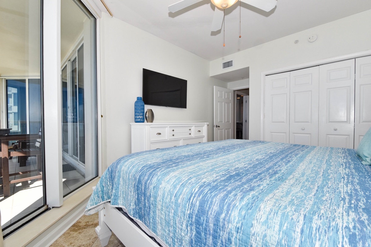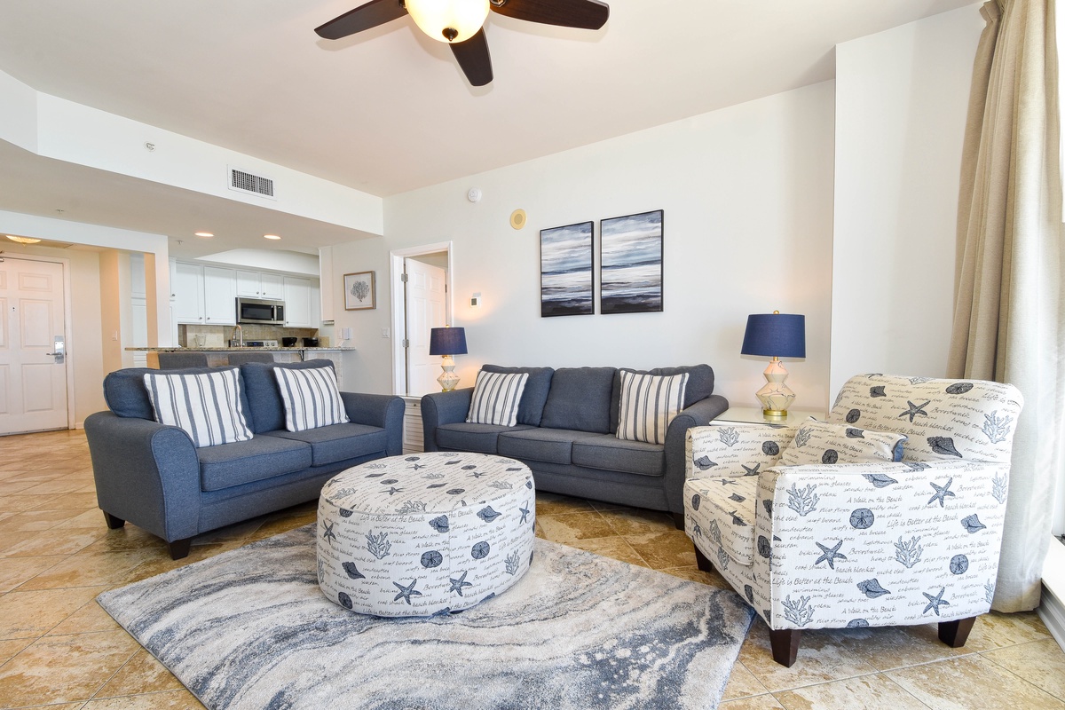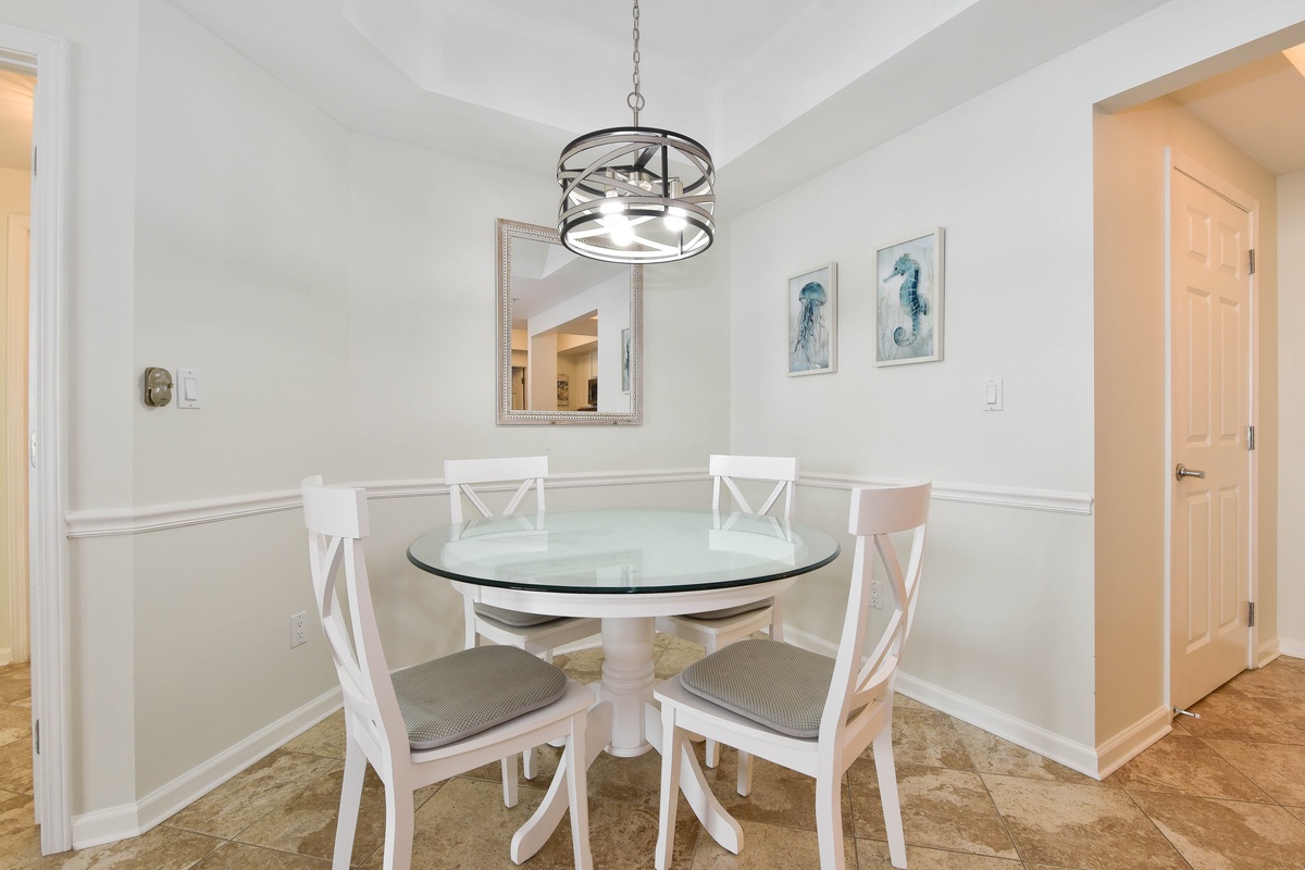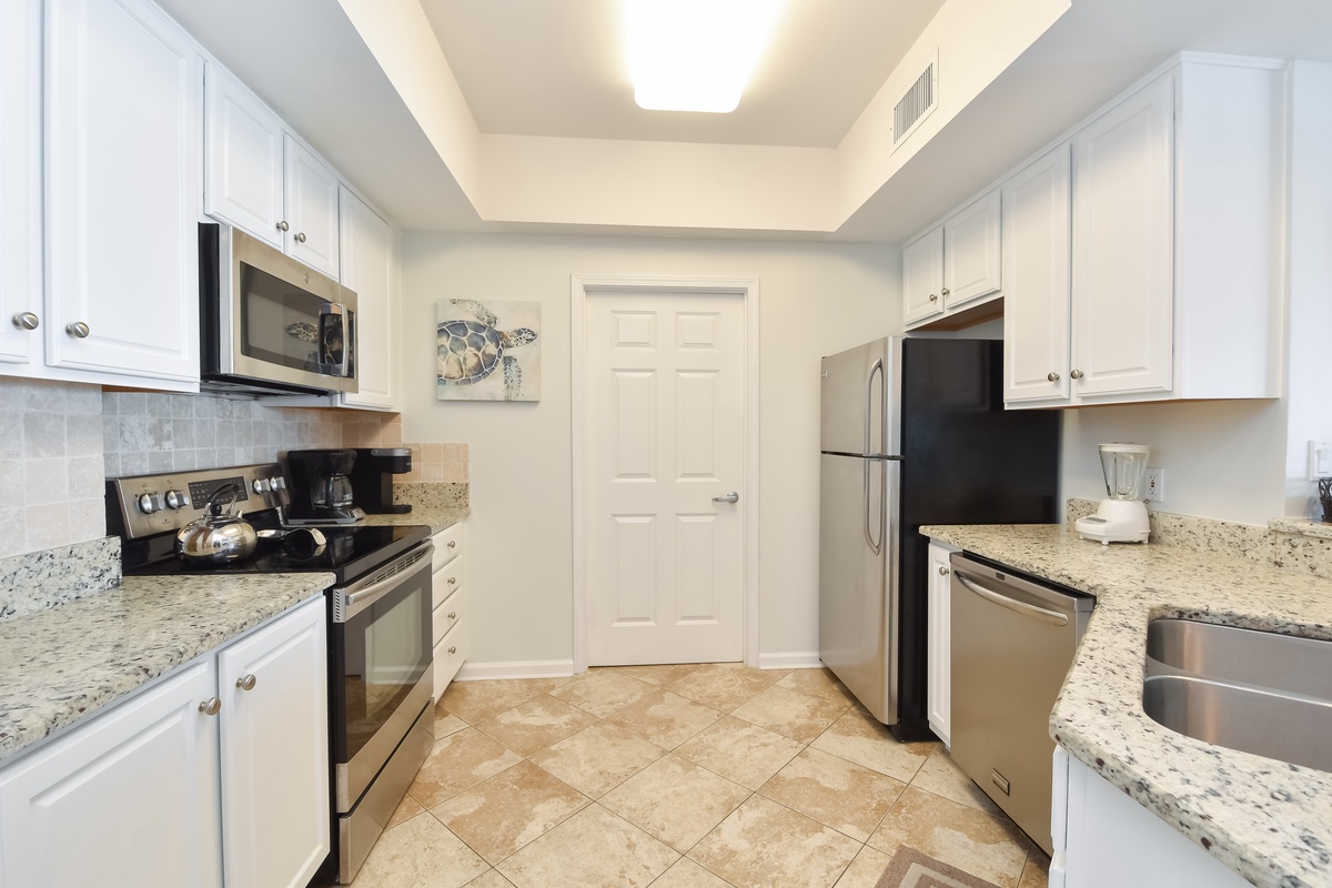East 402 offers a seaside feel with an inviting open-concept living area with travertine tile flooring. You’ll find the perfect space for family and friends to relax together around the large flat-screen TV. The couch even converts to a queen sleeper sofa to accommodate larger parties. The south wall has floor-to-ceiling windows that open directly onto the furnished beachfront balcony. The dining area offers seating for four. The fully equipped kitchen features full-size stainless-steel appliances and includes all the cookware and dishware needed to create memorable meals together. Just off of the kitchen is a laundry room equipped with a full-sized washer and dryer set so you can keep your clothing and beach towels clean and dry throughout your stay.