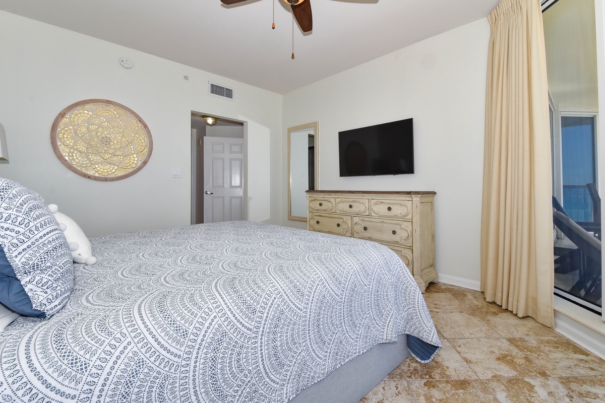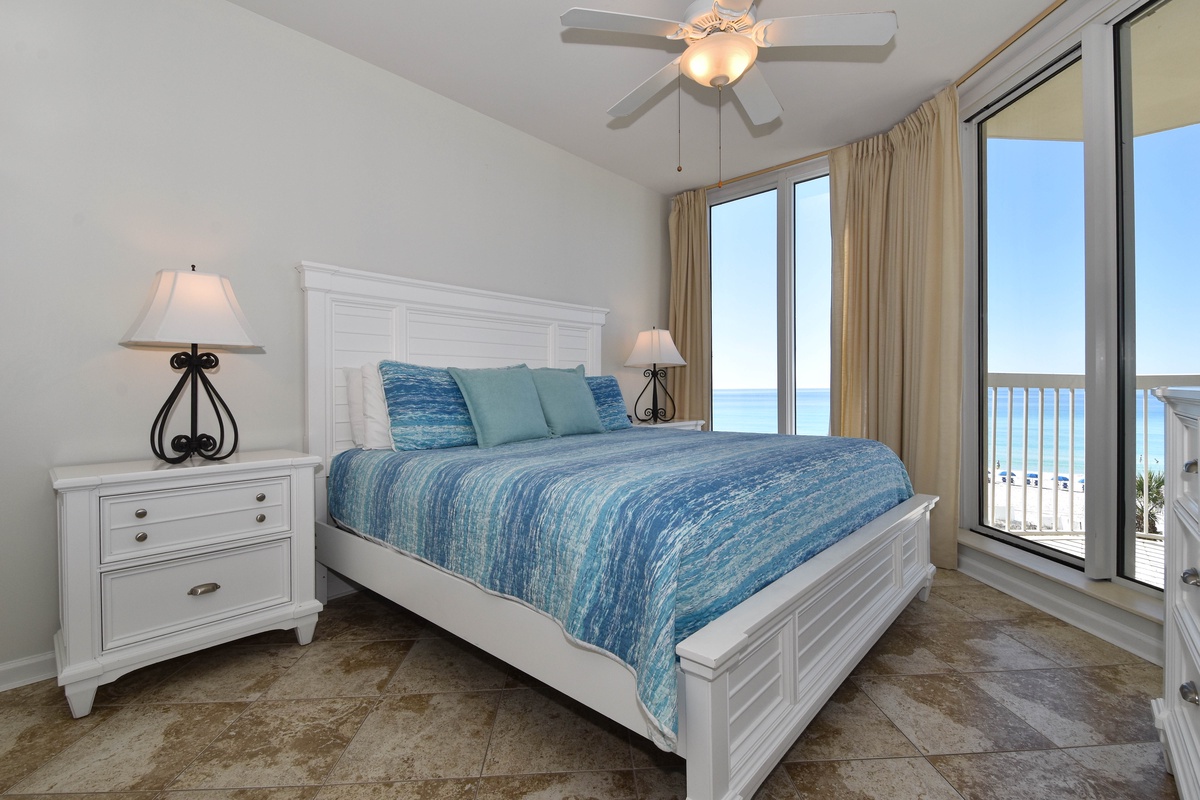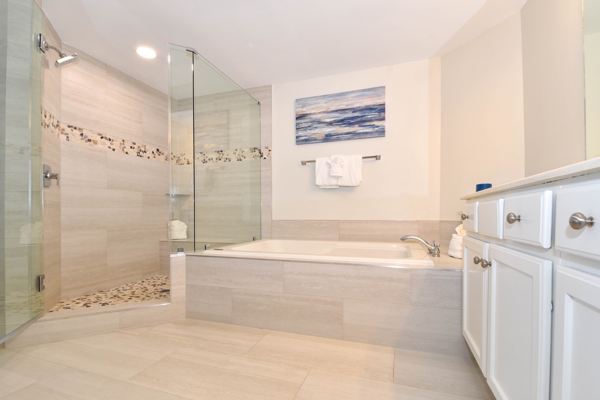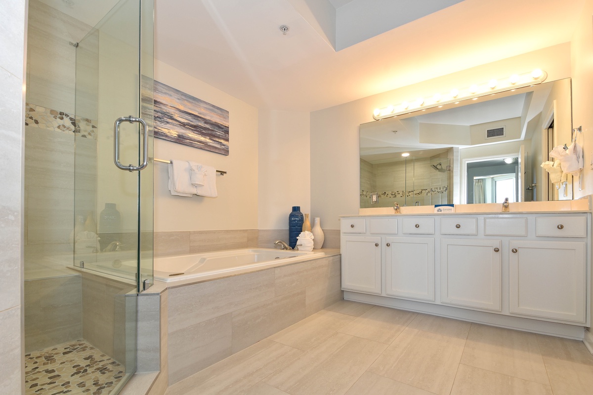 The master bedroom has a king bed, walk-in closet, flat-screen TV, and private access to the beachfront balcony. The master bathroom features exquisite tile, a large jacuzzi bathtub, a tiled walk-in shower, and double vanity. The guest bedroom has a king bed, a flat-screen TV, and private access to the beachfront balcony. Only steps from both the guest bedroom and living area is a full guest bathroom with a walk-in shower.
