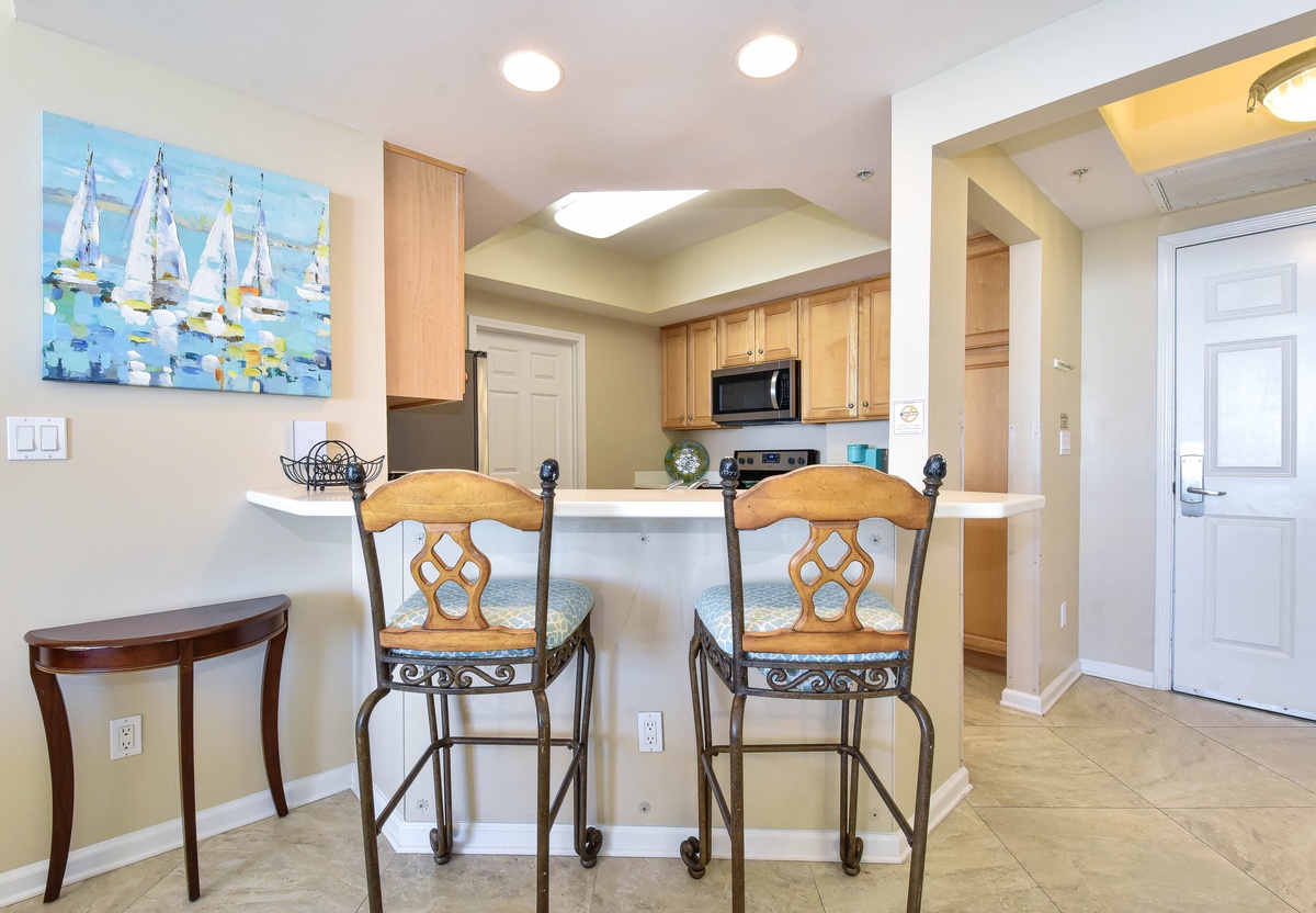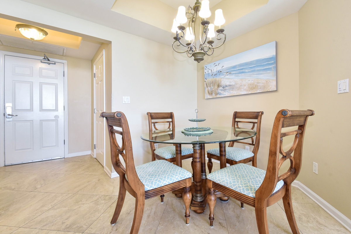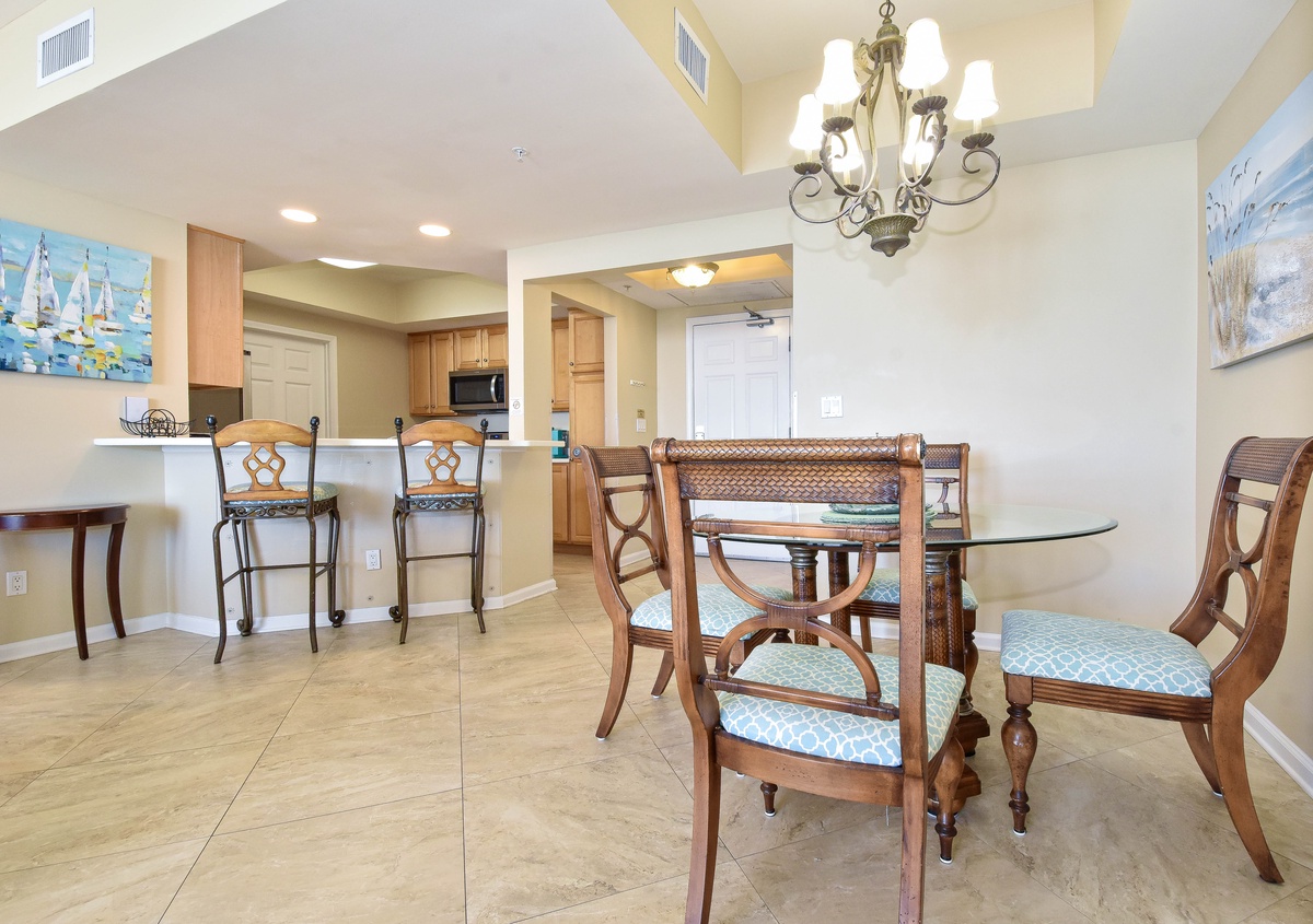 East 605 offers a cool, Caribbean feel with an inviting open-concept, tiled living area. You’ll find the perfect space for family and friends to relax together around the large flat-screen TV. The couch even converts to a queen sleeper sofa to accommodate larger parties. The south wall has floor-to-ceiling windows that open directly onto the furnished beachfront balcony. The dining area offers seating for four and two additional seats at the breakfast bar. The fully equipped kitchen features full-size stainless-steel appliances and includes all the cookware and dishware needed to create memorable meals together. The laundry area is just off the kitchen and comes complete with a full-size washer and dryer.
