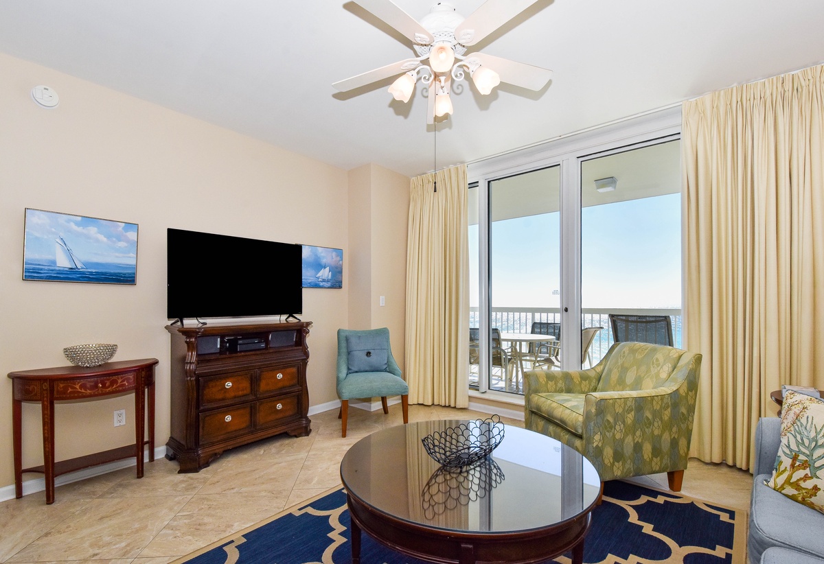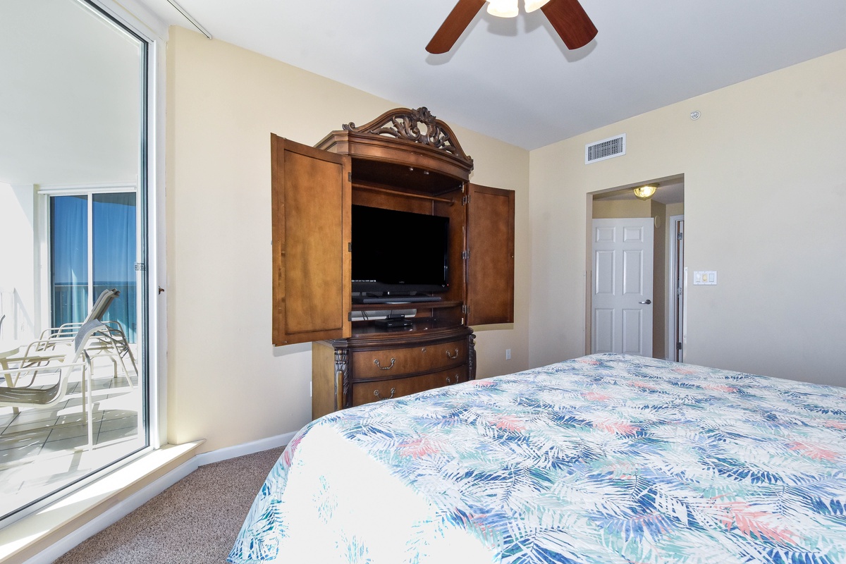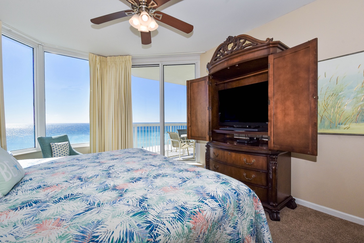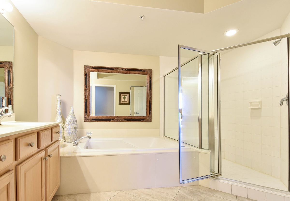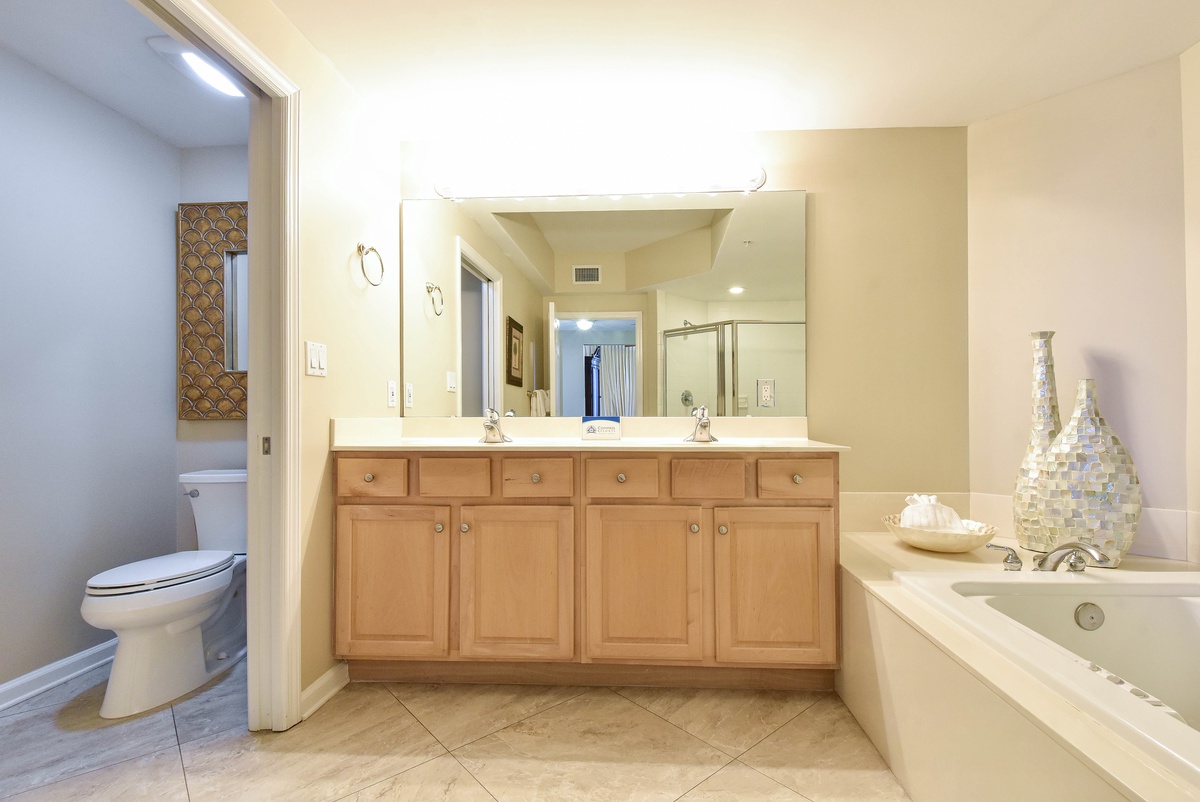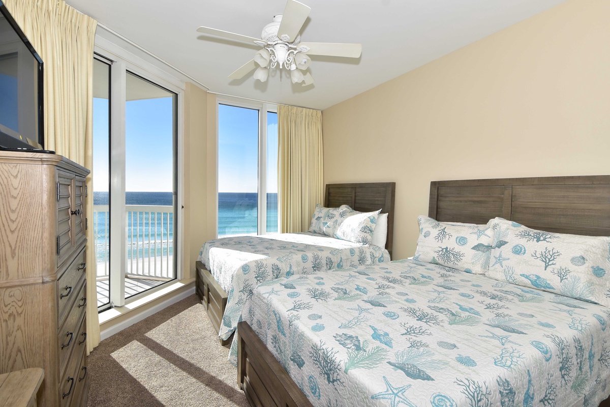 The master bedroom has a king bed, walk-in closet, flat-screen TV, and private access to the beachfront balcony. The master bathroom features a jetted bathtub, walk-in shower with a built-in bench, and double vanity. The guest bedroom has two full size beds, a flat-screen TV, and private access to the beachfront balcony. Just steps from both the guest bedroom and living area is a full guest bathroom with a walk-in shower.