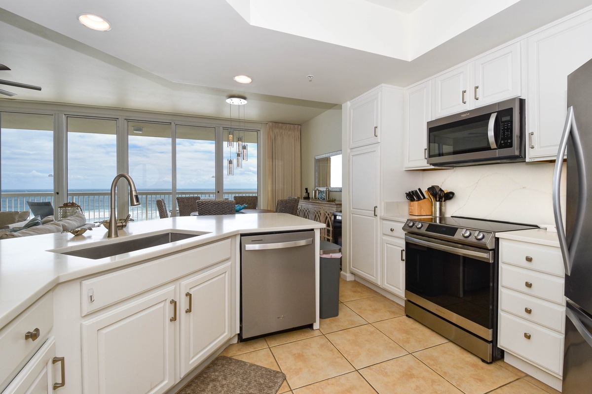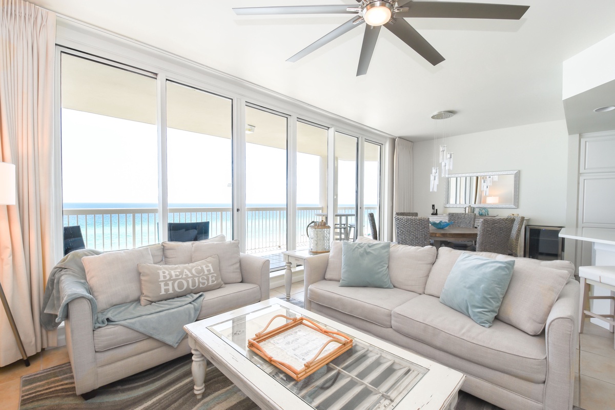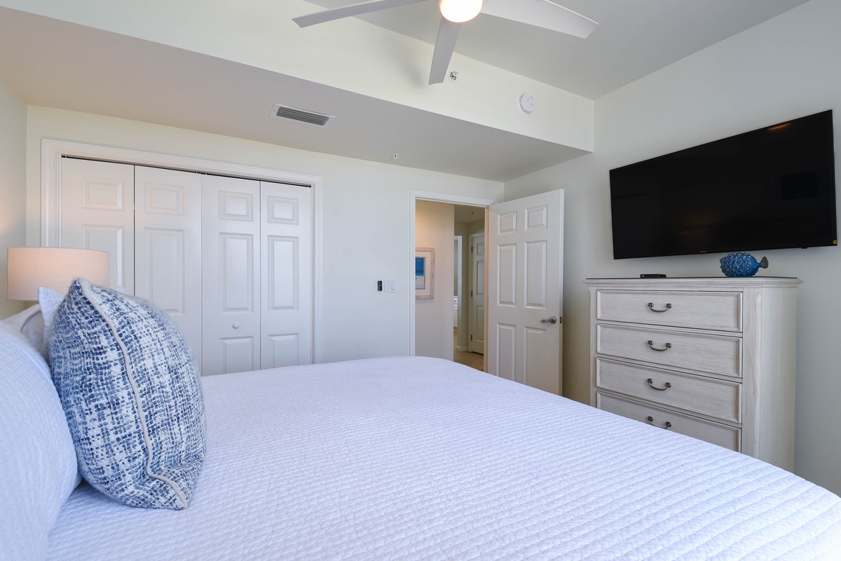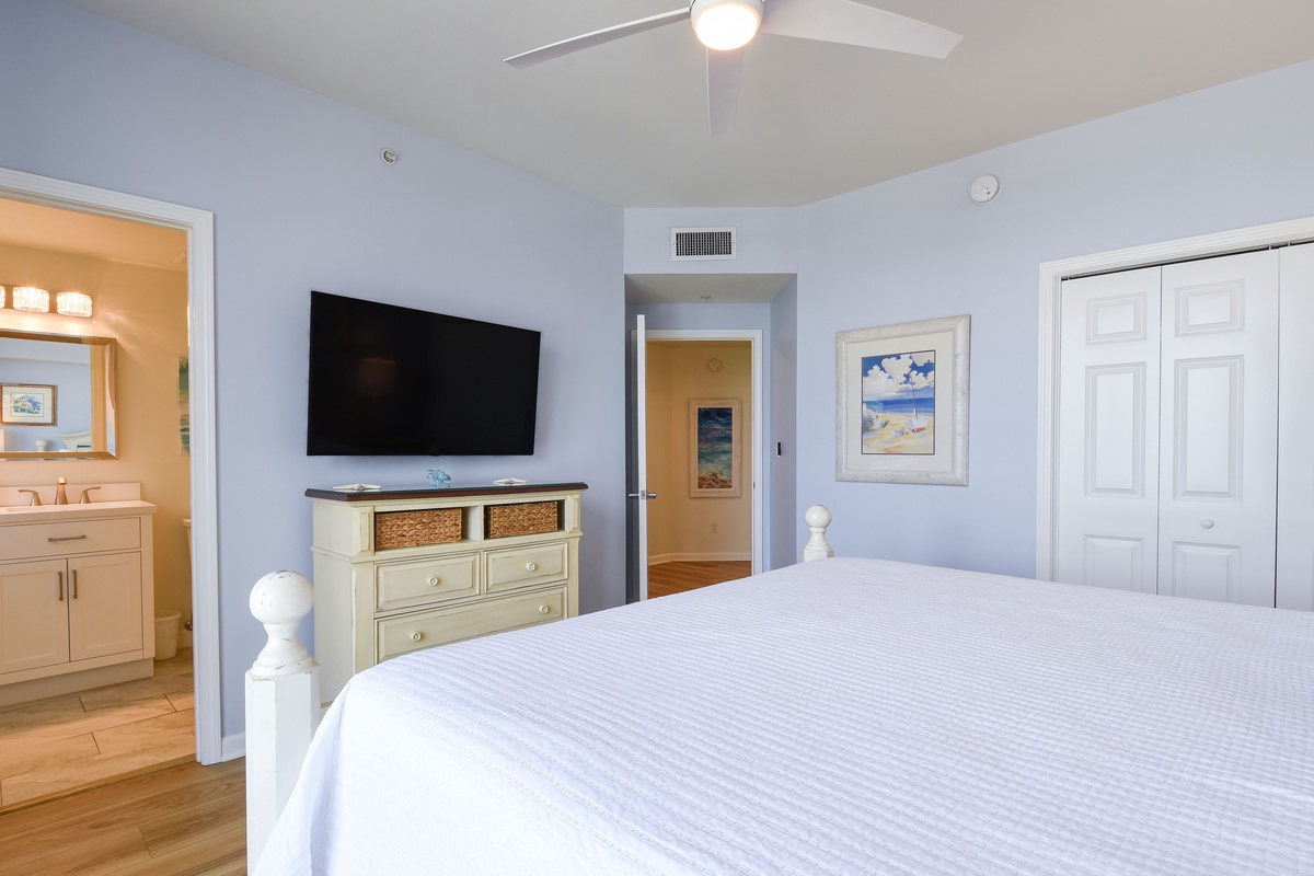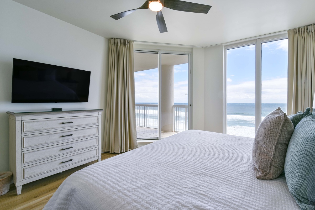 The master bedroom has a king bed, walk-in closet, flat-screen TV, and private access to the beachfront balcony. The master bathroom features gorgeous spacious walk-in shower for two, and a double vanity with in-mirror lighting. The first guest bedroom has a king bed, a flat-screen TV, and private access to the north balcony overlooking the greater Destin area. Just steps from both the first guest bedroom and living area is a full guest bathroom with a shower tub. The second guest bedroom has a king bed, flat-screen TV, and a private bathroom with a tiled walk-in shower.