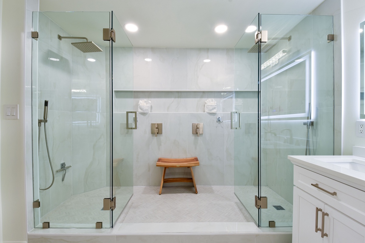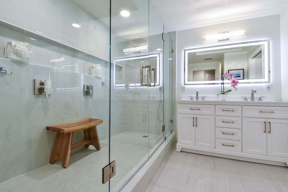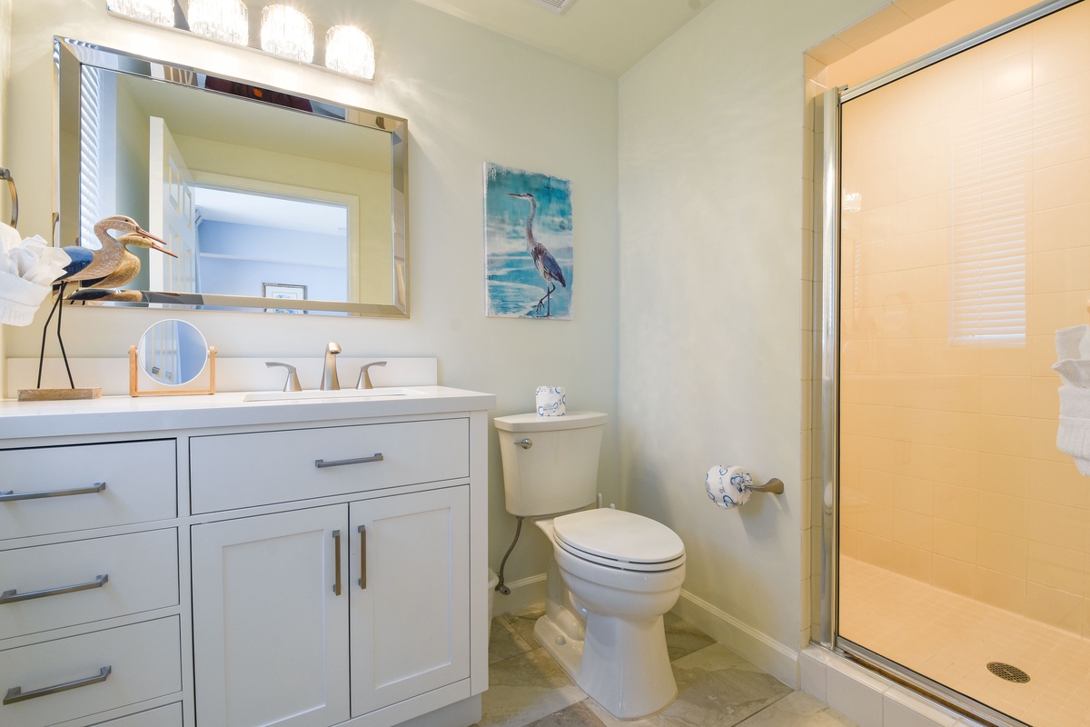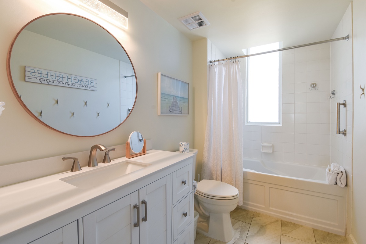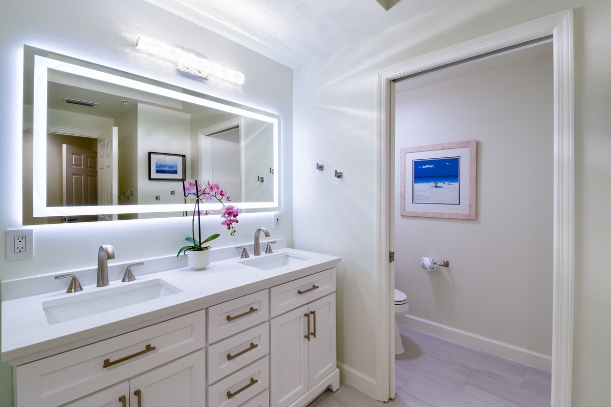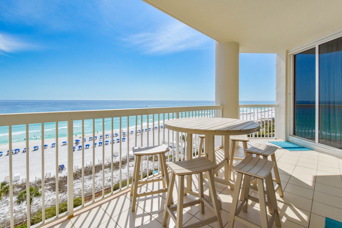 The master bedroom has a king bed, walk-in closet, flat-screen TV, and private access to the beachfront balcony. The master bathroom features gorgeous spacious walk-in shower for two, and a double vanity with in-mirror lighting. The first guest bedroom has a king bed, a flat-screen TV, and private access to the north balcony overlooking the greater Destin area. Just steps from both the first guest bedroom and living area is a full guest bathroom with a shower tub. The second guest bedroom has a king bed, flat-screen TV, and a private bathroom with a tiled walk-in shower.