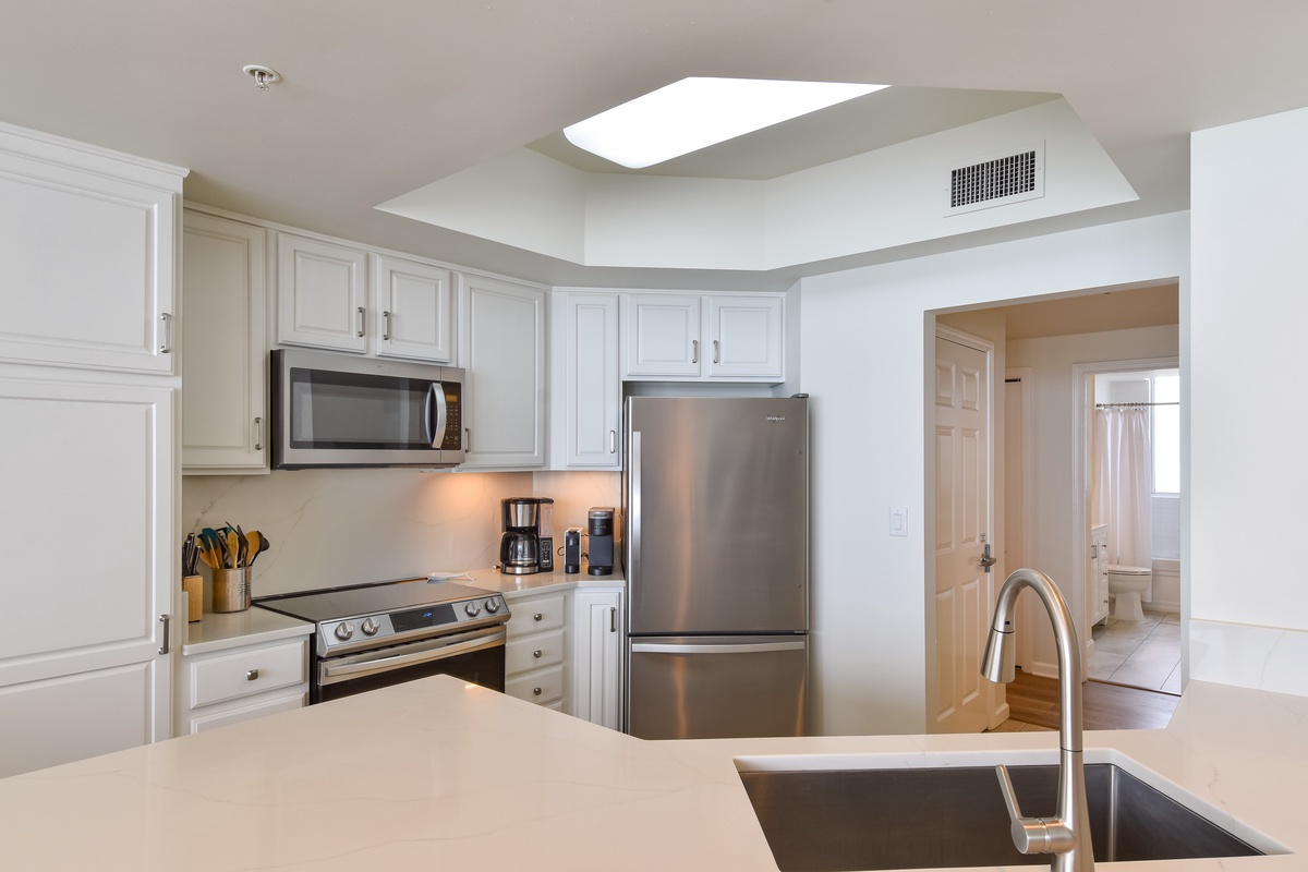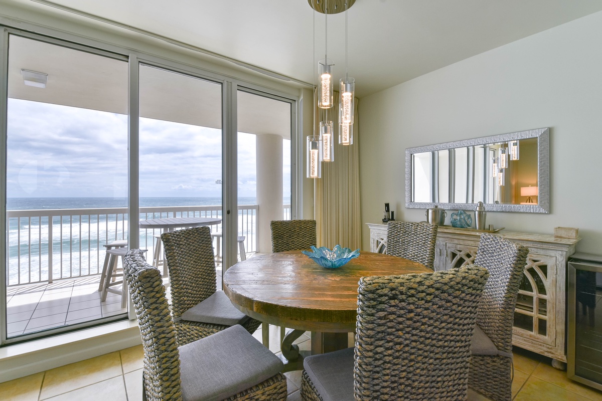 East 703 offers a calm, cool, coastal feel with an inviting open-concept living area. You’ll find the perfect space for family and friends to relax together around the large flat-screen TV. The couches even convert to a Queen Sleeper Sofa and a Twin Sleeper Sofa to accommodate larger parties. The south wall has floor-to-ceiling windows that open directly onto the furnished beachfront balcony. The dining area offers seating for six around the dining table, with four additional seats at the breakfast bar. The fully equipped kitchen features full-size stainless-steel appliances, a drip coffee maker, a Keurig coffee maker, and a Nespresso Coffee Maker, and includes all the cookware and dishware needed to create memorable meals together. For added convenience this condo offers secure WIFI.