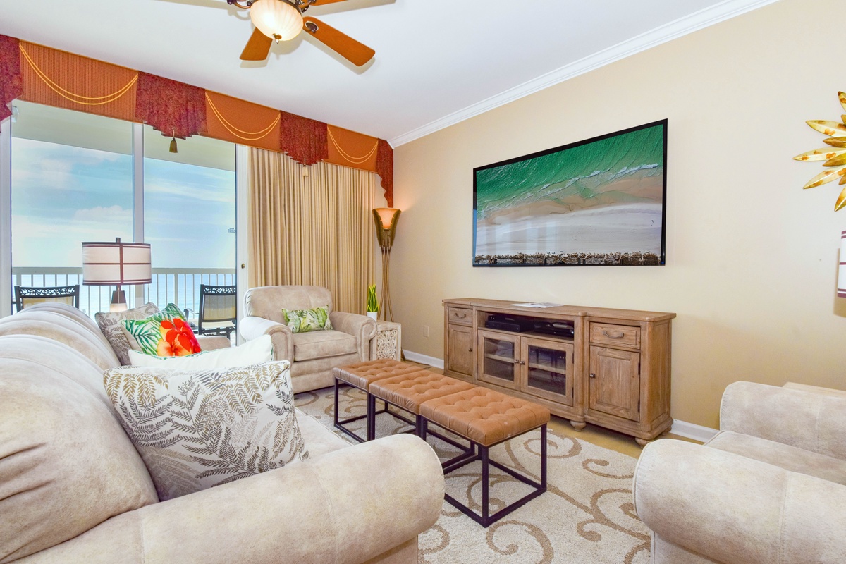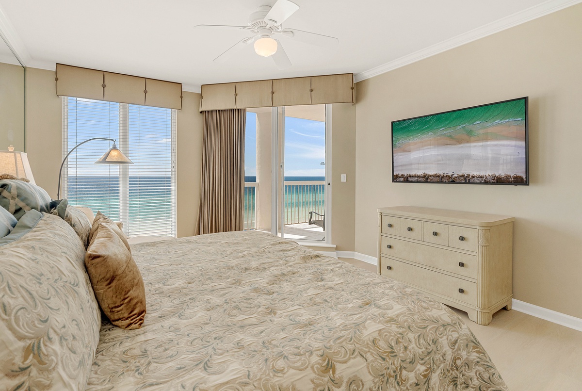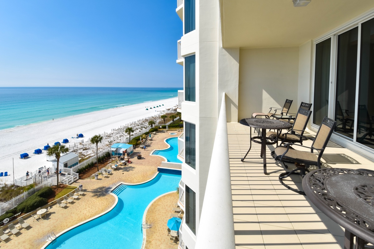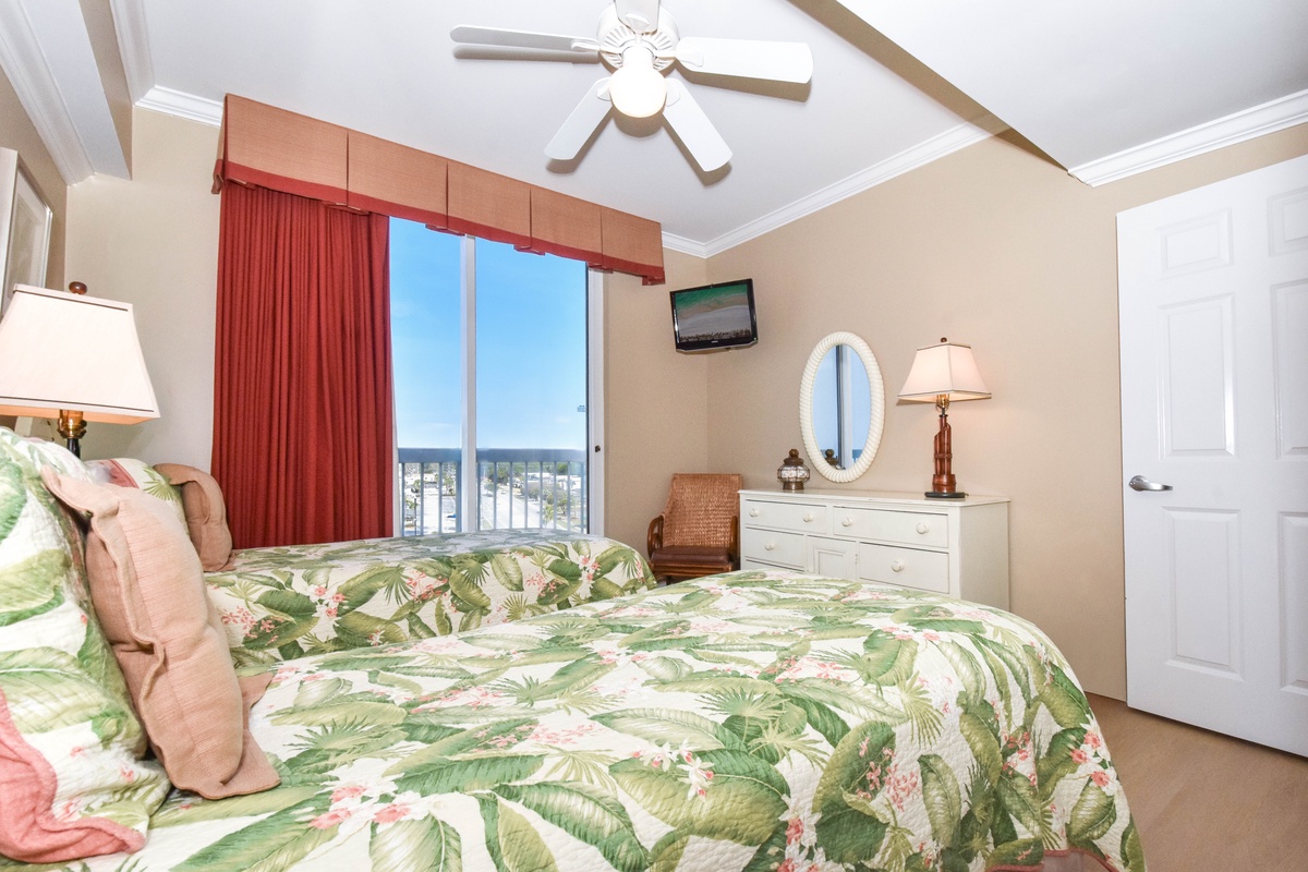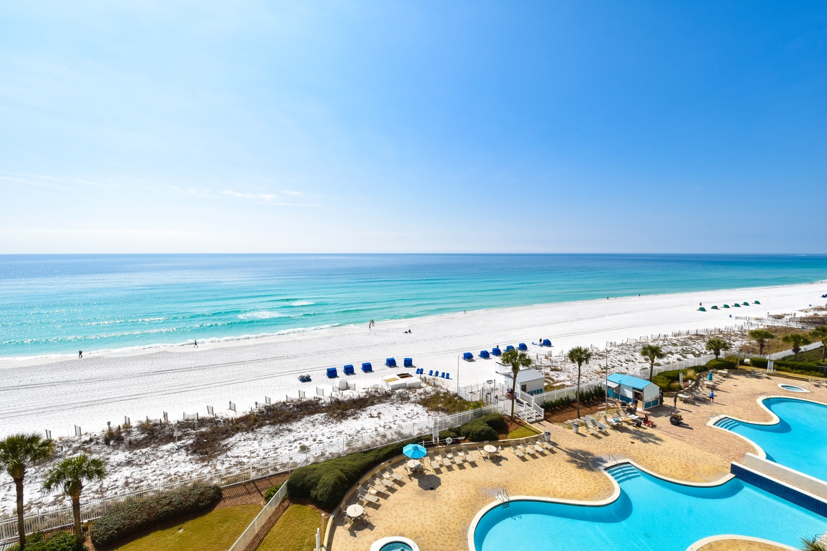 The master bedroom has a king bed, walk-in closet, flat-screen TV with Blu-Ray, DVD, and VHS players, and private access to the beachfront balcony. The master bathroom features a jetted bathtub, walk-in shower, and double vanity. The first guest bedroom has a king bed, a flat-screen HD-TV with a DVD player, and private access to the north balcony overlooking the greater Destin area. The second guest bedroom has two twin beds, a flat-screen HD-TV with a DVD player, and access to the north balcony. Just steps from both the second guest bedroom and living area is a full guest bathroom with a tub/shower combination.