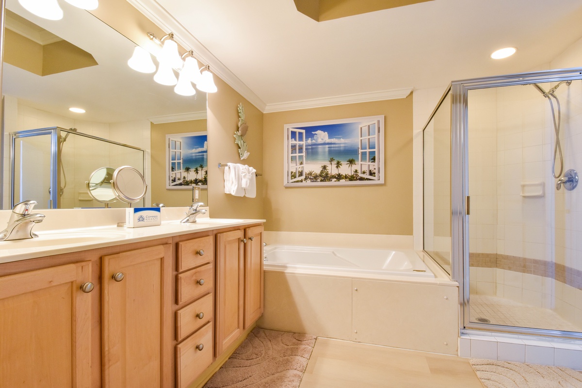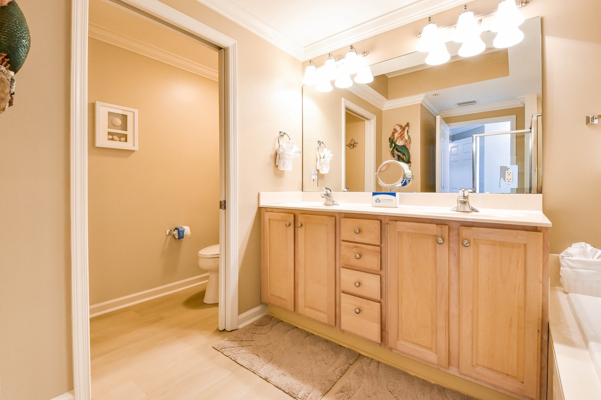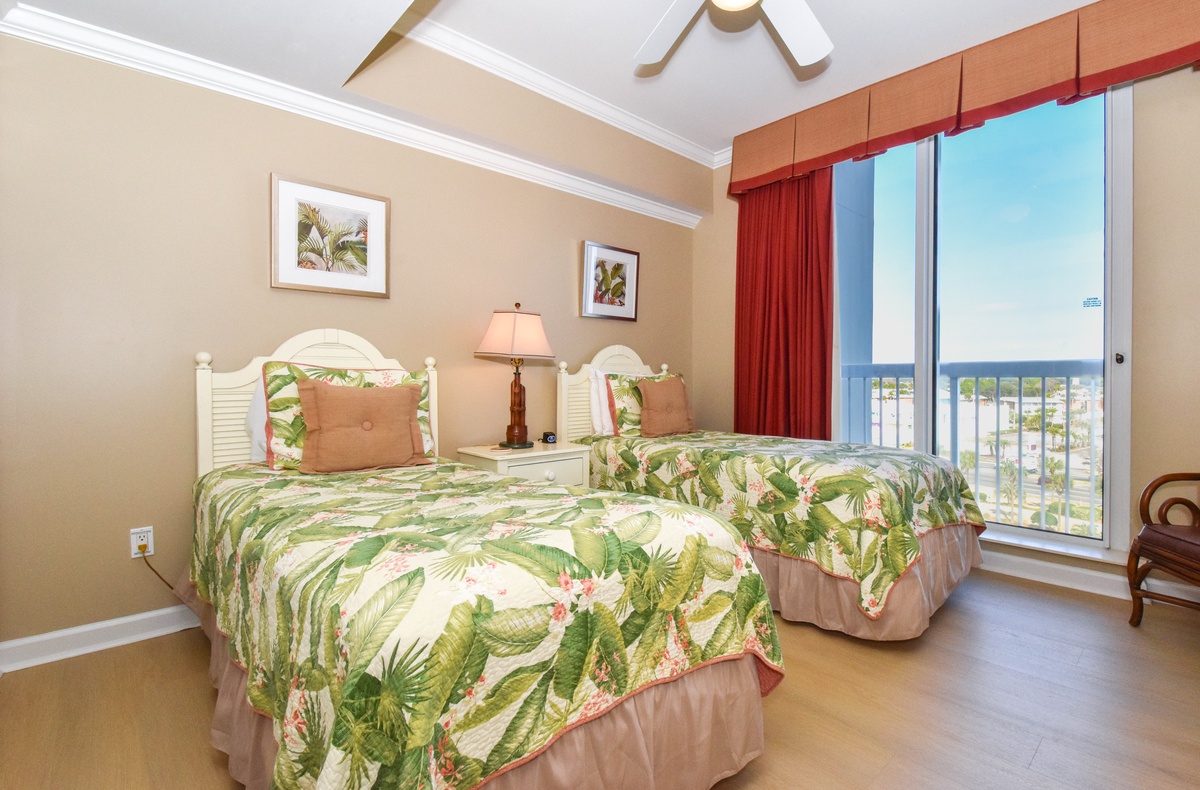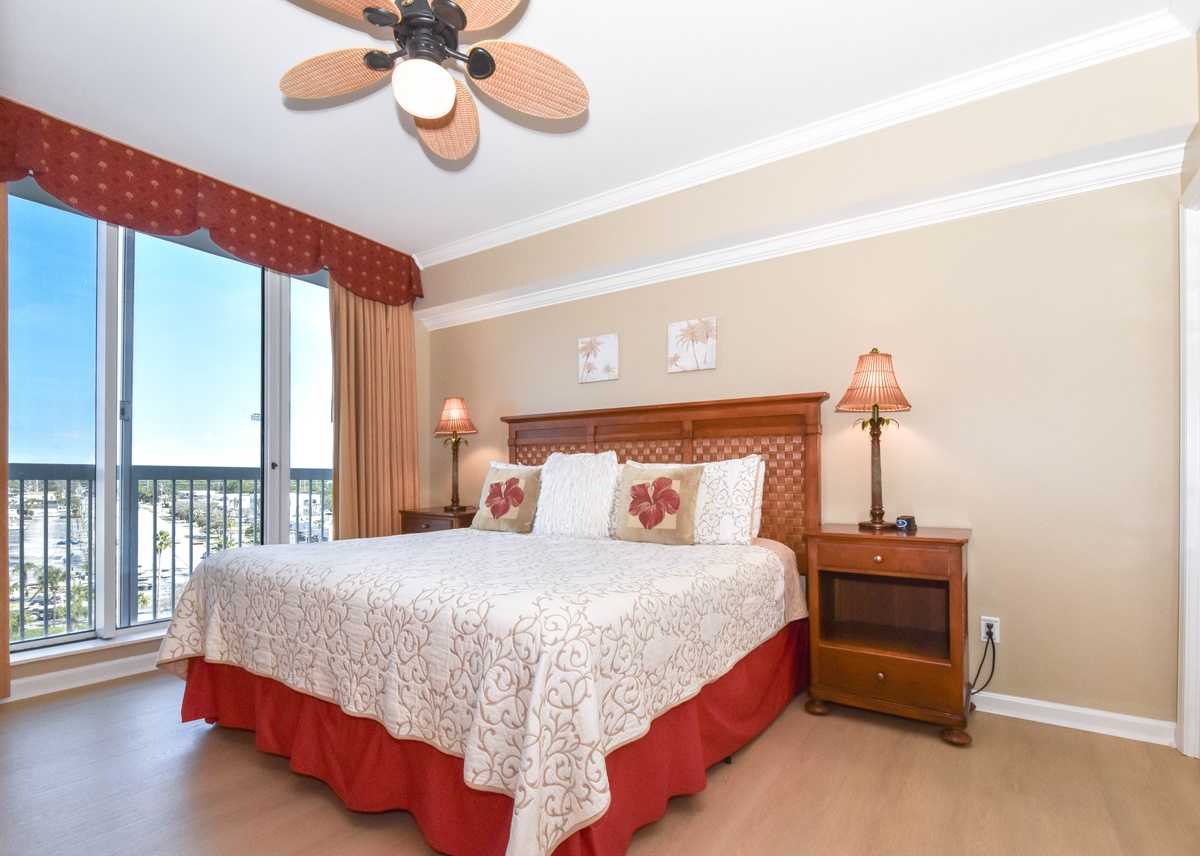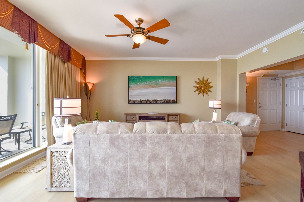 The master bedroom has a king bed, walk-in closet, flat-screen TV with Blu-Ray, DVD, and VHS players, and private access to the beachfront balcony. The master bathroom features a jetted bathtub, walk-in shower, and double vanity. The first guest bedroom has a king bed, a flat-screen HD-TV with a DVD player, and private access to the north balcony overlooking the greater Destin area. The second guest bedroom has two twin beds, a flat-screen HD-TV with a DVD player, and access to the north balcony. Just steps from both the second guest bedroom and living area is a full guest bathroom with a tub/shower combination.