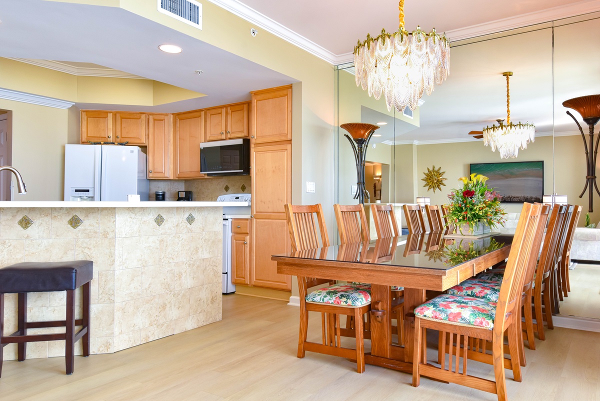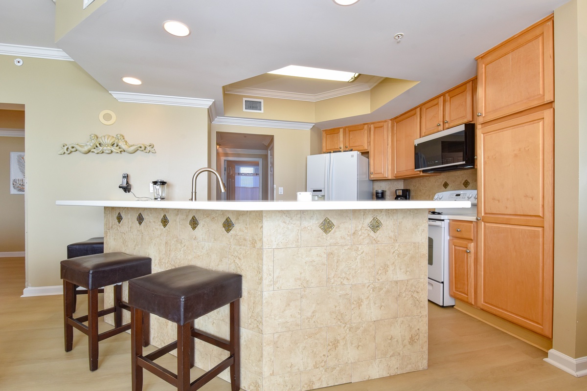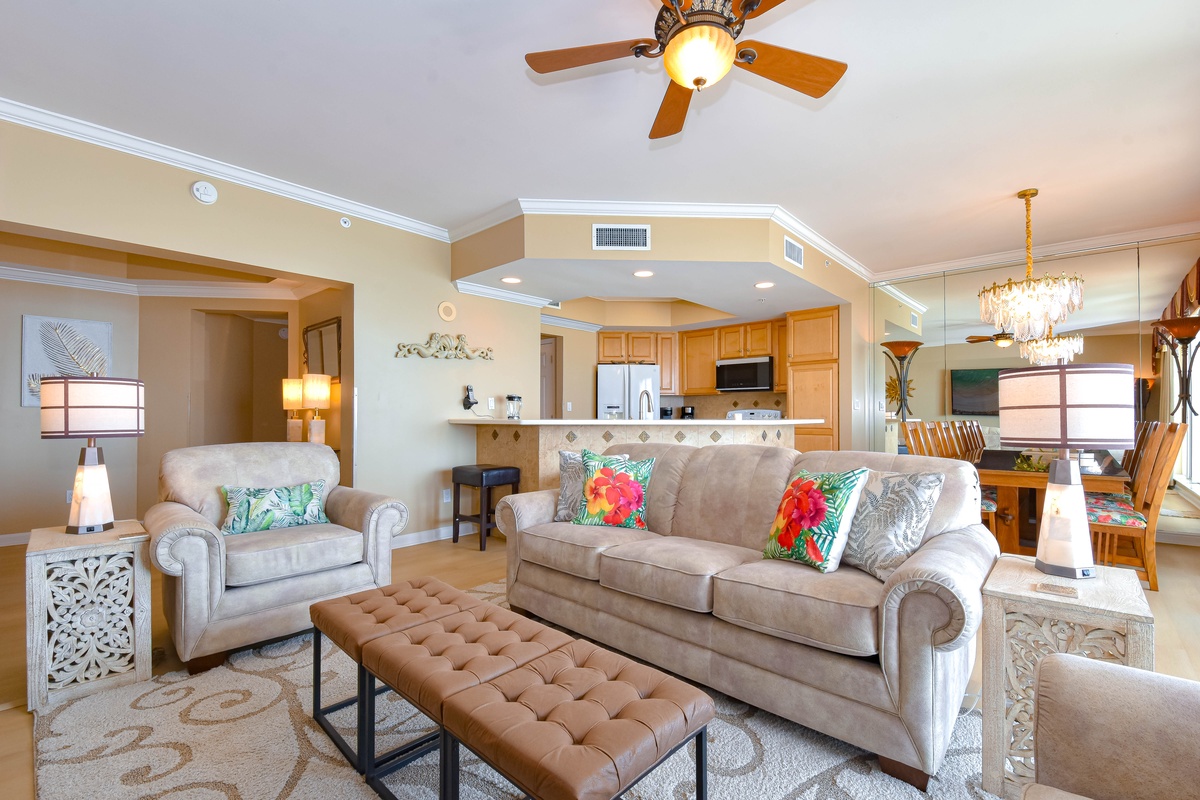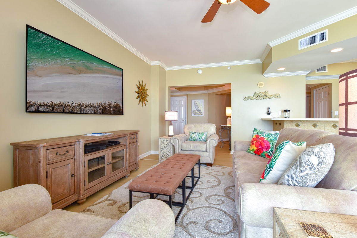 East 704 offers a warm, tropical feel and an inviting open-concept living area. You’ll find the perfect space for family and friends to relax together around the large flat-screen 4K-SUHD smart TV, Blu-Ray, DVD, and VHS players, and there's even a collection of movies to watch. Two chairs in the Living Area even convert to Twin Sleeper Chairs to accommodate larger parties. The south wall has floor-to-ceiling windows that open directly onto the furnished beachfront balcony. The dining area offers seating for six with three additional seats at the breakfast bar. The fully equipped kitchen features full-size appliances and includes all the cookware and dishware needed to create memorable meals together. For added convenience this condo offers secure WIFI.