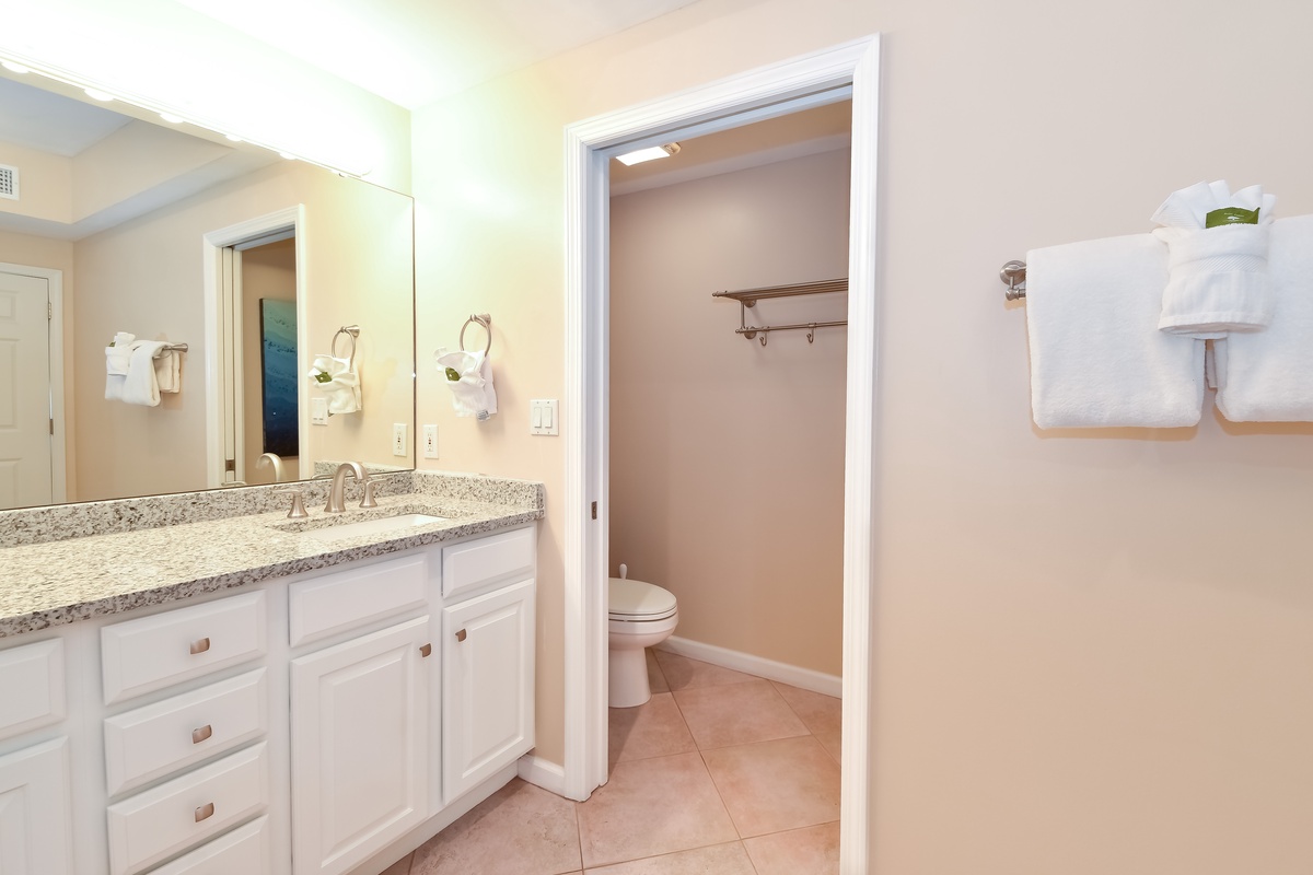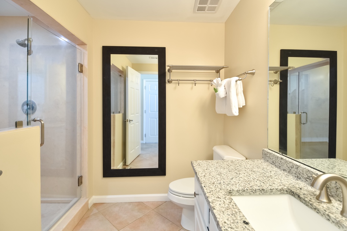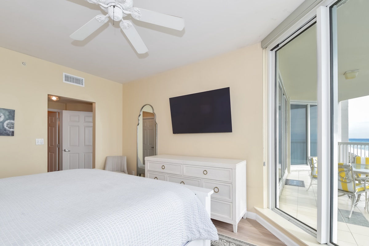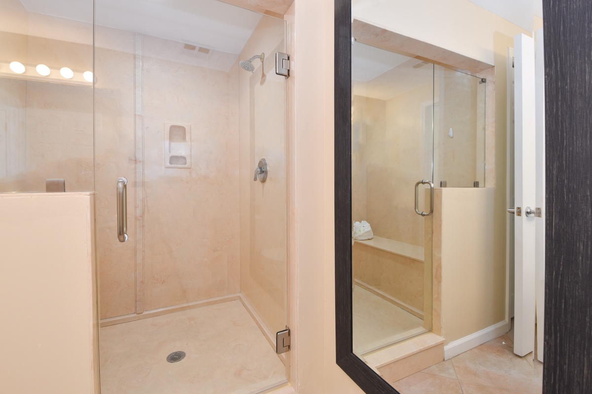 The master bedroom has a king bed, walk-in closet, flat-screen TV, and private access to the beachfront balcony. The master bathroom features a large jacuzzi bathtub, tiled walk-in shower with a built-in bench, and double vanity. The guest bedroom has a king bed, a flat-screen TV, and private access to the beachfront balcony. Just steps from both the guest bedroom and living area is a full guest bathroom with a walk-in shower.